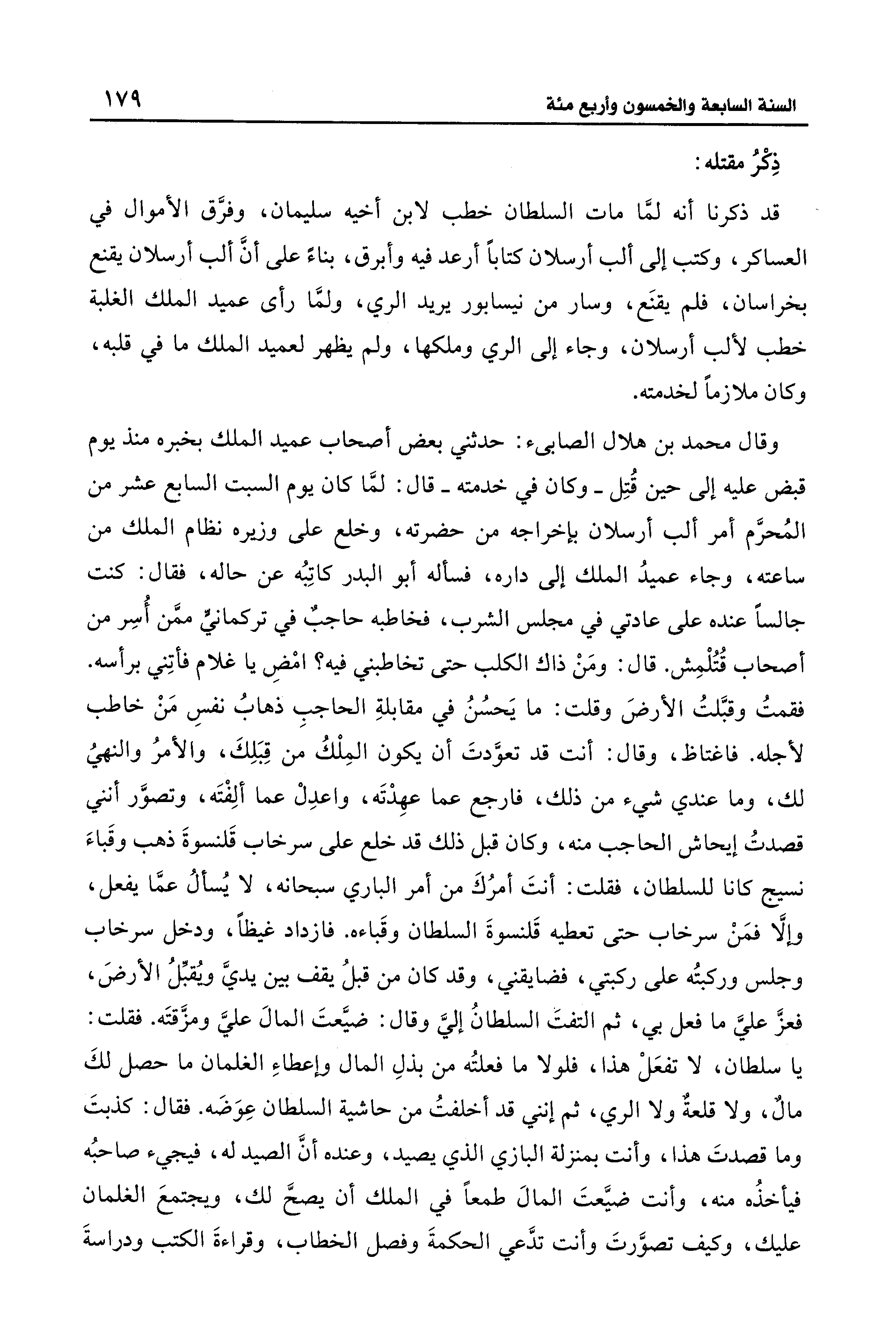 وقال محمد بن هلال الصابئ: حدثني بعض أصحاب عميد الملك بخبره منذ يوم قبض عليه إلى حين قُتِل -وكان في خدمته- قال: لمَّا كان يوم السبت السابع عشر من المُحرَّم أمر ألب أرسلان بإخراجه من حضرته، وخلع على وزيره نظام الملك من ساعته، وجاء عميدُ الملك إلى داره، فسأله أبو البدر كاتِبُه عن حاله، فقال: كنت جالسًا عنده على عادتي في مجلس الشرب، فخاطبه حاجبٌ في تركمانيٌ ممَّن أُسِر من أصحاب قُتُلْمِش. قال: ومَنْ ذاك الكلب حتى تخاطبني فيه؟ امْضِ يا غلام فأتِني برأسه. فقمتُ وقبَّلتُ الأرضَ وقلت: ما يَحسُنُ في مقابلةِ الحاجبِ ذهابُ نفسِ مَنْ خاطب لأجله. فاغتاظ، وقال: أنت قد تعوَّدتَ أن يكون المِلْكُ من قِبَلِكَ، والأمرُ والنهيُ لك، وما عندي شيء من ذلك، فارجع عما عهِدْتَه، واعدِلْ عما ألِفْتَه، وتصوَّر أنني قصدتُ إيحاش الحاجب منه، وكان قبل ذلك قد خلع على سرخاب قَلنسوةَ ذهب وقَباءَ نسيج كانا للسلطان، فقلت: أنتَ أمرُكَ من أمر الباري سبحانه، لا يُسألُ عمَّا يفعل، وإلَّا فمَنْ سرخاب حتى تعطيه قَلنسوةَ السلطان وقَباءه. فازداد غيظًا، ودخل سرخاب وجلس وركبتُه على ركبتي، فضايقني، وقد كان من قبلُ يقف بين يديَّ ويُقبِّلُ الأرضَ، فعزَّ عليَّ ما فعل بي، ثم التفت السلطانُ إليَّ وقال: ضيَّعتَ المال عليَّ ومزَّقتَه. فقلت: يا سلطان، لا تفعَلْ هذا، فلولا ما فعلتُه من بذلِ المال وإعطاءِ الغلمان ما حصل لكَ مالٌ، ولا قلعة ولا الري، ثم إنني قد أخلفتُ من حاشية السلطان عِوَضَه. فقال: كذبتَ وما قصدتَ هذا، وأنت بمنزلة البازي الذي يصيد، وعنده أنَّ الصيد له، فيجيء صاحبُه فيأخذُه منه، وأنت ضيَّعتَ المال طمعًا في الملك أن يصحَّ لك، ويجتمعَ الغلمان عليك، وكيف تصوَّرتَ وأنت تدَّعي الحكمةَ وفصل الخطاب، وقراءةَ الكتب ودراسةَ