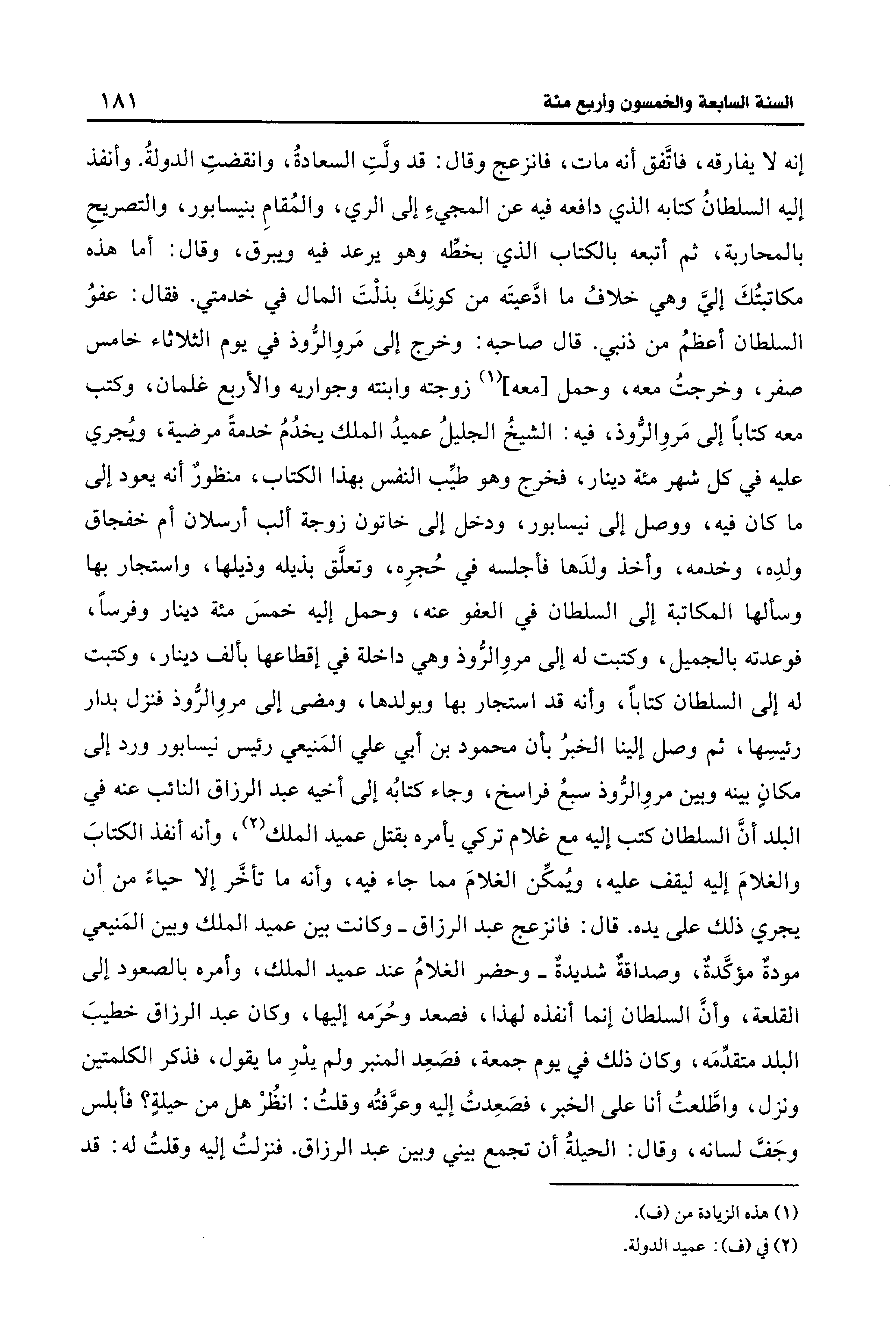 إنه لا يفارقه، فاتَّفق أنه مات، فانزعج وقال: قد ولَّتِ السعادةُ، وانقضتِ الدولةُ. وأنفذ إليه السلطانُ كتابه الذي دافعه فيه عن المجيءِ إلى الري، والمُقامِ بنيسابور، والتصريحِ بالمحاربة، ثم أتبعه بالكتاب الذي بخطِّه وهو يرعد فيه ويبرق، وقال: أما هذه مكاتبتُكَ إليَّ وهي خلافُ ما ادَّعيتَه من كونِكَ بذلْتَ المال في خدمتي. فقال: عفوُ السلطان أعظمُ من ذنبي. قال صاحبه: وخرج إلى مَروالرُّوذ في يوم الثلاثاء خامس صفر، وخرجتُ معه، وحمل [معه] (¬1) زوجته وابنته وجواريه والأربع غلمان، وكتب معه كتابًا إلى مَروالرُّوذ، فيه: الشيخُ الجليلُ عميدُ الملك يخدُمُ خدمةً مرضية، ويُجري عليه في كل شهر مئة دينار، فخرج وهو طيِّب النفس بهذا الكتاب، منظورٌ أنه يعود إلى ما كان فيه، ووصل إلى نيسابور، ودخل إلى خاتون زوجة ألب أرسلان أم خفجاق ولدِه، وخدمه، وأخذ ولدَها فأجلسه في حُجرِه، وتعلَّق بذيله وذيلها، واستجار بها وسألها المكاتبة إلى السلطان في العفو عنه، وحمل إليه خمسَ مئة دينار وفرسًا، فوعدته بالجميل، وكتبت له إلى مروالرُّوذ وهي داخلة في إقطاعها بألف دينار، وكتبت له إلى السلطان كتابًا، وأنه قد استجار بها وبولدها، ومضى إلى مروالرُّوذ فنزل بدار رئيسِها، ثم وصل إلينا الخبرُ بأن محمود بن أبي علي المَنيعي رئيس نيسابور ورد إلى مكانٍ بينه وبين مروالرُّوذ سبعُ فراسخ، وجاء كتابُه إلى أخيه عبد الرزاق النائب عنه في البلد أنَّ السلطان كتب إليه مع غلام تركي يأمره بقتل عميد الملك (¬2)، وأنه أنفذ الكتابَ والغلامَ إليه ليقف عليه، ويُمكِّن الغلامَ مما جاء فيه، وأنه ما تأخَّر إلا حياءً من أن يجري ذلك على يده. قال: فانزعج عبد الرزاق -وكانت بين عميد الملك وبين المَنيعي مودةٌ مؤكَّدةٌ، وصداقة شديدةٌ- وحضر الغلامُ عند عميد الملك، وأمره بالصعود إلى القلعة، وأنَّ السلطان إنما أنفذه لهذا، فصعد وحُرَمه إليها، وكان عبد الرزاق خطيبَ البلد متقدِّمَه، وكان ذلك في يوم جمعة، فصَعِد المنبر ولم يدْرِ ما يقول، فذكر الكلمتين ونزل، واطَّلعتُ أنا على الخبر، فصَعِدتُ إليه وعرَّفتُه وقلتُ: انظُرْ هل من حيلةٍ؟ فأبلس وجَفَّ لسانه، وقال: الحيلةُ أن تجمع بيني وبين عبد الرزاق. فنزلتُ إليه وقلتُ له: قد