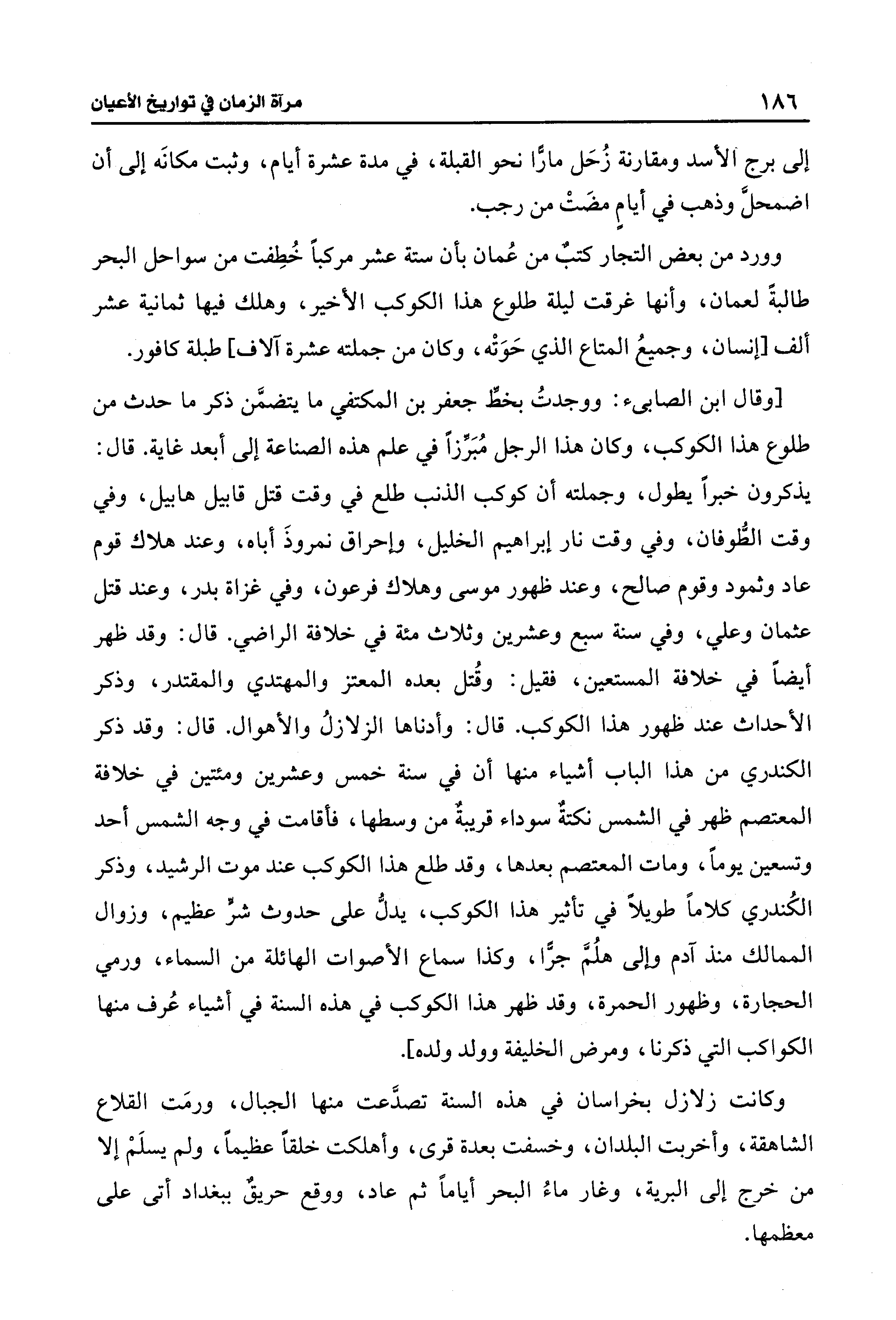 [وقال ابن الصابئ: ووجدتُ بخطِّ جعفر بن المكتفي ما يتضمَّن ذكر ما حدث من طلوع هذا الكوكب، وكان هذا الرجل مُبَرِّزًا في علم هذه الصناعة إلى أبعد غاية. قال: يذكرون خبرًا يطول، وجملته أن كوكب الذنب طلع في وقت قتل قابيل هابيل، وفي وقت الطوفان، وفي وقت نار إبراهيم الخليل، وإحراق نمروذَ أباه، وعند هلاك قوم عاد وثمود وقوم صالح، وعند ظهور موسى وهلاك فرعون، وفي غزاة بدر، وعند قتل عثمان وعلي، وفي سنة سبع وعشرين وثلاث مئة في خلافة الراضي. قال: وقد ظهر أيضًا في خلافة المستعين، فقيل: وقُتل بعده المعتز والمهتدي والمقتدر، وذكر الأحداث عند ظهور هذا الكوكب. قال: وأدناها الزلازلُ والأهوال. قال: وقد ذكر الكندري من هذا الباب أشياء منها أن في سنة خمس وعشرين ومئتين في خلافة المعتصم ظهر في الشمس نكتةٌ سوداء قريبة من وسطها، فأقامت في وجه الشمس أحد وتسعين يومًا، ومات المعتصم بعدها، وقد طلع هذا الكوكب عند موت الرشيد، وذكر الكُندري كلامًا طويلًا في تأثير هذا الكوكب، يدلُّ على حدوث شرٍّ عظيم، وزوال الممالك منذ آدم وإلى هلُمَّ جرًّا، وكذا سماع الأصوات الهائلة من السماء، ورمي الحجارة، وظهور العمرة، وقد ظهر هذا الكوكب في هذه السنة في أشياء عُرف منها الكواكب التي ذكرنا، ومرض الخليفة وولد ولده].