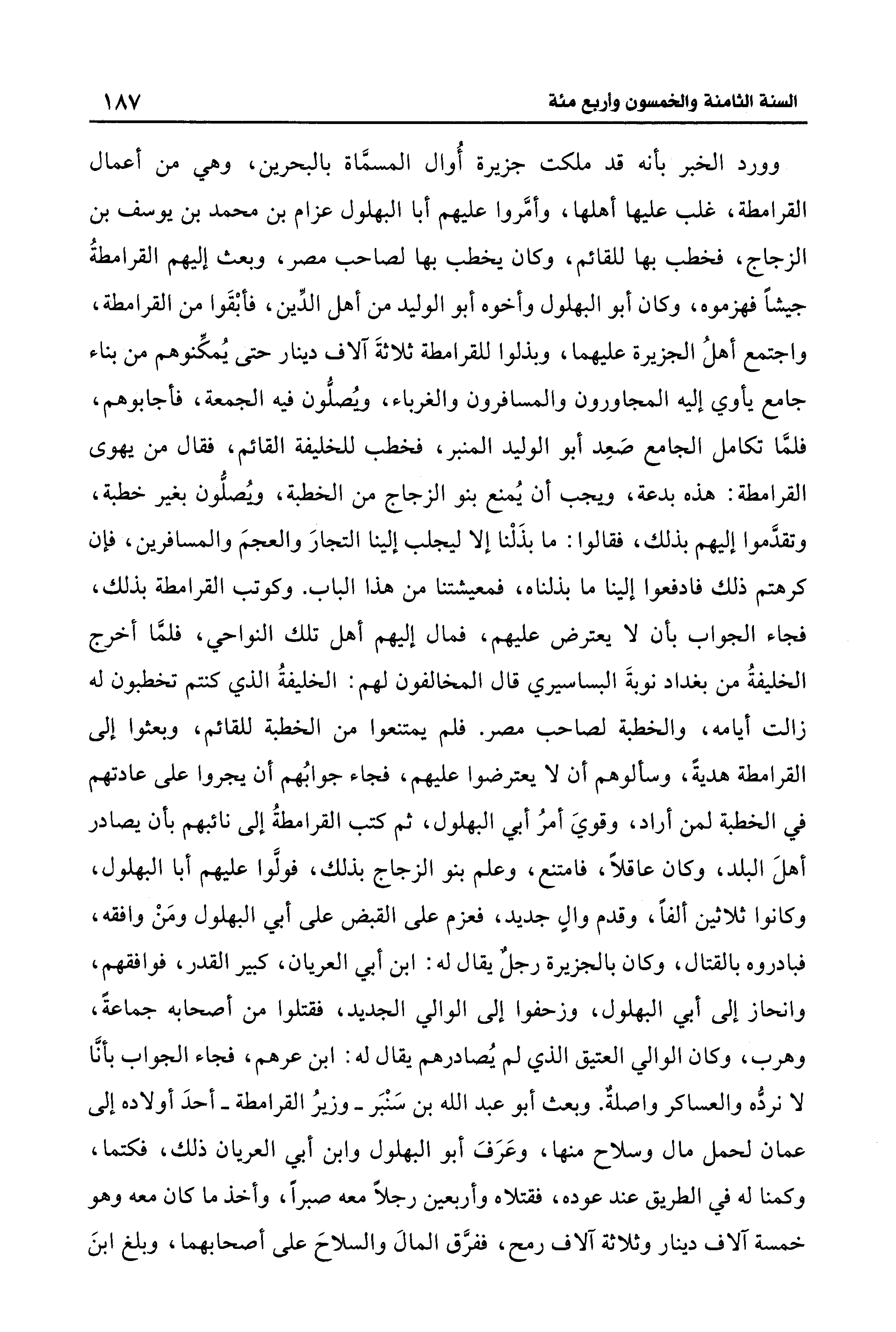 وورد الخبر بأنه قد ملكت جزيرة أُوال المسمَّاة بالبحرين، وهي من أعمال القرامطة، غلب عليها أهلها، وأمَّروا عليهم أبا البهلول عزام بن محمد بن يوسف بن الزجاج، فخطب بها للقائم، وكان يخطب بها لصاحب مصر، وبعث إليهم القرامطةُ جيشًا فهزموه، وكان أبو البهلول وأخوه أبو الوليد من أهل الدِّين، فأبْقَوا من القرامطة، واجتمع أهلُ الجزيرة عليهما، وبذلوا للقرامطة ثلاثةَ آلاف دينار حتى يُمكِّنوهم من بناء جامع يأوي إليه المجاورون والمسافرون والغرباء، ويُصلُّون فيه الجمعة، فأجابوهم، فلمَّا تكامل الجامع صَعِد أبو الوليد المنبر، فخطب للخليفة القائم، فقال من يهوى القرامطة: هذه بدعة، ويجب أن يُمنع بنو الزجاج من الخطبة، ويُصلُّون بغير خطبة، وتقدَّموا إليهم بذلك، فقالوا: ما بذَلْنا إلا ليجلب إلينا التجارَ والعجمَ والمسافرين، فإن كرهتم ذلك فادفعوا إلينا ما بذلناه، فمعيشتنا من هذا الباب. وكوتب القرامطة بذلك، فجاء الجواب بأن لا يعترض عليهم، فمال إليهم أهل تلك النواحي، فلمَّا أخرج الخليفةُ من بغداد نوبةَ البساسيري قال المخالفون لهم: الخليفةُ الذي كنتم تخطبون له زالت أيامه، والخطبة لصاحب مصر. فلم يمتنعوا من الخطبة للقائم، وبعثوا إلى القرامطة هديةً، وسألوهم أن لا يعترضوا عليهم، فجاء جوابُهم أن يجروا على عادتهم في الخطبة لمن أراد، وقويَ أمرُ أبي البهلول، ثم كتب القرامطةُ إلى نائبهم بأن يصادر أهلَ البلد، وكان عاقلًا، فامتنع، وعلم بنو الزجاج بذلك، فولَّوا عليهم أبا البهلول، وكانوا ثلاثين ألفًا، وقدم والٍ جديد، فعزم على القبض على أبي البهلول ومَنْ وافقه، فبادروه بالقتال، وكان بالجزيرة رجلٌ يقال له: ابن أبي العريان، كبير القدر، فوافقهم، وانحاز إلى أبي البهلول، وزحفوا إلى الوالي الجديد، فقتلوا من أصحابه جماعةً، وهرب، وكان الوالي العتيق الذي لم يُصادرهم يقال له: ابن عرهم، فجاء الجواب بأنَّا لا نردُّه والعساكر واصلةٌ. وبعث أبو عبد الله بن سَنْبَر -وزيرُ القرامطة- أحدَ أولاده إلى عمان لحمل مال وسلاح منها، وعَرَفَ أبو البهلول وابن أبي العريان ذلك، فكتما، وكمنا له في الطريق عند عوده، فقتلاه وأربعين رجلًا معه صبرًا، وأخذ ما كان معه وهو خمسة آلاف دينار وثلاثة آلاف رمح، ففرَّق المال والسلاحَ على أصحابهما، وبلغ ابنَ