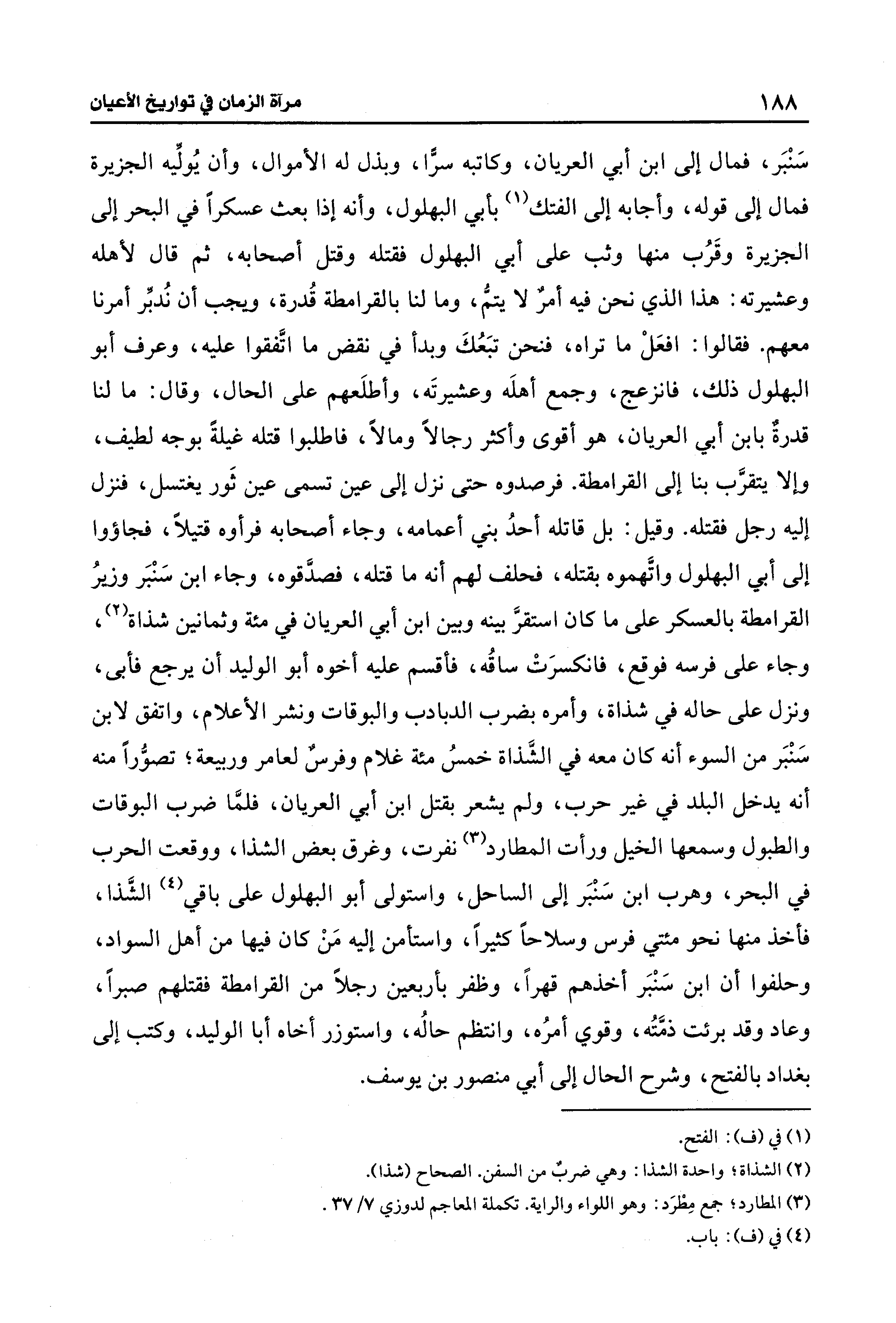 سَنْبَر، فمال إلى ابن أبي العريان، وكاتبه سرًّا، وبذل له الأموال، وأن يُولِّيه الجزيرة فمال إلى قوله، وأجابه إلى الفتك (¬1) بأبي البهلول، وأنه إذا بعث عسكرًا في البحر إلى الجزيرة وقَرُب منها وثب على أبي البهلول فقتله وقتل أصحابه، ثم قال لأهله وعشيرته: هذا الذي نحن فيه أمرٌ لا يتمُّ، وما لنا بالقرامطة قُدرة، ويجب أن نُدبِّر أمرنا معهم. فقالوا: افعَلْ ما تراه، فنحن تبَعُكَ وبدأ في نقض ما اتَّفقوا عليه، وعرف أبو البهلول ذلك، فانزعج، وجمع أهلَه وعشيرتَه، وأطلَعهم على الحال، وقال: ما لنا قدرةٌ بابن أبي العريان، هو أقوى وأكثر رجالًا ومالًا، فاطلبوا قتله غيلةً بوجه لطيف، وإلا يتقرَّب بنا إلى القرامطة. فرصدوه حتى نزل إلى عين تسمى عين ثَور يغتسل، فنزل إليه رجل فقتله. وقيل: بل قاتله أحدُ بني أعمامه، وجاء أصحابه فرأوه قتيلًا، فجاؤوا إلى أبي البهلول واتَّهموه بقتله، فحلف لهم أنه ما قتله، فصدَّقوه، وجاء ابن سَنْبَر وزيرُ القرامطة بالعسكر على ما كان استقرَّ بينه وبين ابن أبي العريان في مئة وثمانين شذاة (¬2)، وجاء على فرسه فوقع، فانكسرَتْ ساقُه، فأقسم عليه أخوه أبو الوليد أن يرجع فأبى، ونزل على حاله في شذاة، وأمره بضرب الدبادب والبوقات ونشر الأعلام، واتفق لابن سَنْبَر من السوء أنه كان معه في الشَّذاة خمسُ مئة غلام وفرسٌ لعامر وربيعة؛ تصوُّرًا منه أنه يدخل البلد في غير حرب، ولم يشعر بقتل ابن أبي العريان، فلمَّا ضرب البوقات والطبول وسمعها الخيل ورأت المطارد (¬3) نفرت، وغرق بعض الشذا، ووقعت الحرب في البحر، وهرب ابن سَنْبَر إلى الساحل، واستولى أبو البهلول على باقي (¬4) الشَّذا، فأخذ منها نحو مئتي فرس وسلاحًا كثيرًا، واستأمن إليه مَنْ كان فيها من أهل السواد، وحلفوا أن ابن سَنْبَر أخذهم قهرًا، وظفر بأربعين رجلًا من القرامطة فقتلهم صبرًا، وعاد وقد برئت ذمَّتُه، وقوي أمرُه، وانتظم حالُه، واستوزر أخاه أبا الوليد، وكتب إلى بغداد بالفتح، وشرح الحال إلى أبي منصور بن يوسف.