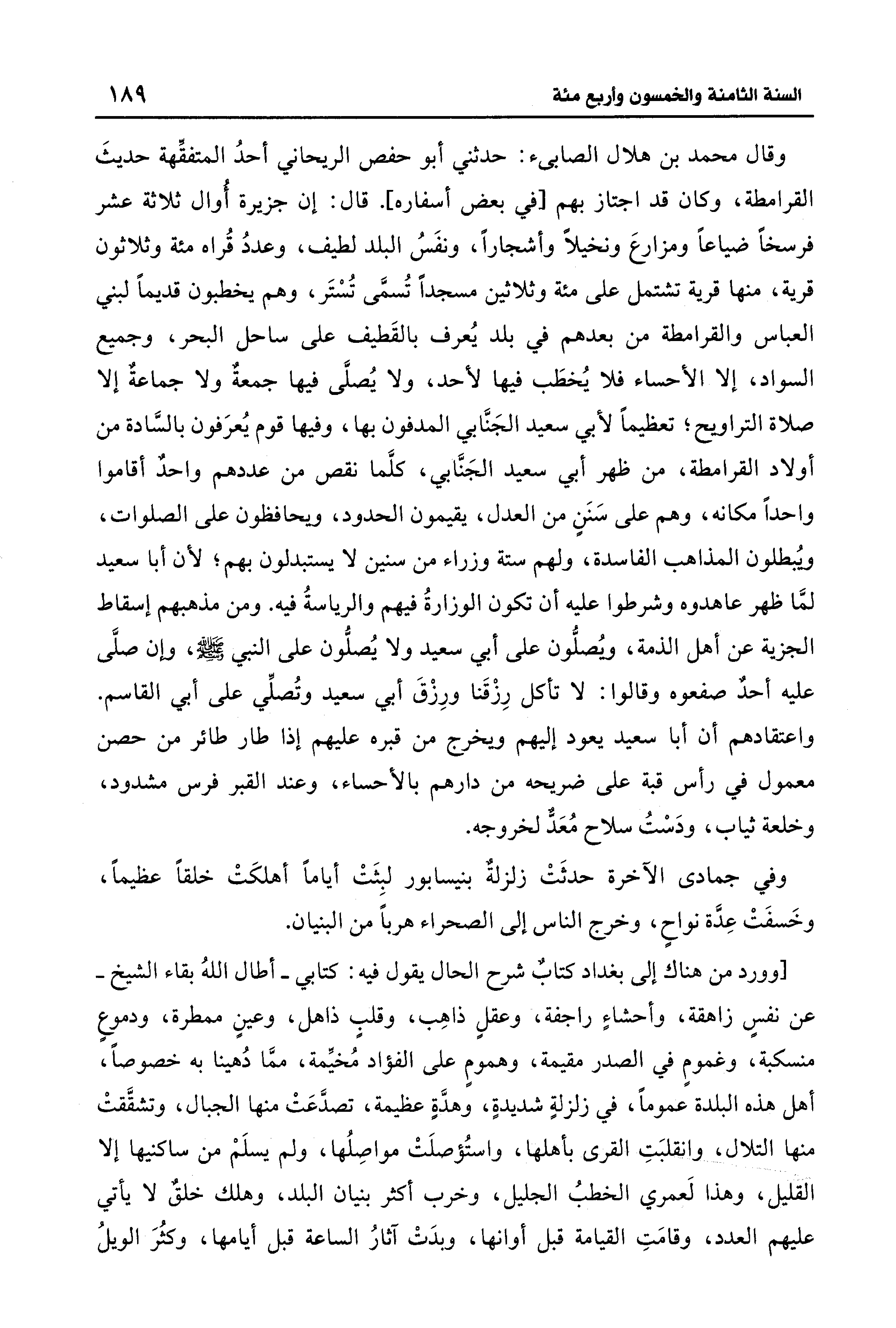 [وورد من هناك إلى بغداد كتابٌ شرح الحال يقول فيه: كتابي -أطال اللهُ بقاء الشيخ- عن نفسٍ زاهقة، وأحشاءٍ راجفة، وعقلٍ ذاهِب، وقلبٍ ذاهل، وعينٍ ممطرة، ودموعٍ منسكبة، وغمومٍ في الصدر مقيمة، وهمومٍ على الفؤاد مُخيِّمة، ممَّا دُهينا به خصوصًا، أهل هذه البلدة عمومًا، في زلزلةٍ شديدةٍ، وهدَّةٍ عظيمة، تصدَّعَتْ منها الجبال، وتشقَّقتْ منها التلال، وانقلبَتِ القرى بأهلها، واستُؤصلَتْ مواصِلُها, ولم يسلَمْ من ساكنيها إلا القليل، وهذا لَعمري الخطبُ الجليل، وخرب أكثر بنيان البلد، وهلك خلقٌ لا يأتي عليهم العدد، وقامَتِ القيامة قبل أوانها، وبدَتْ آثارُ الساعة قبل أيامها، وكثُرَ الويلُ