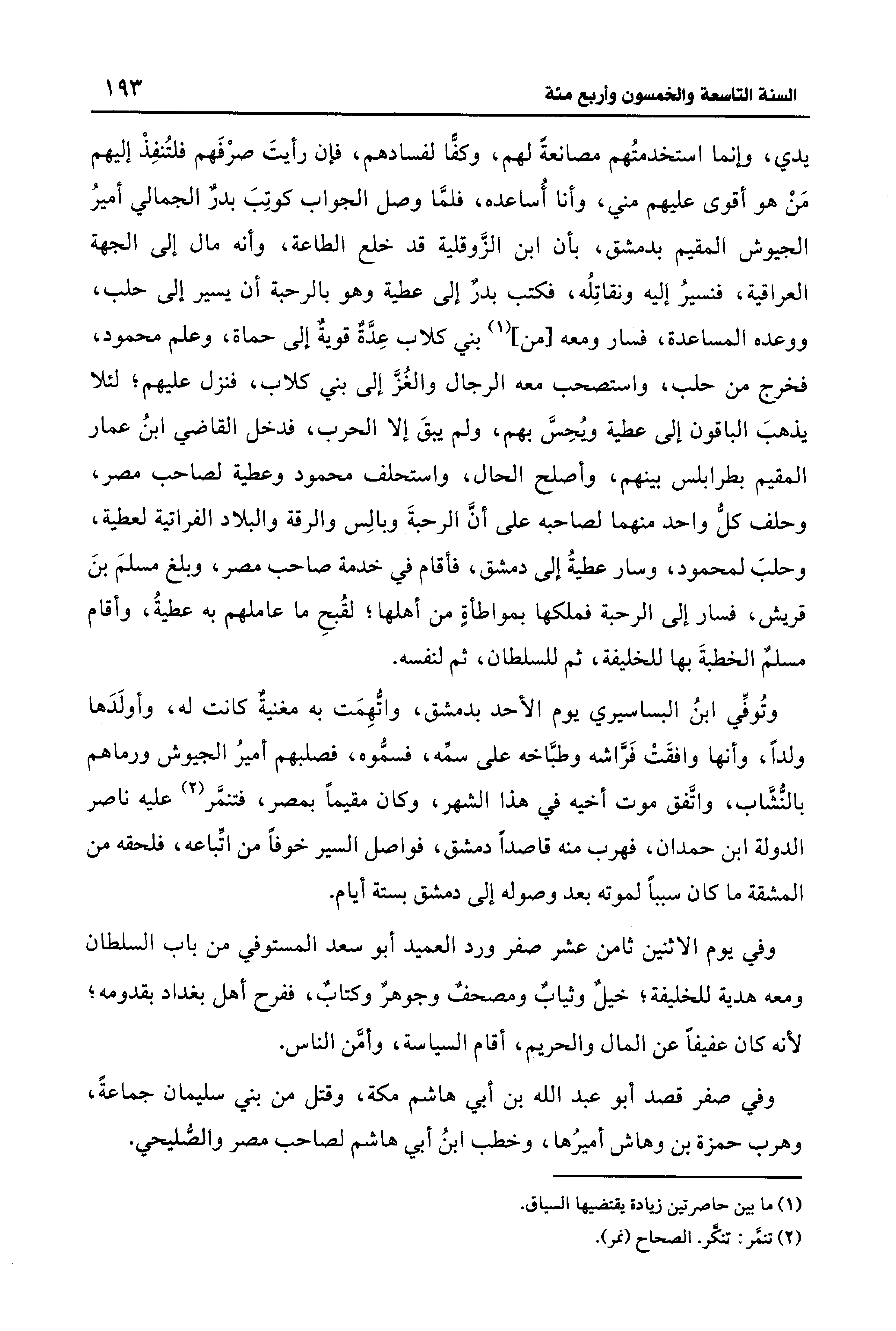وتُوفِّي ابنُ البساسيري يوم الأحد بدمشق، واتُّهِمَت به مغنيةٌ كانت له، وأولَدَها ولدًا، وأنها وافقَتْ فَرَّاشه وطبَّاخه على سمِّه، فسمُّوه، فصلبهم أميرُ الجيوش ورماهم بالنُّشَّاب، واتَّفق موت أخيه في هذا الشهر، وكان مقيمًا بمصر، فتنمَّر (¬2) عليه ناصر الدولة ابن حمدان، فهرب منه قاصدًا دمشق، فواصل السير خوفًا من اتباعه، فلحقه من المشقة ما كان سببًا لموته بعد وصوله إلى دمشق بستة أيام.