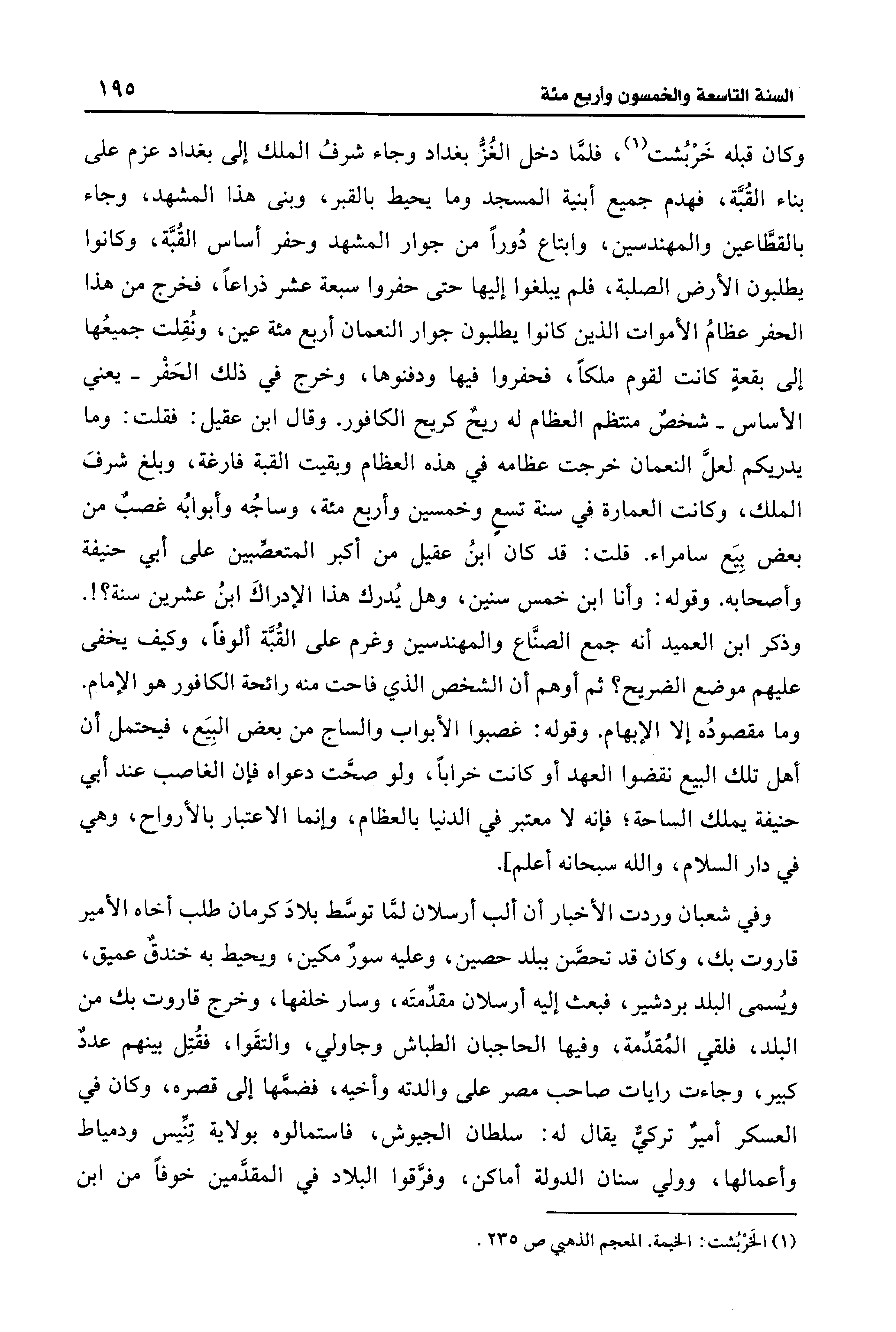 وكان قبله خَرْبُشت (¬1)، فلمَّا دخل الغُزُّ بغداد وجاء شرفُ الملك إلى بغداد عزم على بناء القُبَّة، فهدم جميع أبنية المسجد وما يحيط بالقبر، وبنى هذا المشهد، وجاء بالقطَّاعين والمهندسين، وابتاع دُورًا من جوار المشهد وحفر أساس القُبَّة، وكانوا يطلبون الأرض الصلبة، فلم يبلغوا إليها حتى حفروا سبعة عشر ذراعًا، فخرج من هذا الحفر عظامُ الأموات الذين كانوا يطلبون جوار النعمان أربع مئة عين، ونُقِلت جميعُها إلى بقعةٍ كانت لقوم ملكًا، فحفروا فيها ودفنوها، وخرج في ذلك الحَفْر -يعني الأساس- شخصٌ منتظم العظام له ريحٌ كريح الكافور. وقال ابن عقيل: فقلت: وما يدريكم لعلَّ النعمان خرجت عظامه في هذه العظام وبقيت القبة فارغة، وبلغ شرفَ الملك، وكانت العمارة في سنة تسعٍ وخمسين وأربع مدّة، وساجُه وأبوابُه غصبٌ من بعض بِيَع سامراء. قلت: قد كان ابنُ عقيل من أكبر المتعصِّبين على أبي حنيفة وأصحابه. وقوله: وأنا ابن خمس سنين، وهل يُدرك هذا الإدراكَ ابنُ عشرين سنة؟ ! . وذكر ابن العميد أنه جمع الصنَّاع والمهندسين وغرم على القُبَّة ألوفًا، وكيف يخفى عليهم موضع الضريح؟ ثم أوهم أن الشخص الذي فاحت منه رائحة الكافور هو الإمام. وما مقصودُه إلا الإبهام. وقوله: غصبوا الأبواب والساج من بعض البِيَع، فيحتمل أن أهل تلك البيع نقضوا العهد أو كانت خرابًا، ولو صحَّت دعواه فإن الغاصب عند أبي حنيفة يملك الساحة؛ فإنه لا معتبر في الدنيا بالعظام، وإنما الاعتبار بالأرواح، وهي في دار السلام، والله سبحانه أعلم].