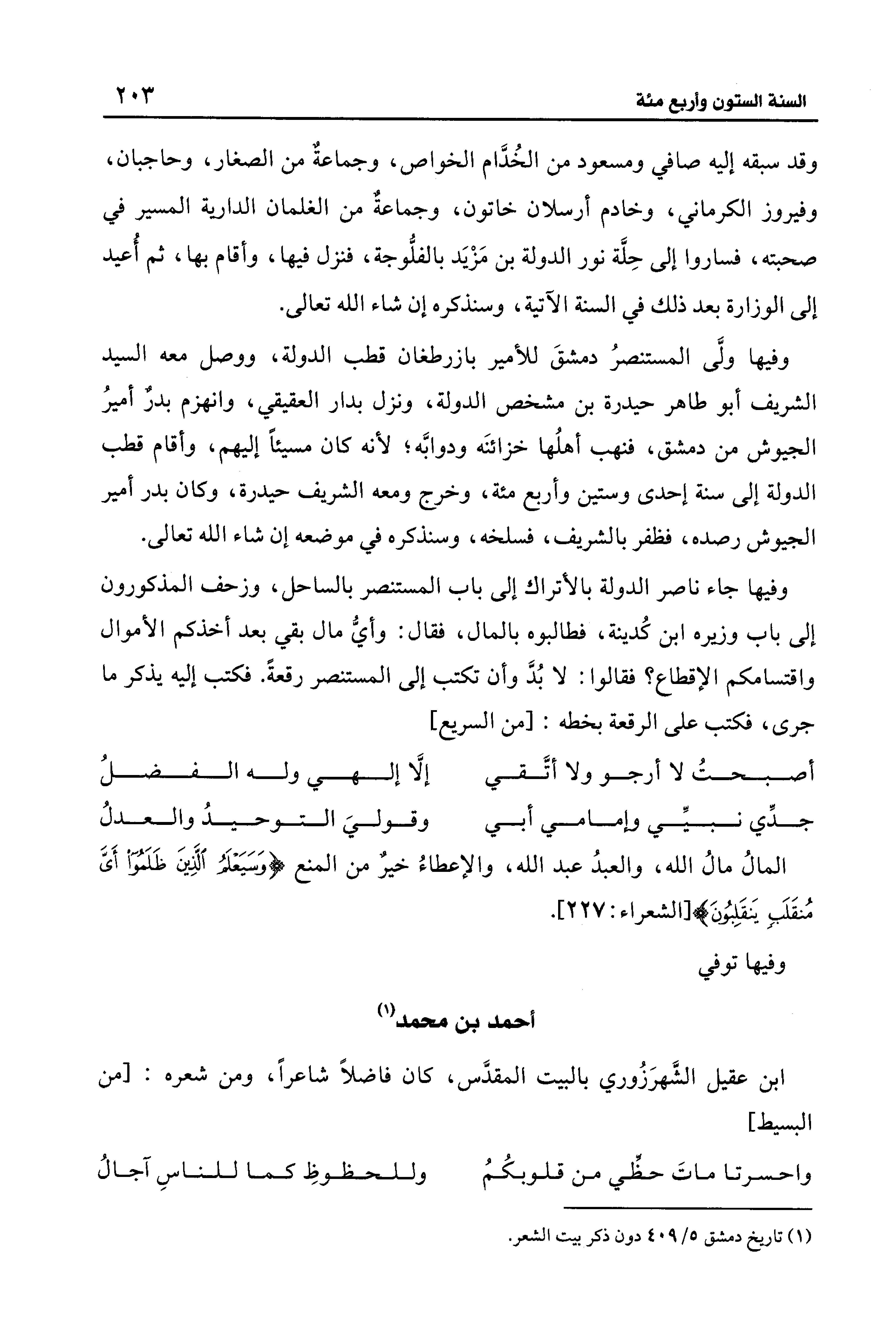 وفيها جاء ناصر الدولة بالأتراك إلى باب المستنصر بالساحل، وزحف المذكررون إلى باب وزيره ابن كُدينة، فطالبوه بالمال، فقال: وأيُّ مال بقي بعد أخذكم الأموال واقتسامكم الإقطاع؟ فقالوا: لا بُدَّ وأن تكتب إلى المستنصر رقعةً. فكتب إليه يذكر ما جرى، فكتب على الرقعة بخطه: [من السريع]