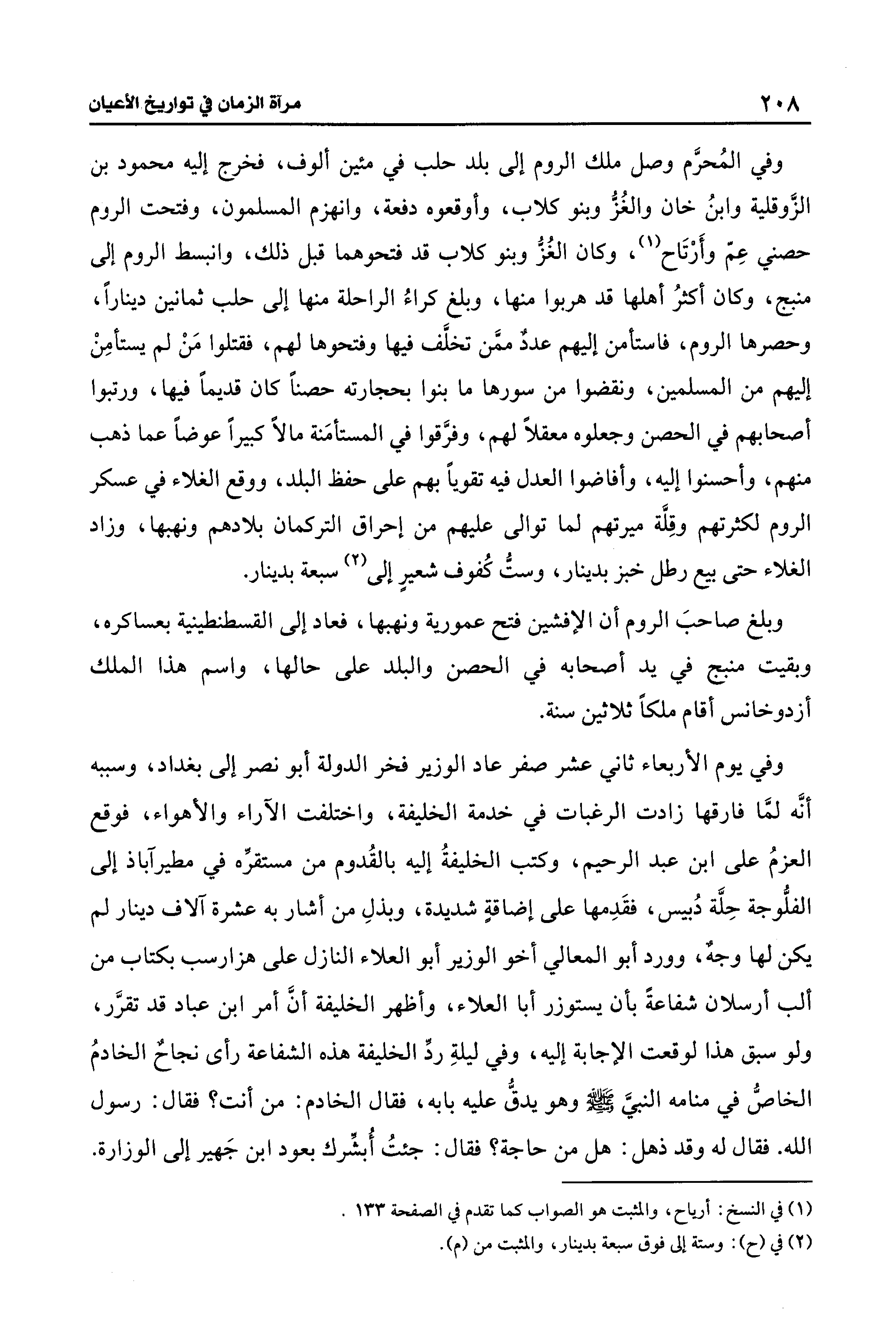 وفي المُحرَّم وصل ملك الروم إلى بلد حلب في مئين ألوف، فخرج إليه محمود بن الزَّوقلية وابنُ خان والغُزُّ وبنو كلاب، وأوقعوه دفعة، وانهزم المسلمون، وفتحت الروم حصني عِمّ وأَرْتَاح (¬1)، وكان الغُزُّ وبنو كلاب قد فتحوهما قبل ذلك، وانبسط الروم إلى منبج، وكان أكثرُ أهلها قد هربوا منها، وبلغ كراءُ الراحلة منها إلى حلب ثمانين دينارًا، وحصرها الروم، فاستأمن إليهم عددٌ ممَّن تخلَّف فيها وفتحوها لهم، فقتلوا مَنْ لم يستأمِنْ إليهم من المسلمين، ونقضوا من سورها ما بنوا بحجارته حصنًا كان قديمًا فيها، ورتبوا أصحابهم في الحصين وجعلوه معقلًا لهم، وفرَّقوا في المستأمَنة مالًا كبيرًا عوضًا عما ذهب منهم، وأحسنوا إليه، وأفاضوا العدل فيه تقويًا بهم على حفظ البلد، ووقع الغلاء في عسكر الروم لكثرتهم وقِلَّة ميرتهم لما توالى عليهم من إحراق التركمان بلادهم ونهبها، وزاد الغلاء حتى بيع رطل خبز بدينار، وستُّ كُفوف شعيرٍ إلى (¬2) سبعة بدينار.