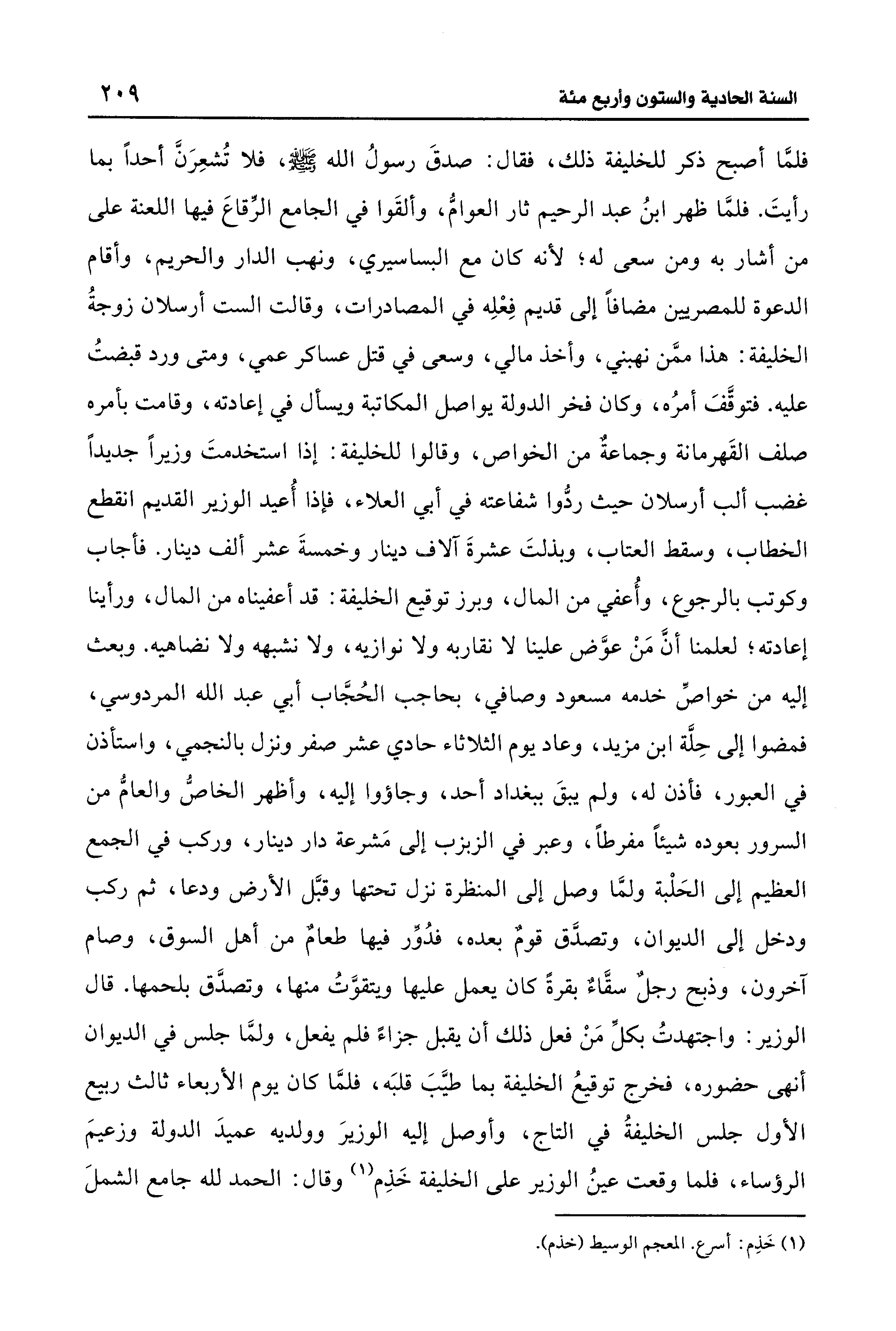 فلمَّا أصبح ذكر للخليفة ذلك، فقال: صدقَ رسولُ الله - صلى الله عليه وسلم -، فلا تُشعِرَنَّ أحدًا بما رأيتَ. فلمَّا ظهر ابنُ عبد الرحيم ثار العوامُّ، وألقَوا في الجامع الرِّقاعَ فيها اللعنة على من أشار به ومن سعى له؛ لأنه كان مع البساسيري، ونهب الدار والحريم، وأقام الدعوة للمصريين مضافًا إلى قديم فِعْلِه في المصادرات، وقالت الست أرسلان زوجةُ الخليفة: هذا ممَّن نهبني، وأخذ مالي، وسعى في قتل عساكر عمي، ومتى ورد قبضتُ عليه. فتوقَّفَ أمرُه، وكان فخر الدولة يواصل المكاتبة ويسأل في إعادته، وقامت بأمره صلف القَهرمانة وجماعةٌ من الخواص، وقالوا للخليفة: إذا استخدمتَ وزيرًا جديدًا غضب ألب أرسلان حيث ردُّوا شفاعته في أبي العلاء، فإذا أُعيد الوزير القديم انقطع الخطاب، وسقط العتاب، وبذلتَ عشرةَ آلاف دينار وخمسةَ عشر ألف دينار. فأجاب وكوتب بالرجوع، وأُعفي من المال، وبرز توقيع الخليفة: قد أعفيناه من المال، ورأينا إعادته؛ لعلمنا أنَّ مَنْ عوَّض علينا لا نقاربه ولا نوازيه، ولا نشبهه ولا نضاهيه. وبعث إليه من خواصِّ خدمه مسعود وصافي، بحاجب الحُجَّاب أبي عبد الله المردوسي، فمضوا إلى حِلَّة ابن مزيد، وعاد يوم الثلاثاء حادي عشر صفر ونزل بالنجمي، واستأذن في العبور، فأذن له، ولم يبقَ ببغداد أحد، وجاؤوا إليه، وأظهر الخاصُّ والعامُّ من السرور بعوده شيئًا مفرطًا، وعبر في الزبزب إلى مَشرعة دار دينار، وركب في الجمع العظيم إلى الحَلْبة ولمَّا وصل إلى المنظرة نزل تحتها وقبَّل الأرض ودعا، ثم ركب ودخل إلى الديوان، وتصدَّق قومٌ بعده، فدُوِّر فيها طعامٌ من أهل السوق، وصام آخرون، وذبح رجلٌ سقَّاءٌ بقرةً كان يعمل عليها ويتقوَّتُ منها، وتصدَّق بلحمها. قال الوزير: واجتهدتُ بكلِّ مَنْ فعل ذلك أن يقبل جزاءً فلم يفعل، ولمَّا جلس في الديوان أنهى حضوره، فخرج توقيعُ الخليفة بما طيَّبَ قلبَه، فلمَّا كان يوم الأربعاء ثالث ربيع الأول جلس الخليفةُ في التاج، وأوصل إليه الوزيرَ وولديه عميدَ الدولة وزعيمَ الرؤساء، فلما وقعت عينُ الوزير على الخليفة خَذِم (¬1) وقال: الحمد لله جامع الشملَ