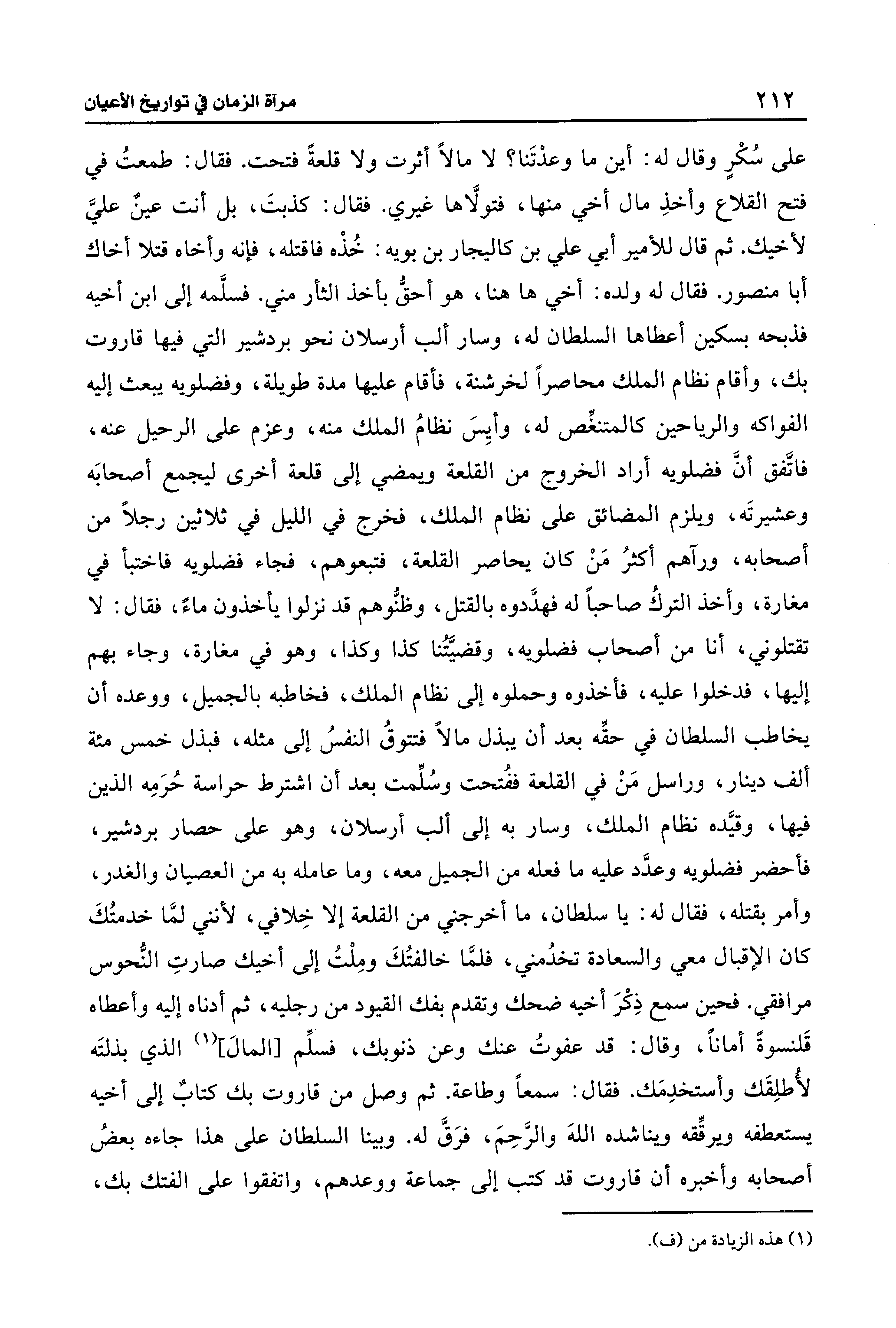 على سُكْرٍ وقال له: أين ما وعدْتَنا؟ لا مالًا أثرت ولا قلعةً فتحت. فقال: طمعتُ في فتح القلاع وأخذِ مال أخي منها، فتولَّاها غيري. فقال: كذبتَ، بل أنت عينٌ عليَّ لأخيك. ثم قال للأمير أبي علي بن كاليجار بن بويه: خُذْه فاقتله، فإنه وأخاه قتلا أخاك أبا منصور. فقال له ولده: أخي ها هنا، هو أحقُّ بأخذ الثأر مني. فسلَّمه إلى ابن أخيه فذبحه بسكين أعطاها السلطان له، وسار ألب أرسلان نحو بردشير التي فيها قاروت بك، وأقام نظام الملك محاصرًا لخرشنة، فأقام عليها مدة طويلة، وفضلويه يبعث إليه الفواكه والرياحين كالمتنغِّص له، وأيِسَ نظامُ الملك منه، وعزم على الرحيل عنه، فاتَّفق أنَّ فضلويه أراد الخروج من القلعة ويمضي إلى قلعة أخرى ليجمع أصحابَه وعشيرتَه، ويلزم المضائق على نظام الملك، فخرج في الليل في ثلاثين رجلًا من أصحابه، ورآهم أكثرُ مَنْ كان يحاصر القلعة، فتبعوهم، فجاء فضلويه فاختبأ في مغارة، وأخذ التركُ صاحبًا له فهدَّدوه بالقتل، وظنُّوهم قد نزلوا يأخذون ماءً، فقال: لا تقتلوني، أنا من أصحاب فضلويه، وقضيَّتُنا كذا وكذا، وهو في مغارة، وجاء بهم إليها، فدخلوا عليه، فأخذوه وحملوه إلى نظام الملك، فخاطبه بالجميل، ووعده أن يخاطب السلطان في حقِّه بعد أن يبذل مالًا فتتوقُ النفسُ إلى مثله، فبذل خمس مئة ألف دينار، وراسل مَنْ في القلعة ففُتحت وسُلِّمت بعد أن اشترط حراسة حُرَمِه الذين فيها، وقيَّده نظام الملك، وسار به إلى ألب أرسلان، وهو على حصار بردشير، فأحضر فضلويه وعدَّد عليه ما فعله من الجميل معه، وما عامله به من العصيان والغدر، وأمر بقتله، فقال له: يا سلطان، ما أخرجني من القلعة إلا خِلافي, لأنني لمَّا خدمتُكَ كان الإقبال معي والسعادة تخدُمني، فلمَّا خالفتُكَ ومِلْتُ إلى أخيك صارتِ النُّحوس مرافقي. فحين سمع ذِكْرَ أخيه ضحك وتقدم بفك القيود من رجليه، ثم أدناه إليه وأعطاه قَلنسوةً أمانًا، وقال: قد عفوتُ عنك وعن ذنوبك، فسلِّم [المال] (¬1) الذي بذلتَه لأُطلِقَك وأستخدِمَك. فقال: سمعًا وطاعة. ثم وصل من قاروت بك كتابٌ إلى أخيه يستعطفه ويرقِّقه ويناشده اللهَ والرَّحِمَ، فرَقَّ له. وبينا السلطان على هذا جاءه بعضُ أصحابه وأخبره أن قاروت قد كتب إلى جماعة ووعدهم، واتفقوا على الفتك بك،