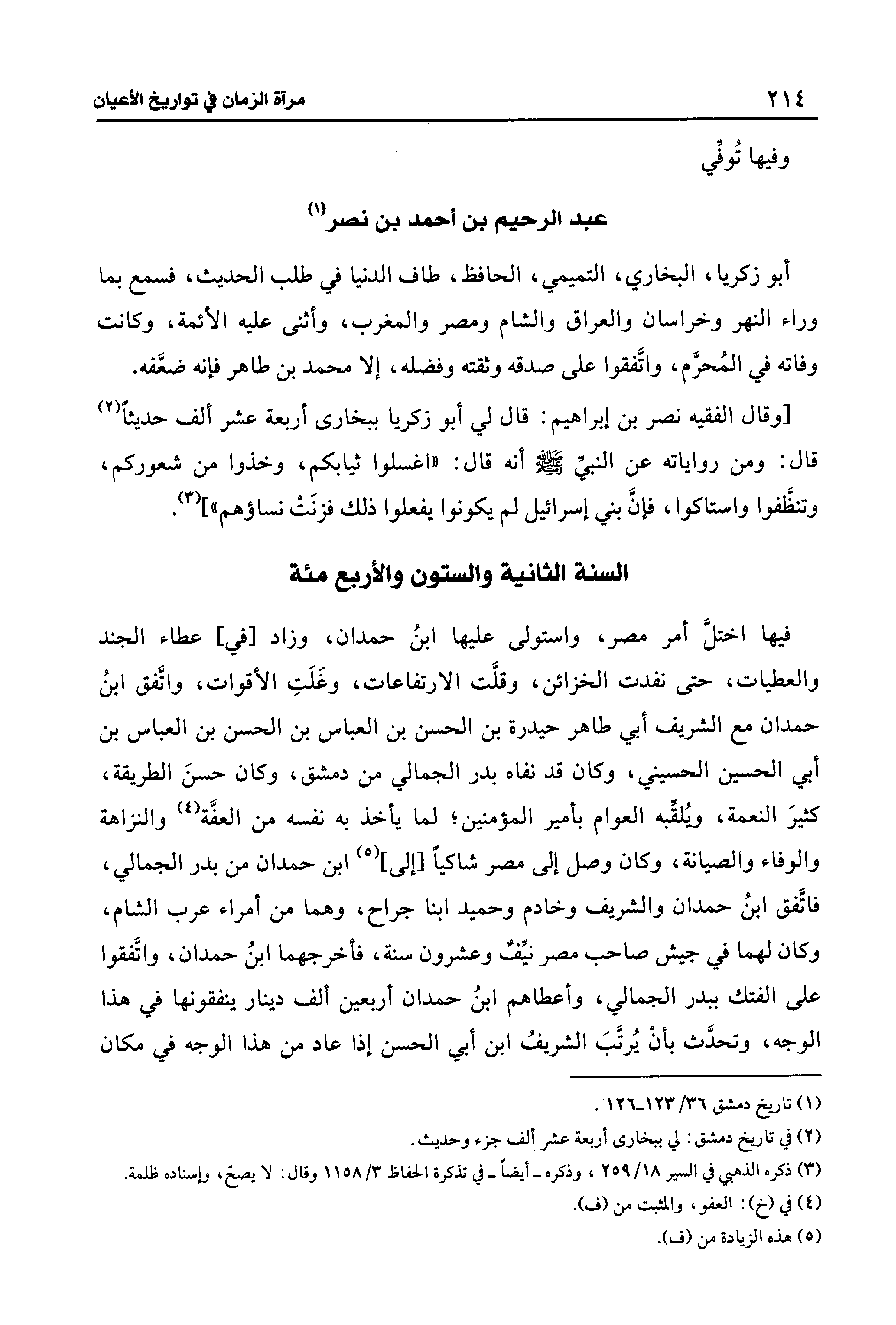 فيها اختلَّ أمر مصر، واستولى عليها ابنُ حمدان، وزاد [في] عطاء الجند والعطيات، حتى نفدت الخزائن، وقلَّت الارتفاعات، وغَلَتِ الأقوات، واتَّفق ابنُ حمدان مع الشريف أبي طاهر حيدرة بن الحسن بن العباس بن الحسن بن العباس بن أبي الحسين الحسيني، وكان قد نفاه بدر الجمالي من دمشق، وكان حسنَ الطريقة، كثيرَ النعمة، ويُلقِّبه العوام بأمير المؤمنين؛ لما يأخذ به نفسه من العفَّة (¬4) والنزاهة والوفاء والصيانة، وكان وصل إلى مصر شاكيًا [إلى] (¬5) ابن حمدان من بدر الجمالي، فاتَّفق ابنُ حمدان والشريف وخادم وحميد ابنا جراح، وهما من أمراء عرب الشام، وكان لهما في جيش صاحب مصر نيِّفٌ وعشرون سنة، فأخرجهما ابنُ حمدان، واتَّفقوا على الفتك ببدر الجمالي، وأعطاهم ابنُ حمدان أربعين ألف دينار ينفقونها في هذا الوجه، وتحدَّث بأنْ يُرتَّبَ الشريفُ ابن أبي الحسن إذا عاد من هذا الوجه في مكان