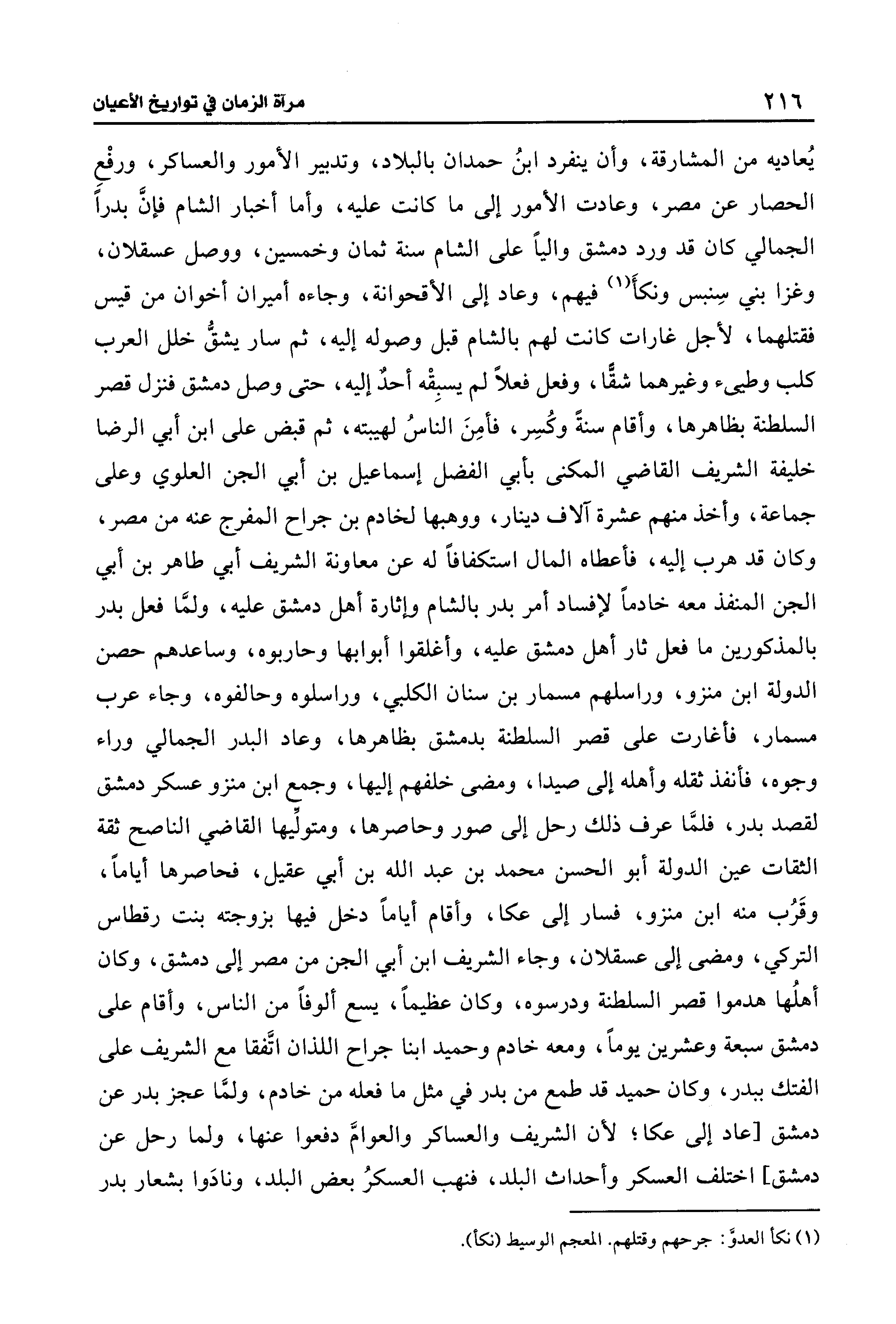 يُعاديه من المشارقة، وأن ينفرد ابنُ حمدان بالبلاد، وتدبير الأمور والعساكر، ورفْع الحصار عن مصر، وعادت الأمور إلى ما كانت عليه، وأما أخبار الشام فإنَّ بدرًا الجمالي كان قد ورد دمشق واليًا على الشام سنة ثمان وخمسين، ووصل عسقلان، وغزا بني سِنبس ونكأَ (¬1) فيهم، وعاد إلى الأقحوانة، وجاءه أميران أخوان من قيس فقتلهما، لأجل غارات كانت لهم بالشام قبل وصوله إليه، ثم سار يشقُّ خلل العرب كلب وطيئ وغيرهما شقًّا، وفعل فعلًا لم يسبِقْه أحدٌ إليه، حتى وصل دمشق فنزل قصر السلطنة بظاهرها، وأقام سنةً وكُسِر، فأمِنَ الناسُ لهيبته، ثم قبض على ابن أبي الرضا خليفة الشريف القاضي المكنى بأبي الفضل إسماعيل بن أبي الجن العلوي وعلى جماعة، وأخذ منهم عشرة آلاف دينار، ووهبها لخادم بن جراح المفرج عنه من مصر، وكان قد هرب إليه، فأعطاه المال استكفافًا له عن معاونة الشريف أبي طاهر بن أبي الجن المنفذ معه خادمًا لإفساد أمر بدر بالشام وإثارة أهل دمشق عليه، ولمَّا فعل بدر بالمذكورين ما فعل ثار أهل دمشق عليه، وأغلقوا أبوابها وحاربوه، وساعدهم حصن الدولة ابن منزو، وراسلهم مسمار بن سنان الكلبي، وراسلوه وحالفوه، وجاء عرب مسمار، فأغارت على قصر السلطنة بدمشق بظاهرها، وعاد البدر الجمالي وراء وجوه، فأنفذ ثقله وأهله إلى صيدا، ومضى خلفهم إليها، وجمع ابن منزو عسكر دمشق لقصد بدر، فلمَّا عرف ذلك رحل إلى صور وحاصرها، ومتولِّيها القاضي الناصح ثقة الثقات عين الدولة أبو الحسن محمد بن عبد الله بن أبي عقيل، فحاصرها أيامًا، وقَرُب منه ابن منزو، فسار إلى عكا، وأقام أيامًا دخل فيها بزوجته بنت رقطاس التركي، ومضى إلى عسقلان، وجاء الشريف ابن أبي الجن من مصر إلى دمشق، وكان أهلُها هدموا قصر السلطنة ودرسوه، وكان عظيمًا، يسع ألوفًا من الناس، وأقام على دمشق سبعة وعشرين يومًا، ومعه خادم وحميد ابنا جراح اللذان اتَّفقا مع الشريف على الفتك ببدر، وكان حميد قد طمع من بدر في مثل ما فعله من خادم، ولمَّا عجز بدر عن دمشق [عاد إلى عكا؛ لأن الشريف والعساكر والعوامَّ دفعوا عنها, ولما رحل عن دمشق] اختلف العسكر وأحداث البلد، فنهب العسكرُ بعض البلد، ونادَوا بشعار بدر