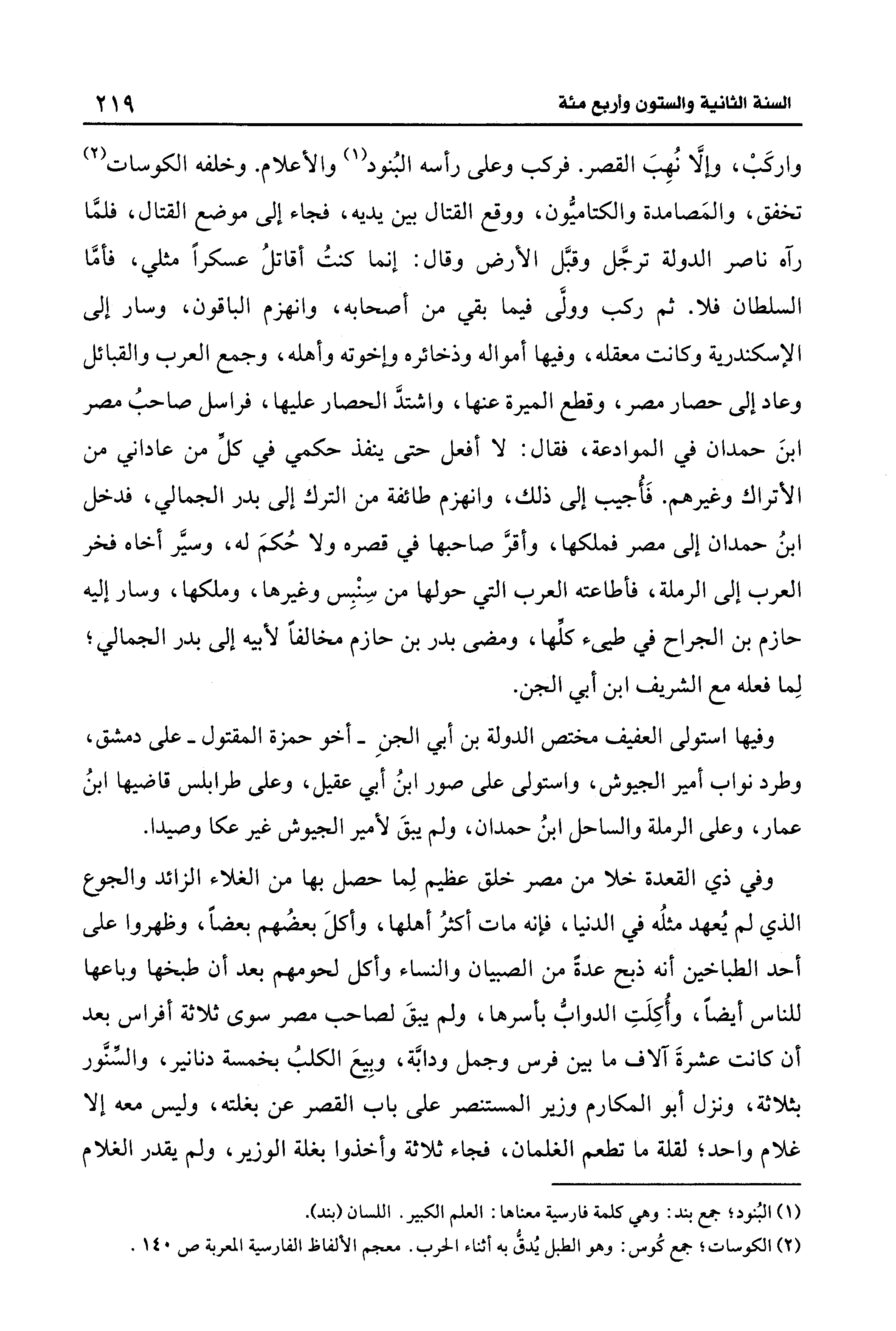 واركَبْ، وإلَّا نُهِبَ القصر. فركب وعلى رأسه البُنود (¬1) والأعلام. وخلفه الكوسات (¬2) تخفق، والمَصامدة والكتاميُّون، ووقع القتال بين يديه، فجاء إلى موضع القتال، فلمَّا رآه ناصر الدولة ترجَّل وقبَّل الأرض وقال: إنما كنتُ أقاتلُ عسكرًا مثلي، فأمَّا السلطان فلا. ثم ركب وولَّى فيما بقي من أصحابه، وانهزم الباقون، وسار إلى الإسكندرية وكانت معقله، وفيها أمواله وذخائره وإخوته وأهله، وجمع العرب والقبائل وعاد إلى حصار مصر، وقطع الميرة عنها، واشتدَّ الحصار عليها، فراسل صاحبُ مصر ابنَ حمدان في الموادعة، فقال: لا أفعل حتى ينفذ حكمي في كلِّ من عاداني من الأتراك وغيرهم. فَأُجيب إلى ذلك، وانهزم طائفة من الترك إلى بدر الجمالي، فدخل ابنُ حمدان إلى مصر فملكها، وأقرَّ صاحبها في قصره ولا حُكمَ له، وسيَّر أخاه فخر العرب إلى الرملة، فأطاعته العرب التي حولها من سِنْبِس وغيرها، وملكها، وسار إليه حازم بن الجراح في طيئ كلِّها، ومضى بدر بن حازم مخالفًا لأبيه إلى بدر الجمالي؛ لِما فعله مع الشريف ابن أبي الجن.