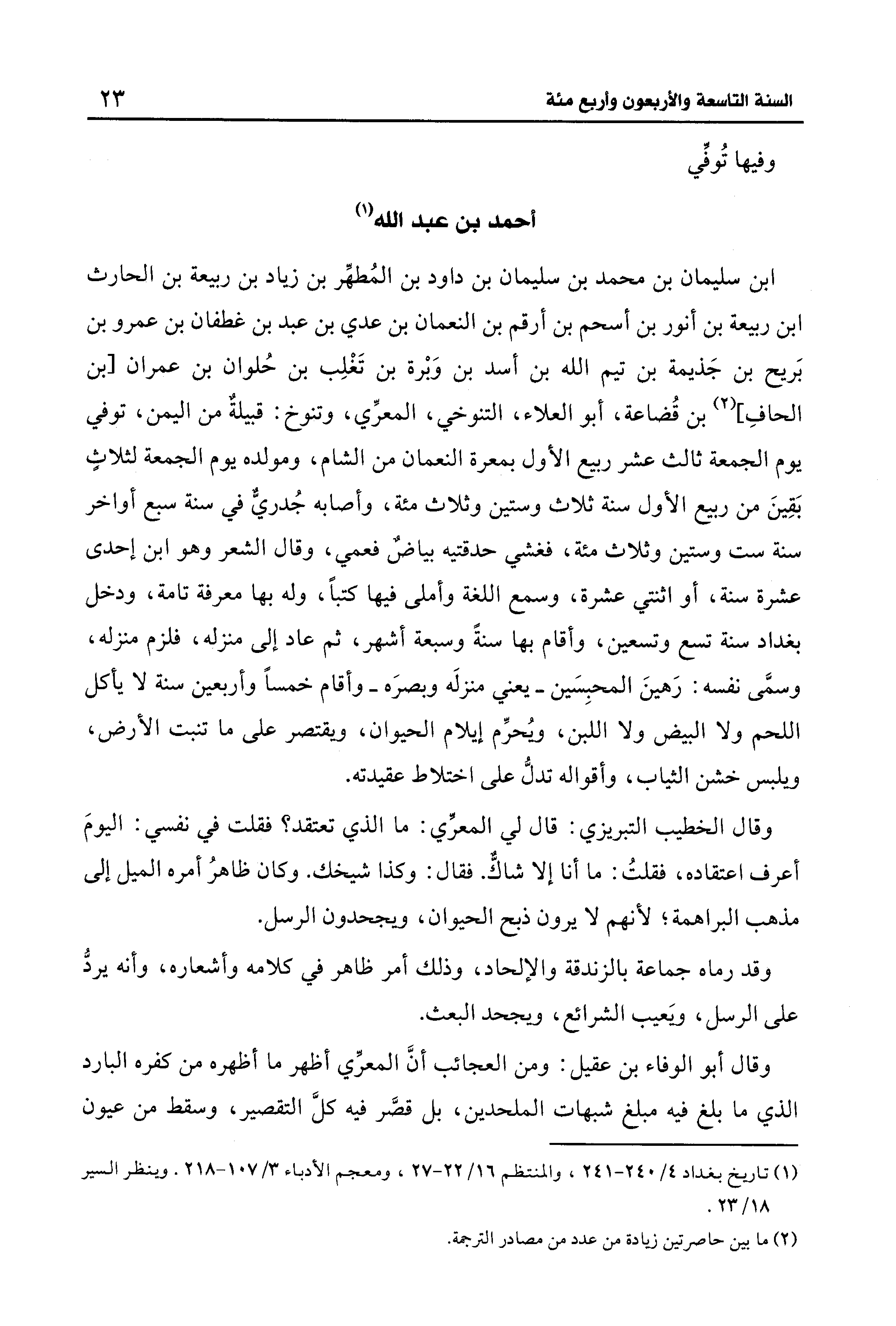 ابن سليمان بن محمَّد بن سليمان بن داود بن المُطهّر بن زياد بن ربيعة بن الحارث بن ربيعة بن أنور بن أسحم بن أرقم بن النُّعمان بن عدي بن عبد بن غطفان بن عمرو بن بَريح بن جَذيمة بن تيم الله بن أسد بن وَبْرة بن تَغْلِب بن حُلوان بن عمران [بن الحافِ] (¬2) بن قُضاعة، أبو العلاء، التنوخي، المعرِّي، وتنوخ: قبيلةٌ من اليمن، تُوفِّي يوم الجمعة ثالث عشر ربيع الأول بمعرة النُّعمان من الشَّام، ومولده يوم الجمعة لثلاثٍ بَقِينَ من ربيع الأول سنة ثلاث وستين وثلاث مئة، وأصابه جُدريٌّ في سنة سبع أواخر سنة ست وستين وثلاث مئة، فغشي حدقتيه بياضٌ فعمي، وقال الشعر وهو ابن إحدى عشرة سنة، أو اثنتي عشرة، وسمع اللغة وأملى فيها كتبًا، وله بها معرفة تامة، ودخل بغداد سنة تسع وتسعين، وأقام بها سنةً وسبعة أشهر، ثم عاد إلى منزله، فلزم منزله، وسمَّى نفسه: رَهينَ المحبِسَين -يعني منزلَه وبصرَه- وأقام خمسًا وأربعين سنة لا يأكل اللحم ولا البيض ولا اللبن، ويُحرِّم إيلام الحيوان، ويقتصر على ما تنبت الأرض، ويلبس خشن الثياب، وأقواله تدلُّ على اختلاط عقيدته.