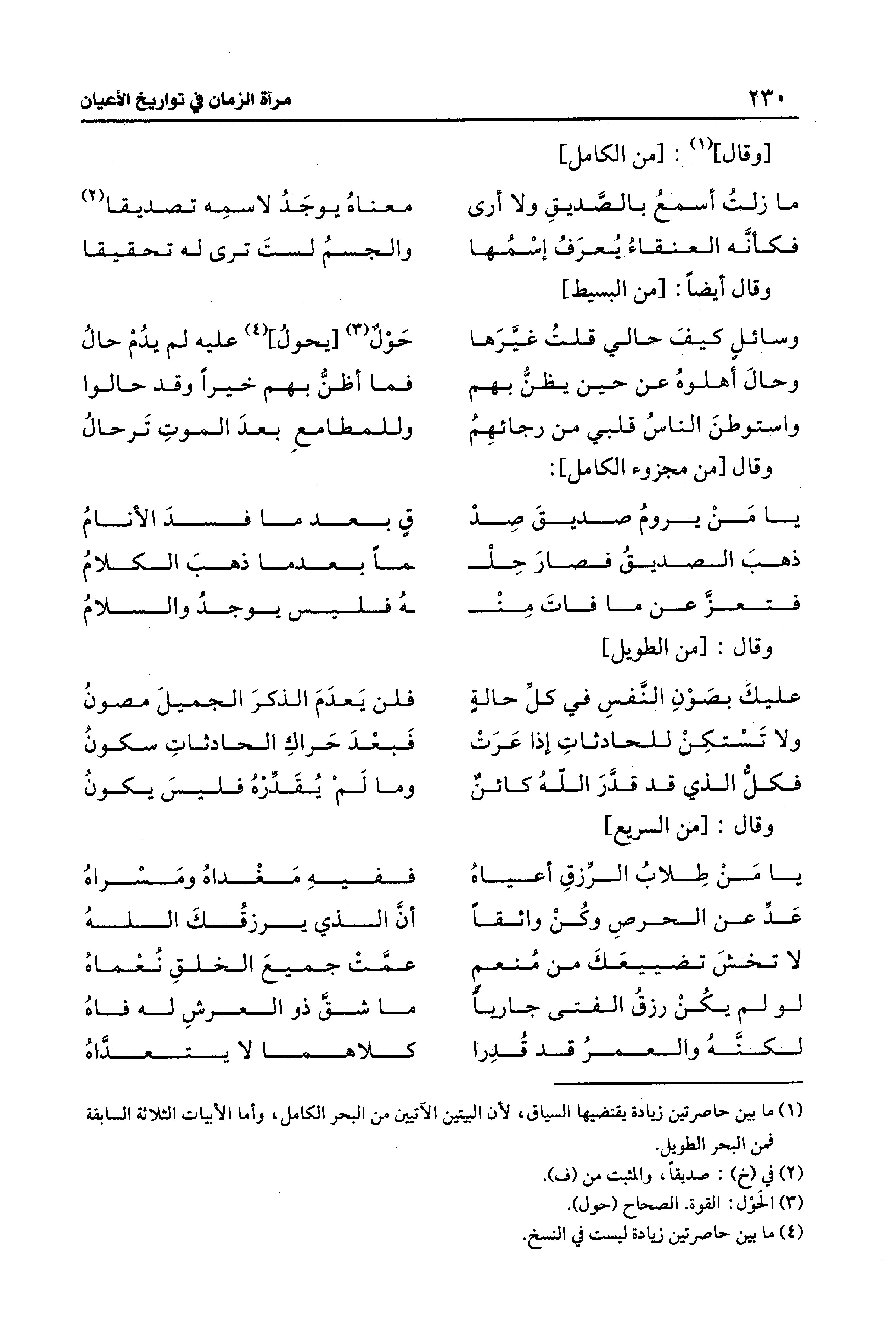 (¬1) ما بين حاصرتين زيادة يقتضيها السياق، لأن البيتين تيين من البحر الكامل، وأما الأبيات الثلاثة السابقة فمن البحر الطويل.