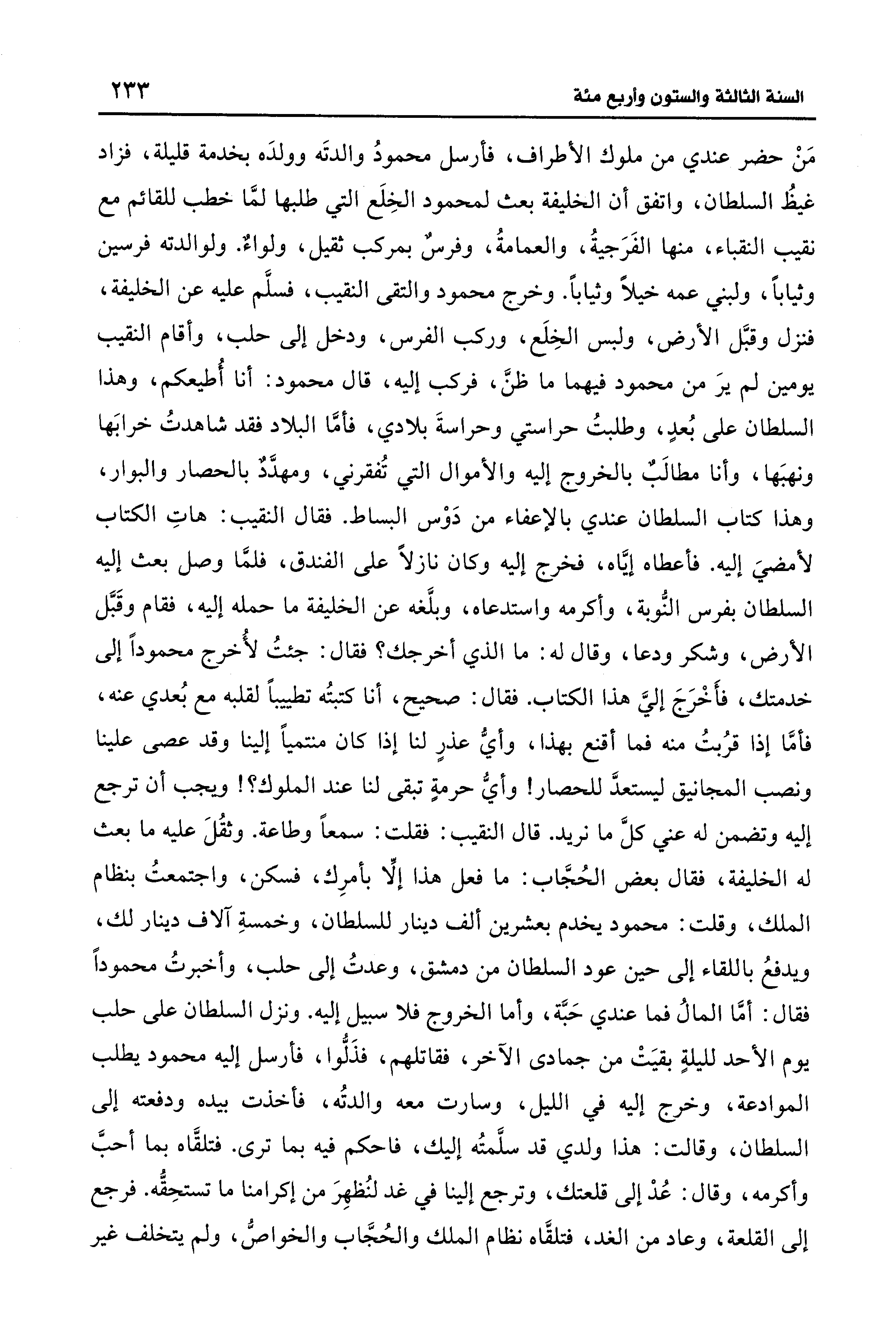 مَنْ حضر عندي من ملوك الأطراف، فأرسل محمودُ والدتَه وولدَه بخدمة قليلة، فزاد غيظُ السلطان، واتفق أن الخليفة بعث لمحمود الخِلَع التي طلبها لمَّا خطب للقائم مع نقيب النقباء، منها الفَرَجيةُ، والعمامةُ، وفرسٌ بمركب ثقيل، ولواءٌ. ولوالدته فرسين وثيابًا، ولبني عمه خيلًا وثيابًا. وخرج محمود والتقى النقيب، فسلَّم عليه عن الخليفة، فنزل وقبَّل الأرض، ولبس الخِلَع، وركب الفرس، ودخل إلى حلب، وأقام النقيب يومين لم يرَ من محمود فيهما ما ظنَّ، فركب إليه، قال محمود: أنا أُطيعكم، وهذا السلطان على بُعدٍ، وطلبتُ حراستي وحراسةَ بلادي، فأمَّا البلاد فقد شاهدتُ خرابَها ونهبَها، وأنا مطالبٌ بالخروج إليه والأموال التي تُفقرني، ومهدَّدٌ بالحصار والبوار، وهذا كتاب السلطان عندي بالإعفاء من دَوْس البساط. فقال النقيب: هاتِ الكتاب لأمضيَ إليه. فأعطاه إيَّاه، فخرج إليه وكان نازلًا على الفندق، فلمَّا وصل بعث إليه السلطان بفرس النُّوبة، وأكرمه واستدعاه، وبلَّغه عن الخليفة ما حمله إليه، فقام وقَبَّل الأرض، وشكر ودعا، وقال له: ما الَّذي أخرجك؟ فقال: جئتُ لأُخرج محمودًا إلى خدمتك، فأَخْرَجَ إليَّ هذا الكتاب. فقال: صحيح، أنا كتبتُه تطييبًا لقلبه مع بُعدي عنه، فأمَّا إذا قرُبتُ منه فما أقنع بهذا، وأيُّ عذرٍ لنا إذا كان منتميًا إلينا وقد عصى علينا ونصب المجانيق ليستعدَّ للحصار! وأيُّ حرمةٍ تبقى لنا عند الملوك؟ ! ويجب أن ترجع إليه وتضمن له عني كلَّ ما نريد. قال النقيب: فقلت: سمعًا وطاعة. وثقُلَ عليه ما بعث له الخليفة، فقال بعض الحُجَّاب: ما فعل هذا إلَّا بأمرِك، فسكن، واجتمعتُ بنظام الملك، وقلت: محمود يخدم بعشرين ألف دينار للسلطان، وخمسةِ آلاف دينار لك، ويدفعُ باللقاء إلى حين عود السلطان من دمشق، وعدتُ إلى حلب، وأخبرتُ محمودًا فقال: أمَّا المالُ فما عندي حَبَّة، وأما الخروج فلا سبيل إليه. ونزل السلطان على حلب يوم الأحد لليلةٍ بقيَتْ من جمادى الآخر، فقاتلهم، فذَلُّوا، فأرسل إليه محمود يطلب الموادعة، وخرج إليه في الليل، وسارت معه والدتُه، فأخذت بيده ودفعته إلى السلطان، وقالت: هذا ولدي قد سلَّمتُه إليك، فاحكم فيه بما ترى. فتلقَّاه بما أحبَّ وأكرمه، وقال: عُدْ إلى قلعتك، وترجع إلينا في غد لنُظهِرَ من إكرامنا ما تستحِقُّه. فرجع إلى القلعة، وعاد من الغد، فتلقَّاه نظام الملك والحُجَّاب والخواصُّ، ولم يتخلف غير