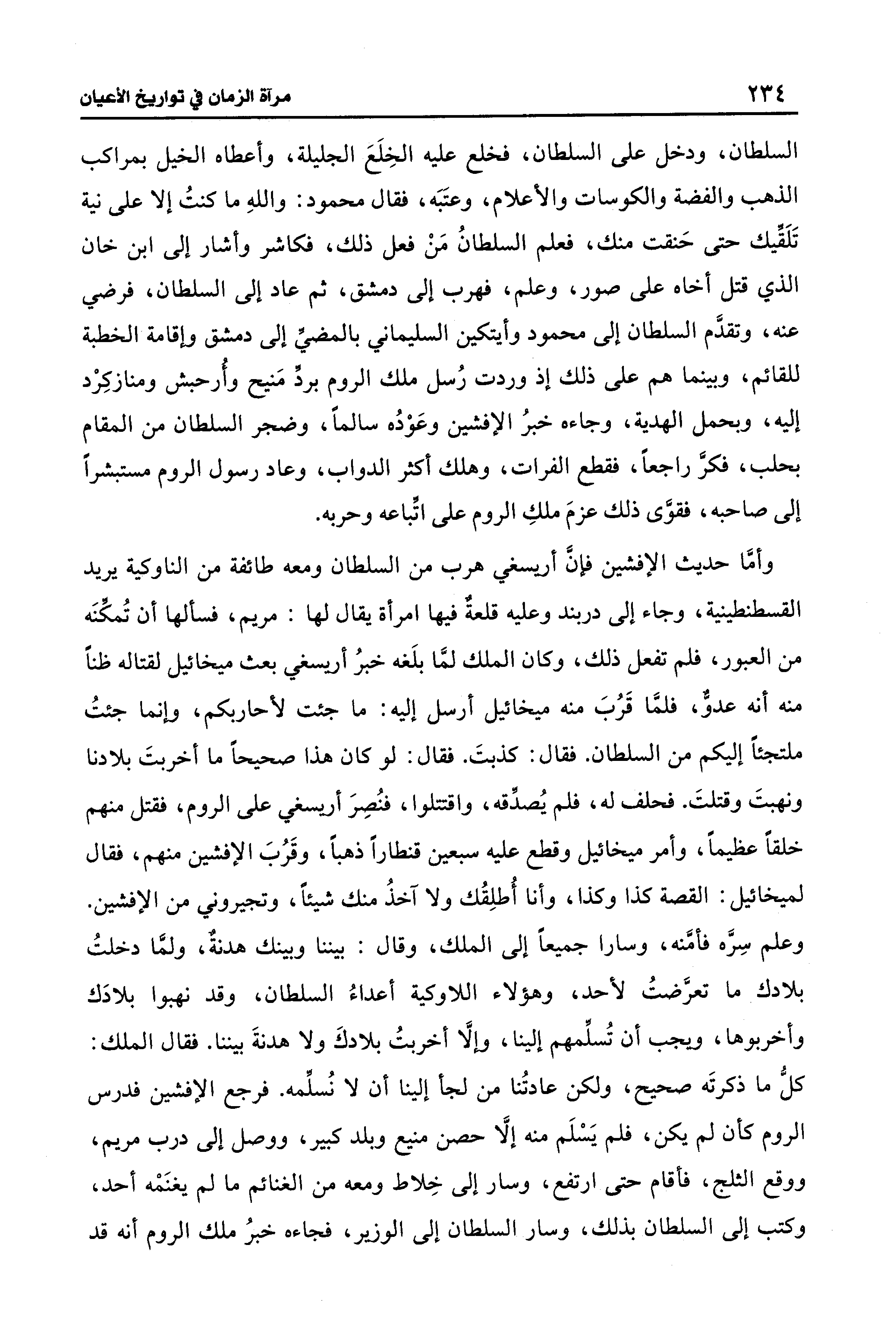 السلطان، ودخل على السلطان، فخلع عليه الخِلَعَ الجليلة، وأعطاه الخيل بمراكب الذهب والفضة والكوسات والأعلام، وعتَبَه، فقال محمود: واللهِ ما كُنْتُ إلا على نية تَلَقِّيك حتَّى حَنقت منك، فعلم السلطانُ مَنْ فعل ذلك، فكاشر وأشار إلى ابن خان الَّذي قتل أخاه على صور، وعلم، فهرب إلى دمشق، ثم عاد إلى السلطان، فرضي عنه، وتقدَّم السلطان إلى محمود وأيتكين السليماني بالمضيِّ إلى دمشق وإقامة الخطبة للقائم، وبينما هم على ذلك إذ وردت رُسل ملك الروم بردٍّ مَنيح وأُرحبش ومنازكِرْد إليه، وبحمل الهدية، وجاءه خبرُ الإفشين وعَوْدُه سالمًا، وضجر السلطان من المقام بحلب، فكرَّ راجعًا، فقطع الفرات، وهلك أكثر الدواب، وعاد رسول الروم مستبشرًا إلى صاحبه، فقوَّى ذلك عزمَ ملكِ الروم على اتِّباعه وحربه.