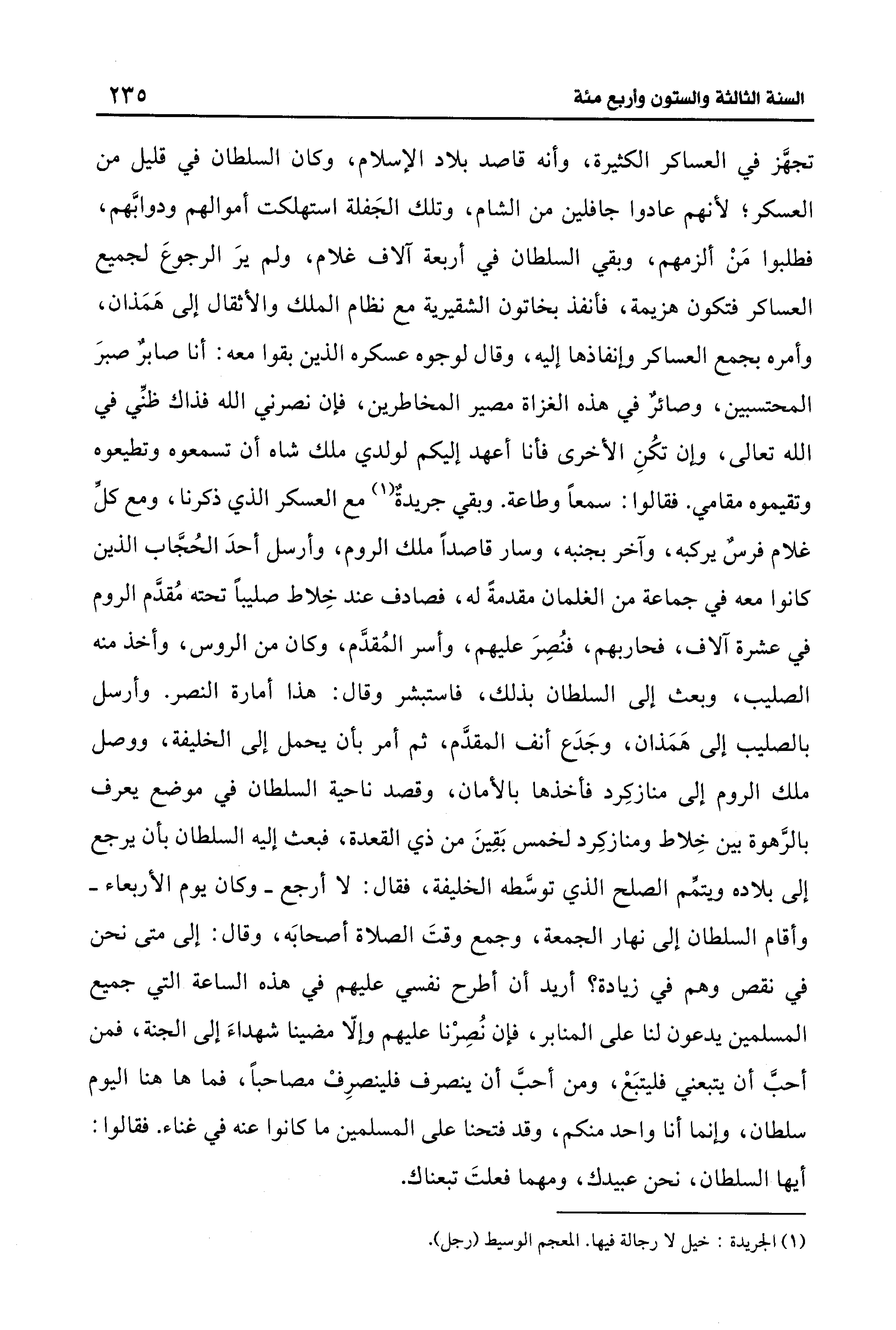 تجهَّز في العساكر الكثيرة، وأنه قاصد بلاد الإسلام، وكان السلطان في قليل من العسكر؛ لأنهم عادوا جافلين من الشام، وتلك الجَفلة استهلكت أموالهم ودوابَّهم، فطلبوا مَنْ ألزمهم، وبقي السلطان في أربعة آلاف غلام، ولم يرَ الرجوعَ لجميع العساكر فتكون هزيمة، فأنفذ بخاتون الشقيرية مع نظام الملك والأثقال إلى هَمَذان، وأمره بجمع العساكر وإنفاذها إليه، وقال لوجوه عسكره الذين بقوا معه: أنا صابرٌ صبرَ المحتسبين، وصائرٌ في هذه الغزاة مصير المخاطرين، فإن نصرني الله فذاك ظنِّي في الله تعالى، وإن تكُنِ الأخرى فأنا أعهد إليكم لولدي ملك شاه أن تسمعوه وتطيعوه وتقيموه مقامي. فقالوا: سمعًا وطاعة. وبقي جريدةٌ (¬1) مع العسكر الَّذي ذكرنا، ومع كلِّ غلام فرسٌ يركبه، وآخر بجنبه، وسار قاصدًا ملك الروم، وأرسل أحدَ الحُجَّاب الذين كانوا معه في جماعة من الغلمان مقدمةً له، فصادف عند خِلاط صليبًا تحته مُقدَّم الروم في عشرة آلاف، فحاربهم، فنُصِرَ عليهم، وأسر المُقدَّم، وكان من الروس، وأخذ منه الصليب، وبعث إلى السلطان بذلك، فاستبشر وقال: هذا أمارة النصر. وأرسل بالصليب إلى هَمَذان، وجَدَع أنف المقدَّم، ثم أمر بأن يحمل إلى الخليفة، ووصل ملك الروم إلى منازكِرد فأخذها بالأمان، وقصد ناحية السلطان في موضع يعرف بالرَّهوة بين خِلاط ومنازكِرد لخمس بَقِينَ من ذي القعدة، فبعث إليه السلطان بأن يرجع إلى بلاده ويتمِّم الصلح الَّذي توسَّطه الخليفة، فقال: لا أرجع -وكان يوم الأربعاء- وأقام السلطان إلى نهار الجمعة، وجمع وقتَ الصلاة أصحابَه، وقال: إلى متى نحن في نقص وهم في زيادة؟ أريد أن أطرح نفسي عليهم في هذه الساعة التي جميع المسلمين يدعون لنا على المنابر، فإن نُصِرْنا عليهم وإلّا مضينا شهداءَ إلى الجنّة، فمن أحبَّ أن يتبعني فليتبَعْ، ومن أحبَّ أن ينصرف فلينصرِفْ مصاحبًا، فما ها هنا اليوم سلطان، وإنما أنا واحد منكم، وقد فتحنا على المسلمين ما كانوا عنه في غناء. فقالوا: أيها السلطان، نحن عبيدك، ومهما فعلتَ تبعناك.