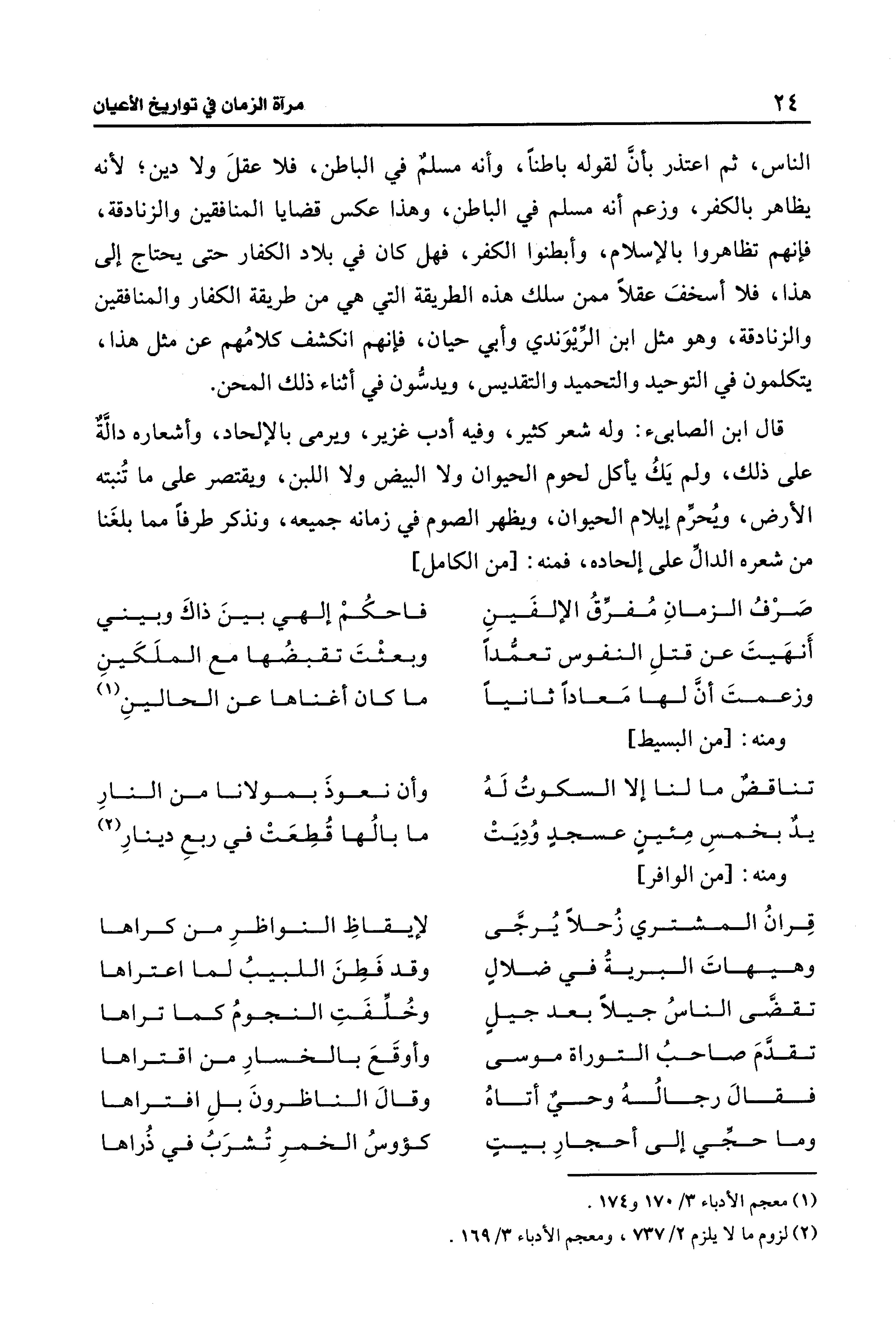 قال ابن الصابئ: وله شعر كثير، وفيه أدب غزير، ويرمى بالإلحاد، وأشعاره دالَّةٌ على ذلك، ولم يَكُ يأكل لحوم الحيوان ولا البيض ولا اللبن، ويقتصر على ما تُنبته الأرض، ويُحرِّم إيلام الحيوان، ويظهر الصوم في زمانه جميعه، ونذكر طرفًا مما بلغَنا من شعره الدال على إلحاده، فمنه: [من الكامل]