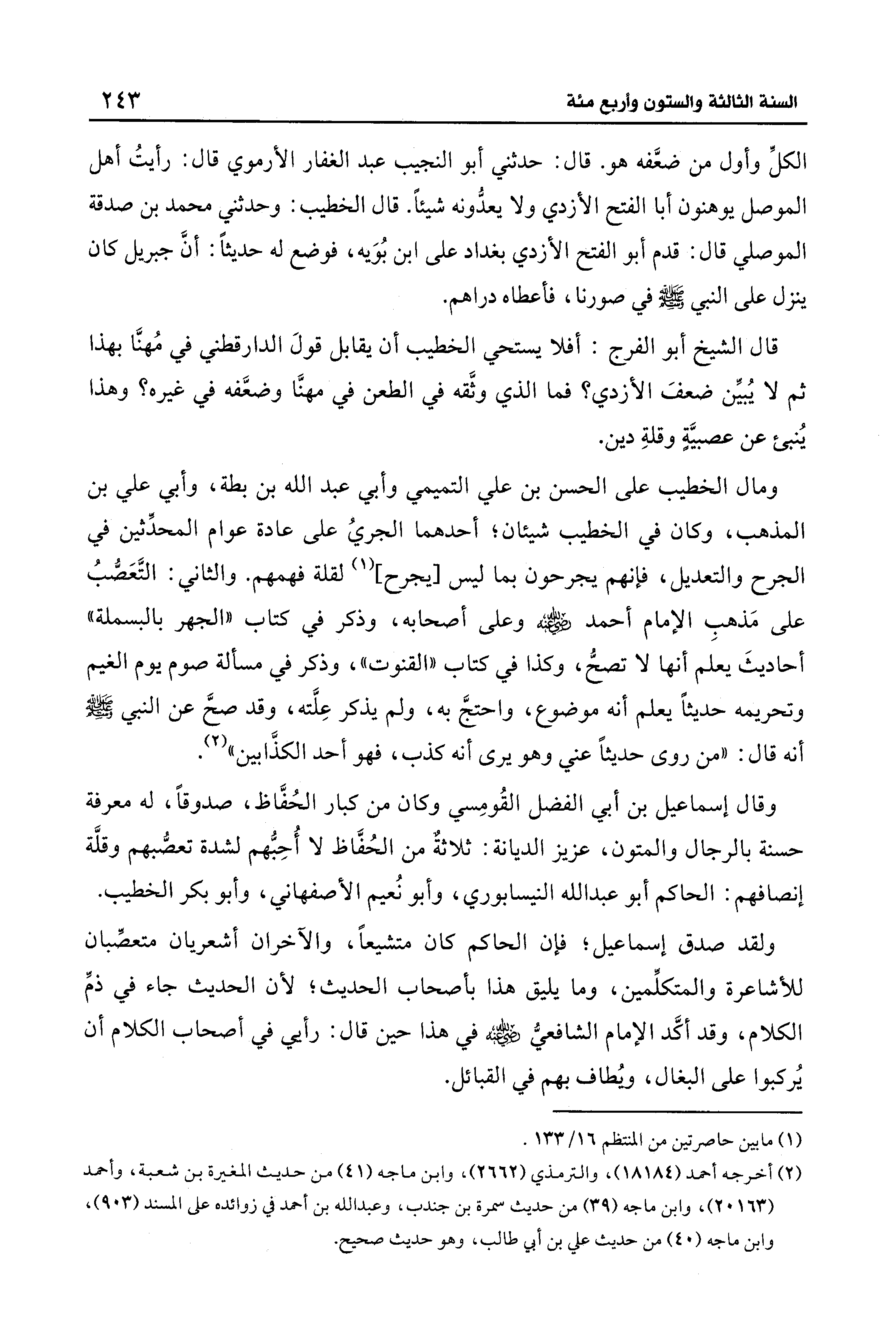 ومال الخطيب على الحسن بن علي التميمي وأبي عبد الله بن بطة، وأبي علي بن المذهب، وكان في الخطيب شيئان؛ أحدهما الجريُ على عادة عوام المحدِّثين في الجرح والتعديل، فإنهم يجرحون بما ليس [يجرح] (¬1) لقلة فهمهم. والثاني: التَّعَصُّبُ على مَذهبِ الإمام أحمد - رضي الله عنه - وعلى أصحابه، وذكر في كتاب "الجهر بالبسملة" أحاديثَ يعلم أنها لا تصحُّ، وكذا في كتاب "القنوت"، وذكر في مسألة صوم يوم الغيم وتحريمه حديثًا يعلم أنَّه موضوع، واحتجَّ به، ولم يذكر عِلَّته، وقد صحَّ عن النبي - صلى الله عليه وسلم - أنَّه قال: "من روى حديثًا عني وهو يرى أنَّه كذب، فهو أحد الكذَّابين" (¬2).