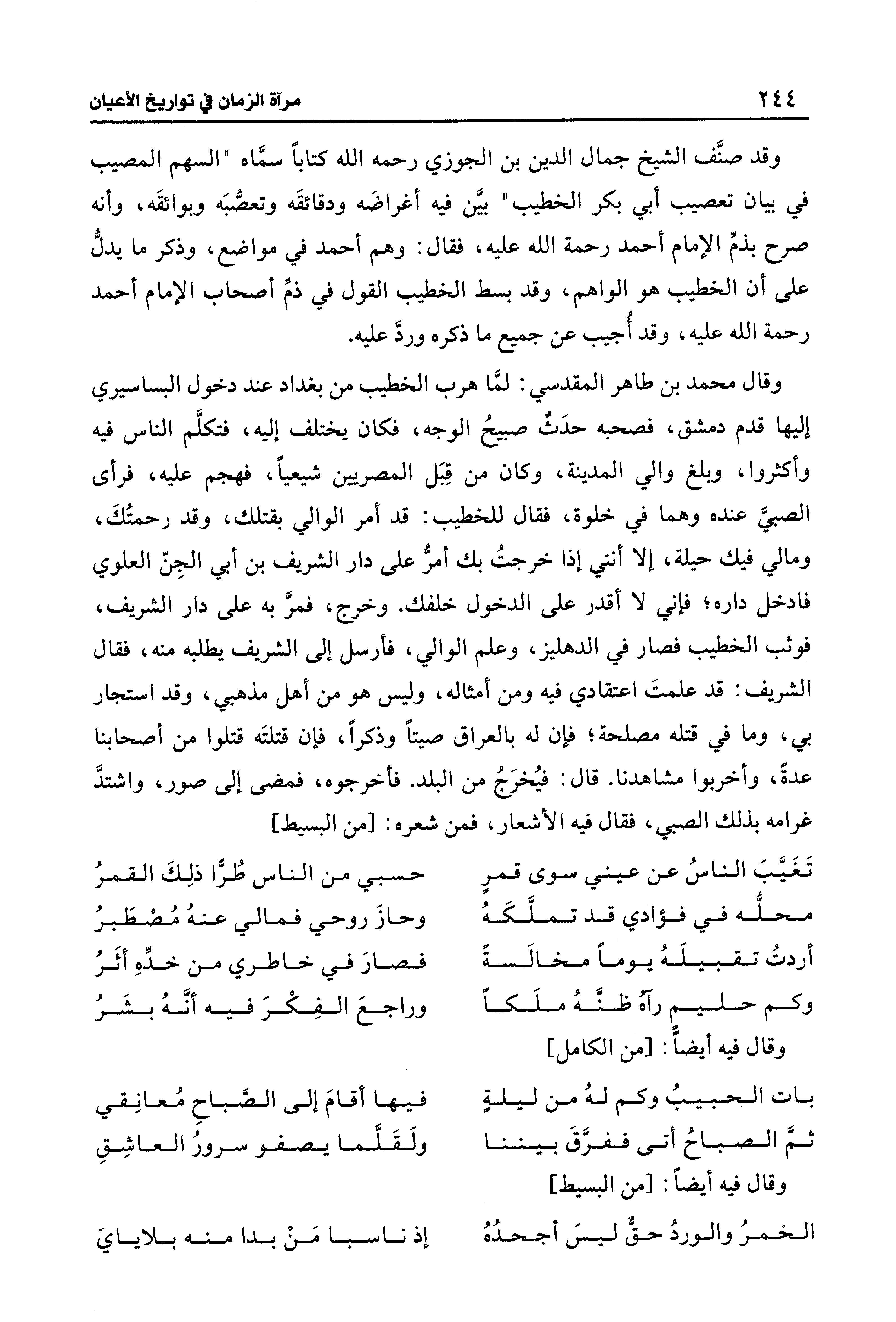 وقد صنَّف الشيخ جمال الدين بن الجوزي رحمه الله كتابًا سمَّاه "السهم المصيب في بيان تعصيب أبي بكر الخطيب" بيَّن فيه أغراضَه ودقائقَه وتعصُّبَه وبوائقَه، وأنه صرح بذمِّ الإمام أحمد رحمة الله عليه، فقال: وهم أحمد في مواضع، وذكر ما يدلُّ على أن الخطيب هو الواهم، وقد بسط الخطيب القول في ذمِّ أصحاب الإمام أحمد رحمة الله عليه، وقد أُجيب عن جميع ما ذكره وردَّ عليه.