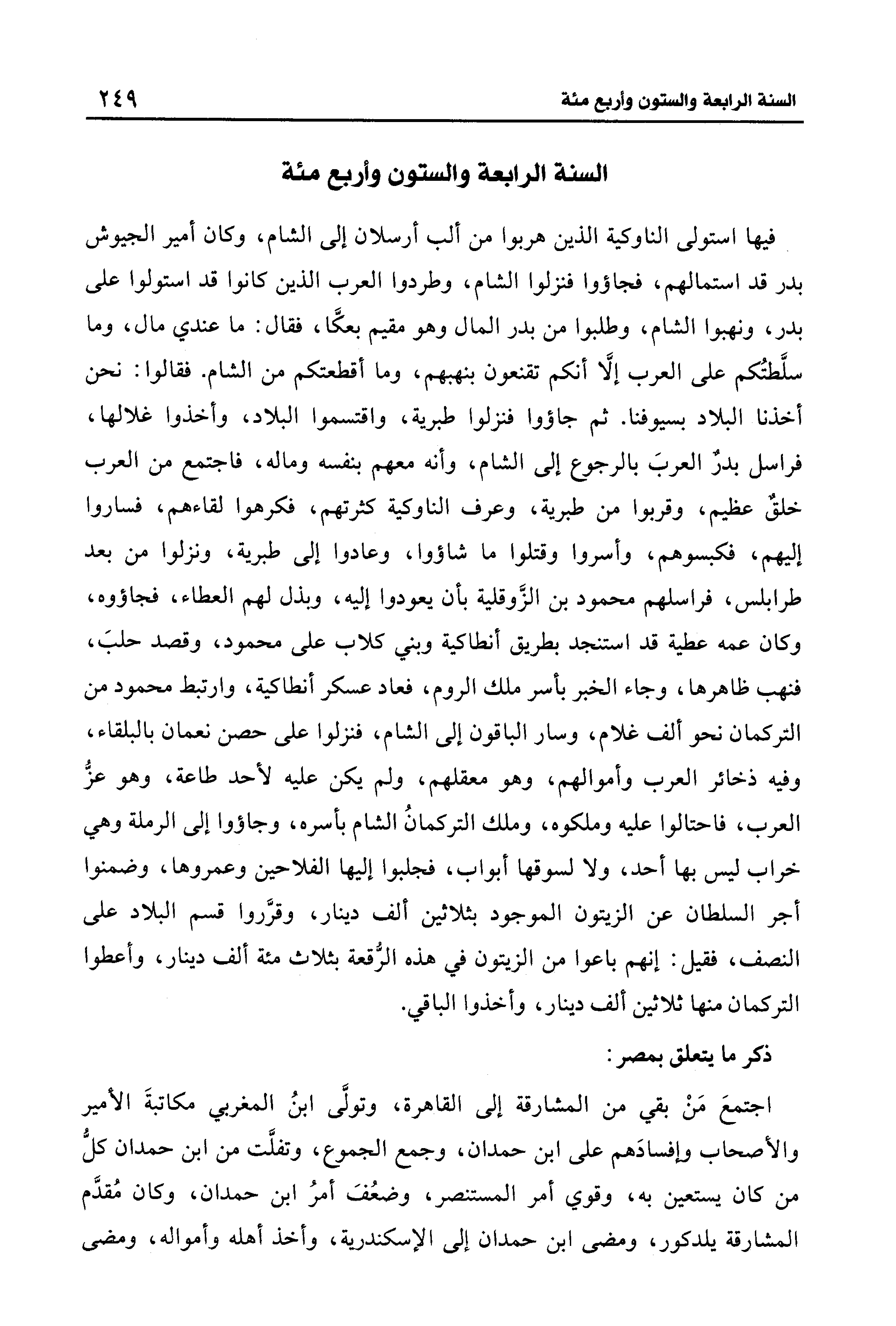 فيها استولى الناوكية الذين هربوا من ألب أرسلان إلى الشام، وكان أمير الجيوش بدر قد استمالهم، فجاؤوا فنزلوا الشام، وطردوا العرب الذين كانوا قد استولوا على بدر، ونهبوا الشام، وطلبوا من بدر المال وهو مقيم بعكَّا، فقال: ما عندي مال، وما سلَّطتُكم على العرب إلَّا أنكم تقنعون بنهبهم، وما أقطعتكم من الشام. فقالوا: نحن أخذنا البلاد بسيوفنا. ثم جاؤوا فنزلوا طبرية، واقتسموا البلاد، وأخذوا غلالها، فراسل بدرٌ العربَ بالرجوع إلى الشام، وأنه معهم بنفسه وماله، فاجتمع من العرب خلقٌ عظيم، وقربوا من طبرية، وعرف الناوكية كثرتهم، فكرهوا لقاءهم، فساروا إليهم، فكبسوهم، وأسروا وقتلوا ما شاؤوا، وعادوا إلى طبرية، ونزلوا من بعد طرابلس، فراسلهم محمود بن الزَّوقلية بأن يعودوا إليه، وبذل لهم العطاء، فجاؤوه، وكان عمه عطية قد استنجد بطريق أنطاكية وبني كلاب على محمود، وقصد حلبَ، فنهب ظاهرها، وجاء الخبر بأسر ملك الروم، فعاد عسكر أنطاكية، وارتبط محمود من التركمان نحو ألف غلام، وسار الباقون إلى الشام، فنزلوا على حصن نعمان بالبلقاء، وفيه ذخائر العرب وأموالهم، وهو معقلهم، ولم يكن عليه لأحد طاعة، وهو عزُّ العرب، فاحتالوا عليه وملكوه، وملك التركمانُ الشام بأسره، وجاؤوا إلى الرملة وهي خراب ليس بها أحد، ولا لسوقها أبواب، فجلبوا إليها الفلاحين وعمروها، وضمنوا أجر السلطان عن الزيتون الموجود بثلاثين ألف دينار، وقرَّروا قسم البلاد على النصف، فقيل: إنهم باعوا من الزيتون في هذه الرّقعة بثلاث مئة ألف دينار، وأعطوا التركمان منها ثلاثين ألف دينار، وأخذوا الباقي.