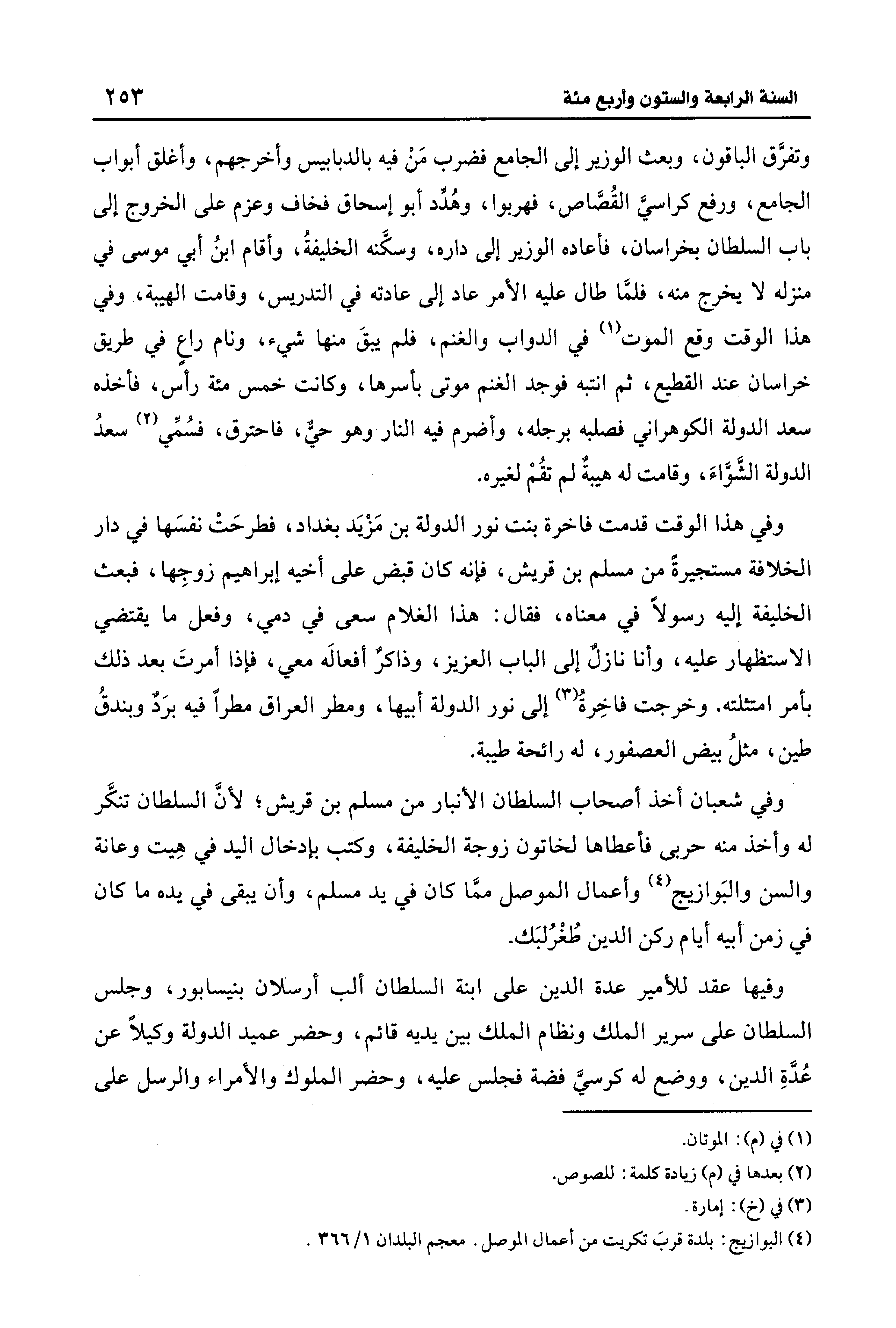 وفي شعبان أخذ أصحاب السلطان الأنبار من مسلم بن قريش؛ لأنَّ السلطان تنكَّر له وأخذ منه حربى فأعطاها لخاتون زوجة الخليفة، وكتب بإدخال اليد في هِيت وعانة والسن والبَوازيج (¬4) وأعمال الموصل ممَّا كان في يد مسلم، وأن يبقى في يده ما كان في زمن أبيه أيام ركن الدين طُغْرُلبَك.