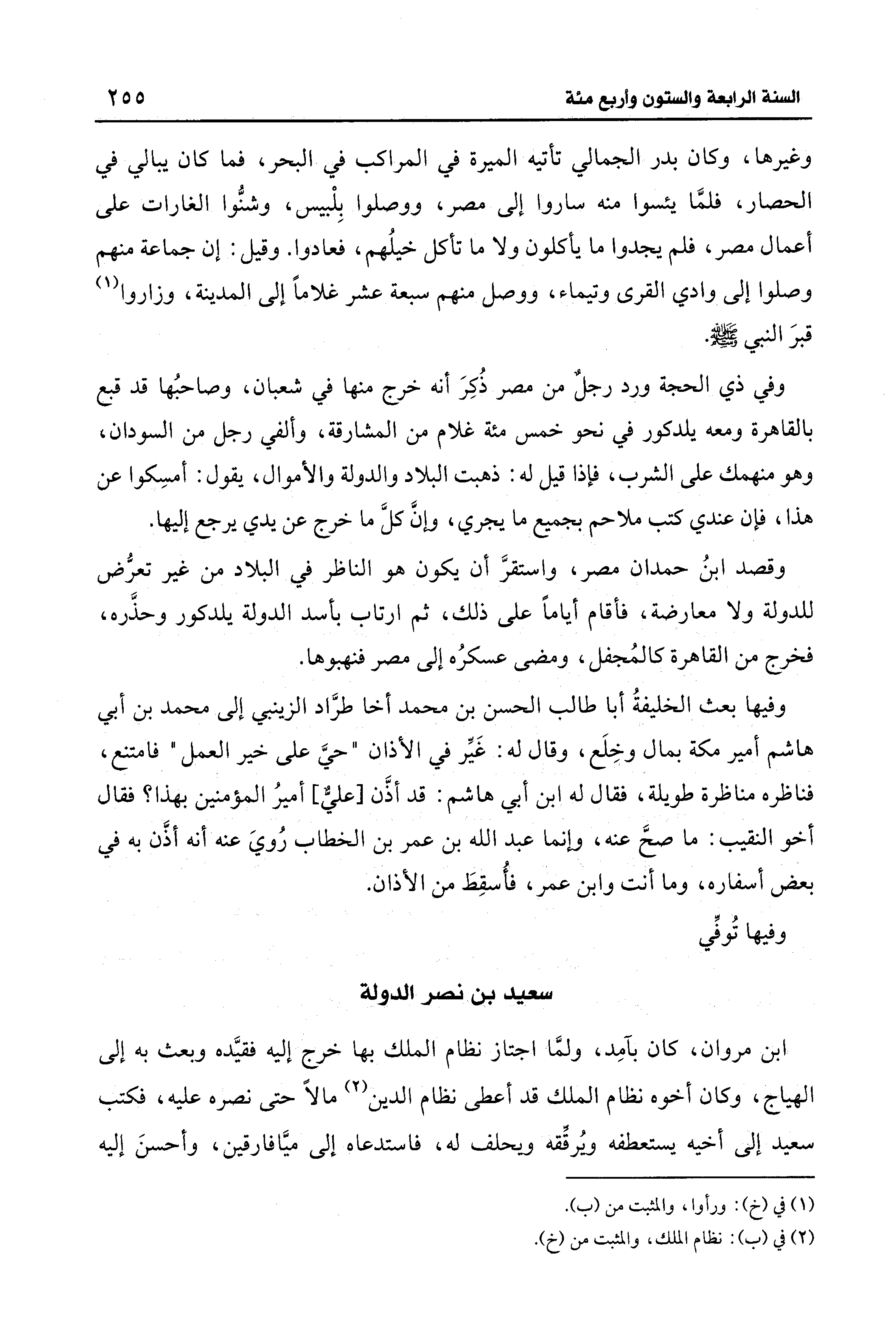 وقصد ابنُ حمدان مصر، واستقرَّ أن يكون هو الناظر في البلاد من غير تعرُّض للدولة ولا معارضة، فأقام أيامًا على ذلك، ثم ارتاب بأسد الدولة يلدكور وحذَّره، فخرج من القاهرة كالمُجفل، ومضى عسكرُه إلى مصر فنهبوها.