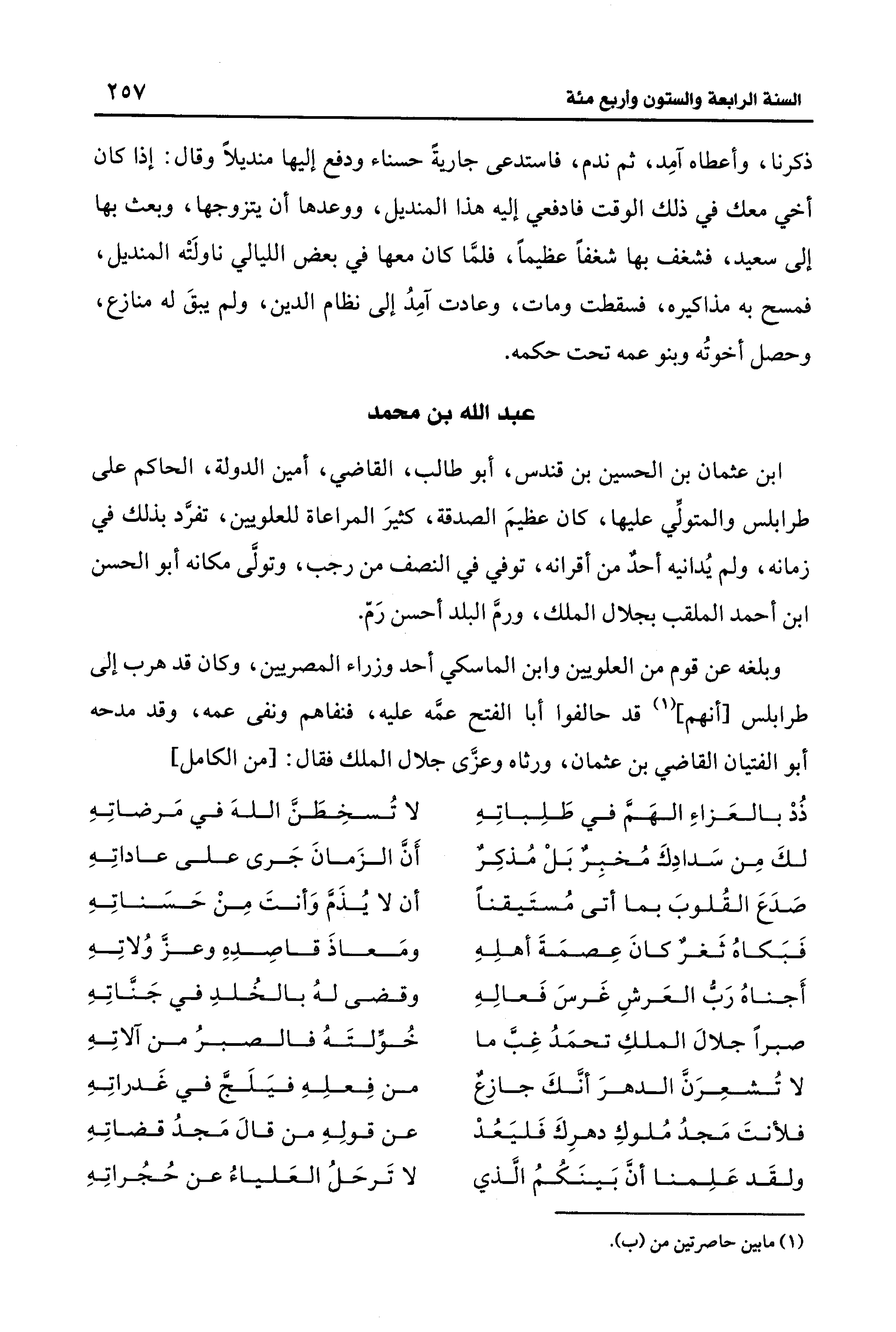 وبلغه عن قوم من العلويين وابن الماسكي أحد وزراء المصريين، وكان قد هرب إلى طرابلس [أنهم] (¬1) قد حالفوا أبا الفتح عمَّه عليه، فنفاهم ونفى عمه، وقد مدحه أبو الفتيان القاضي بن عثمان، ورثاه وعزَّى جلال الملك فقال: [من الكامل]