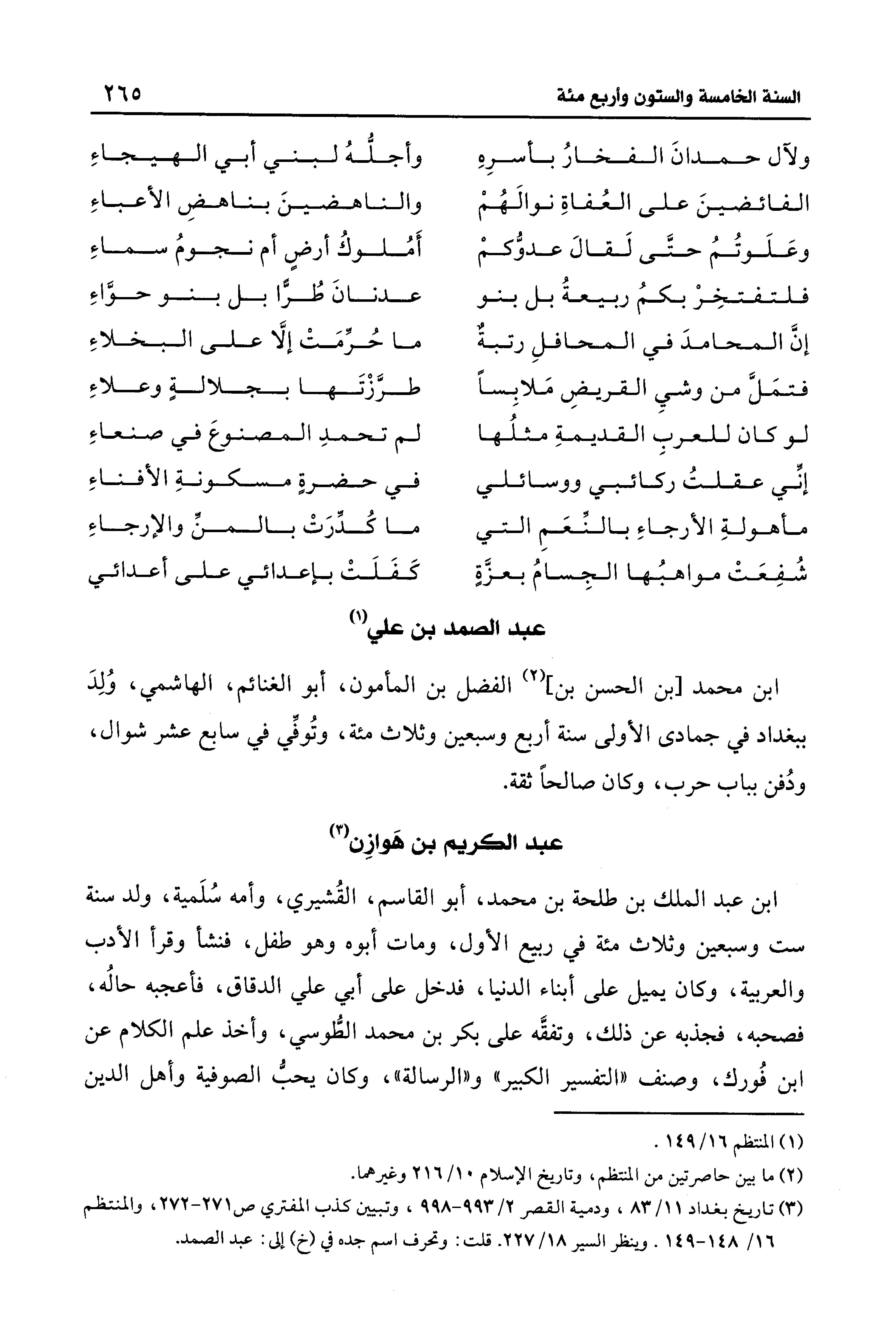 (¬3) تاريخ بغداد 11/ 83، ودمية القصر 2/ 993 - 998، وتبيين كذب المفتري ص 271 - 272، والمنتظم 16/ 148 - 149. وينظر السير 18/ 227. قلت: وتحرف اسم جده في (خ) إلى: عبد الصمد.