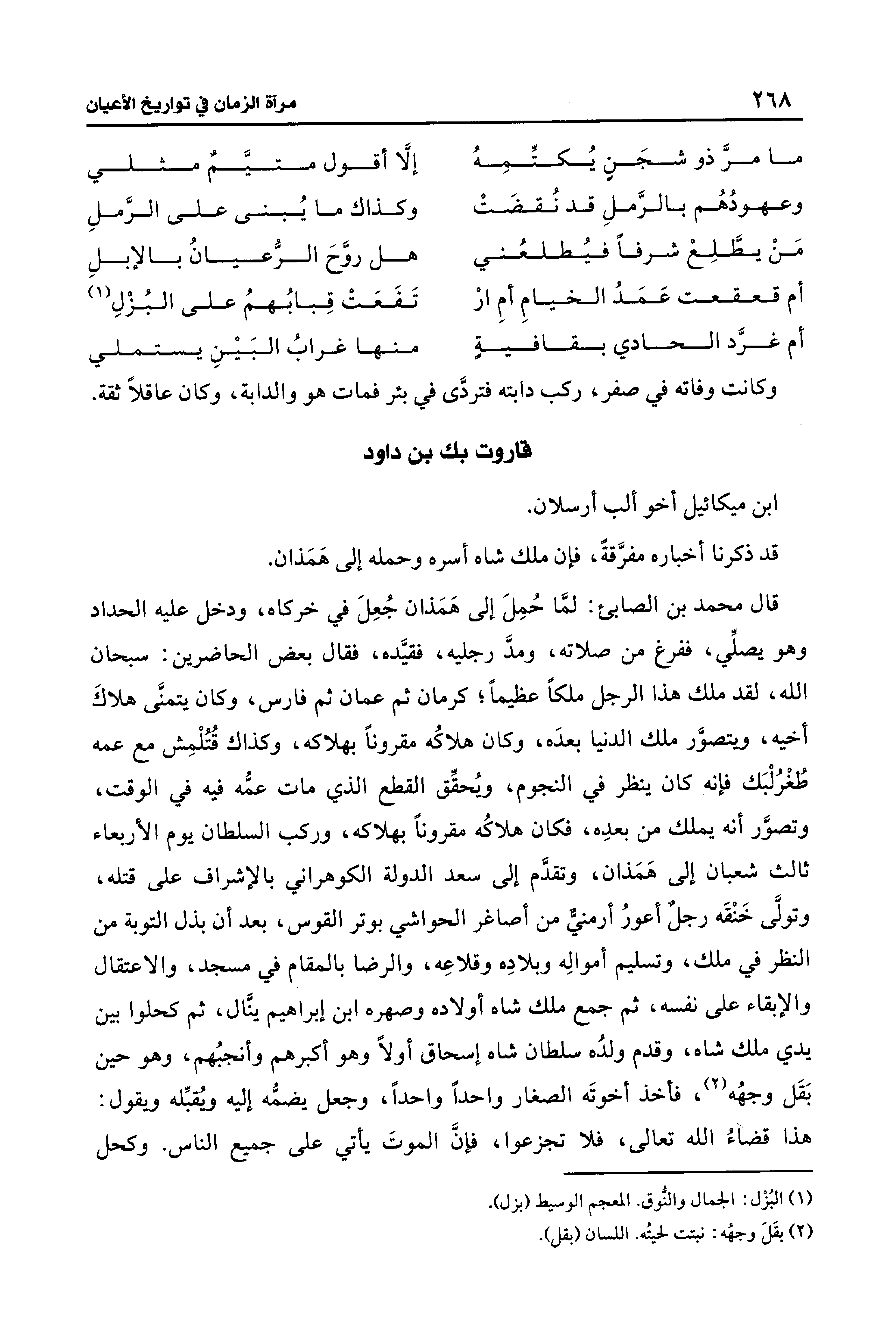 قال محمد بن الصابئ: لمَّا حُمِلَ إلى هَمَذان جُعِلَ في خركاه، ودخل عليه الحداد وهو يصلِّي، ففرغ من صلاته، ومدَّ رجليه، فقيَّده، فقال بعض الحاضرين: سبحان الله، لقد ملك هذا الرجل ملكًا عظيمًا؛ كرمان ثم عثمان ثم فارس، وكان يتمنَّى هلاكَ أخيه، ويتصوَّر ملك الدنيا بعدَه، وكان هلاكُه مقرونًا بهلاكه، وكذاك قُتُلْمِش مع عمه طُغْرُلْبَك فإنه كان ينظر في النجوم، ويُحقِّق القطع الَّذي مات عمُّه فيه في الوقت، وتصوَّر أنَّه يملك من بعدِه، فكان هلاكُه مقرونًا بهلاكه، وركب السلطان يوم الأربعاء ثالث شعبان إلى هَمَذان، وتقدَّم إلى سعد الدولة الكوهراني بالإشراف على قتله، وتولَّى خَنْقَه رجلٌ أعورُ أرمنيٌّ من أصاغر الحواشي بوتر القوس، بعد أن بذل التوبة من النظر في ملك، وتسليم أموالِه وبلادِه وقلاعِه، والرضا بالمقام في مسجد، والاعتقال والإبقاء على نفسه، ثم جمع ملك شاه أولاده وصهره ابن إبراهيم ينَّال، ثم كحلوا بين يدي ملك شاه، وقدم ولدُه سلطان شاه إسحاق أولًا وهو أكبرهم وأنجبُهم، وهو حين بَقَل وجهُه (¬2)، فأخذ أخوتَه الصغار واحدًا واحدًا، وجعل يضمُّه إليه ويُقبِّله ويقول: هذا قضاءُ الله تعالى، فلا تجزعوا، فإنَّ الموتَ يأتي على جميع الناس. وكحل