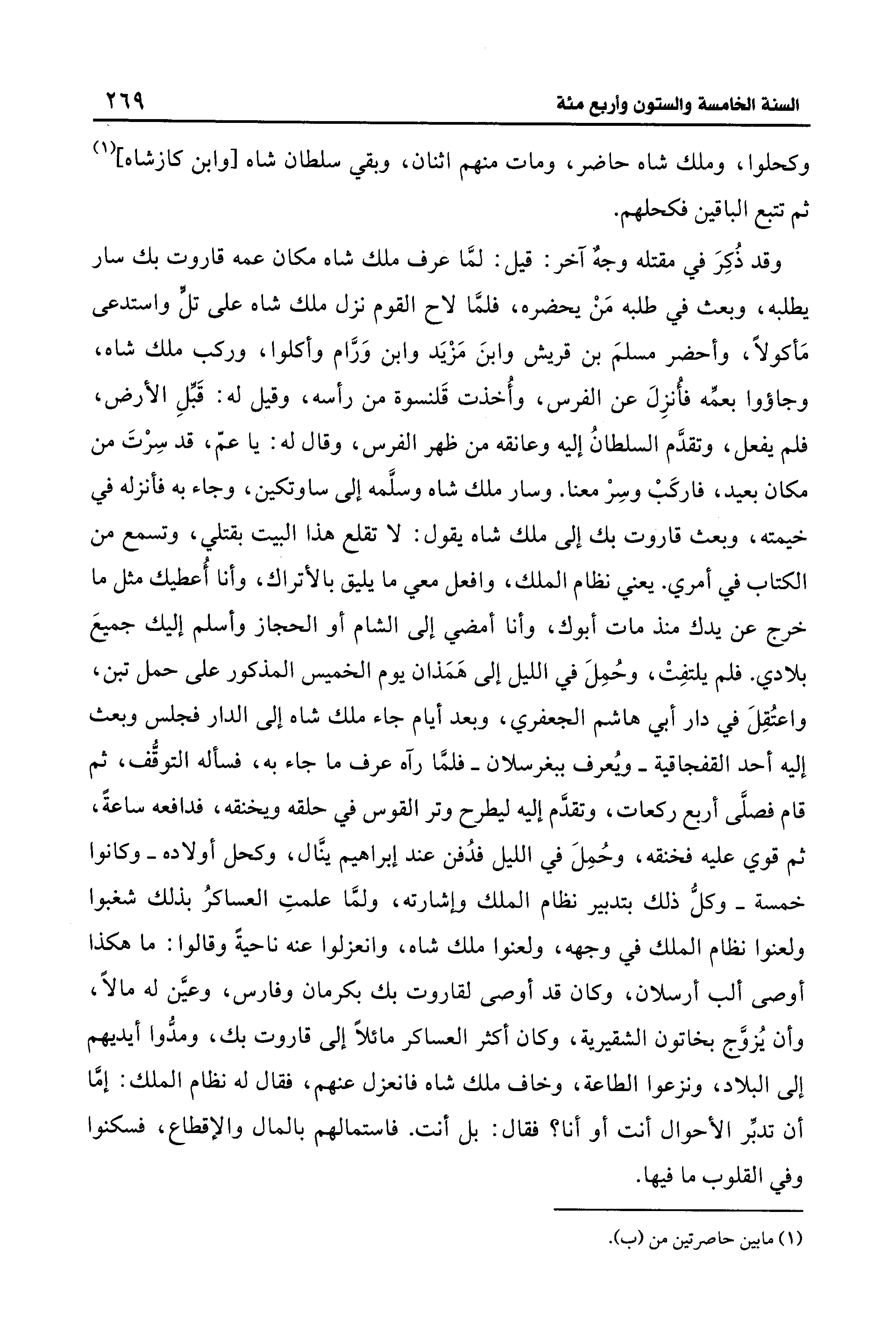 وقد ذُكِرَ في مقتله وجهٌ آخر: قيل: لمَّا عرف ملك شاه مكان عمه قاروت بك سار يطلبه، وبعث في طلبه مَنْ يحضره، فلمَّا لاح القوم نزل ملك شاه على تلٍّ واستدعى مَأكولًا، وأحضر مسلمَ بن قريش وابنَ مَزْيَد وابن وَرَّام وأكلوا، وركب ملك شاه، وجاؤوا بعمِّه فأُنزِلَ عن الفرس، وأُخذت قَلنسوة من رأسه، وقيل له: قَبِّلِ الأرض، فلم يفعل، وتقدَّم السلطانُ إليه وعانقه من ظهر الفرس، وقال له: يا عمّ، قد سِرْتَ من مكان بعيد، فاركَبْ وسِرْ معنا. وسار ملك شاه وسلَّمه إلى ساوتكين، وجاء به فأنزله في خيمته، وبعث قاروت بك إلى ملك شاه يقول: لا تقلع هذا البيت بقتلي، وتسمع من الكتاب في أمري. يعني نظام الملك، وافعل معي ما يليق بالأتراك، وأنا أُعطيك مثل ما خرج عن يدك منذ مات أبوك، وأنا أمضي إلى الشام أو الحجاز وأسلم إليك جميعَ بلادي. فلم يلتفِتْ، وحُمِلَ في الليل إلى هَمَذان يوم الخميس المذكور على حمل تبن، واعتُقِلَ في دار أبي هاشم الجعفري، وبعد أيام جاء ملك شاه إلى الدار فجلس وبعث إليه أحد القفجاقية -ويعرف ببغرسلان- فلمَّا رآه عرف ما جاء به، فسأله التوقُّف، ثم قام فصلَّى أربع ركعات، وتقدَّم إليه ليطرح وتر القوس في حلقه ويخنقه، فدافعه ساعةً، ثم قوي عليه فخنقه، وحُمِلَ في الليل فدُفن عند إبراهيم ينَال، وكحل أولاده -وكانوا خمسة- وكلُّ ذلك بتدبير نظام الملك وإشارته، ولمَّا علمتِ العساكرُ بذلك شغبوا ولعنوا نظام الملك في وجهه، ولعنوا ملك شاه، وانعزلوا عنه ناحيةً وقالوا: ما هكذا أوصى ألب أرسلان، وكان قد أوصى لقاروت بك بكرمان وفارس، وعيَّن له مالًا، وأن يُزوَّج بخاتون الشقيرية، وكان أكثر العساكر مائلًا إلى قاروت بك، ومدُّوا أيديهم إلى البلاد، ونزعوا الطاعة، وخاف ملك شاه فانعزل عنهم، فقال له نظام الملك: إمَّا أن تدبِّر الأحوال أنت أو أنا؟ فقال: بل أنت. فاستمالهم بالمال والإقطاع، فسكنوا وفي القلوب ما فيها.