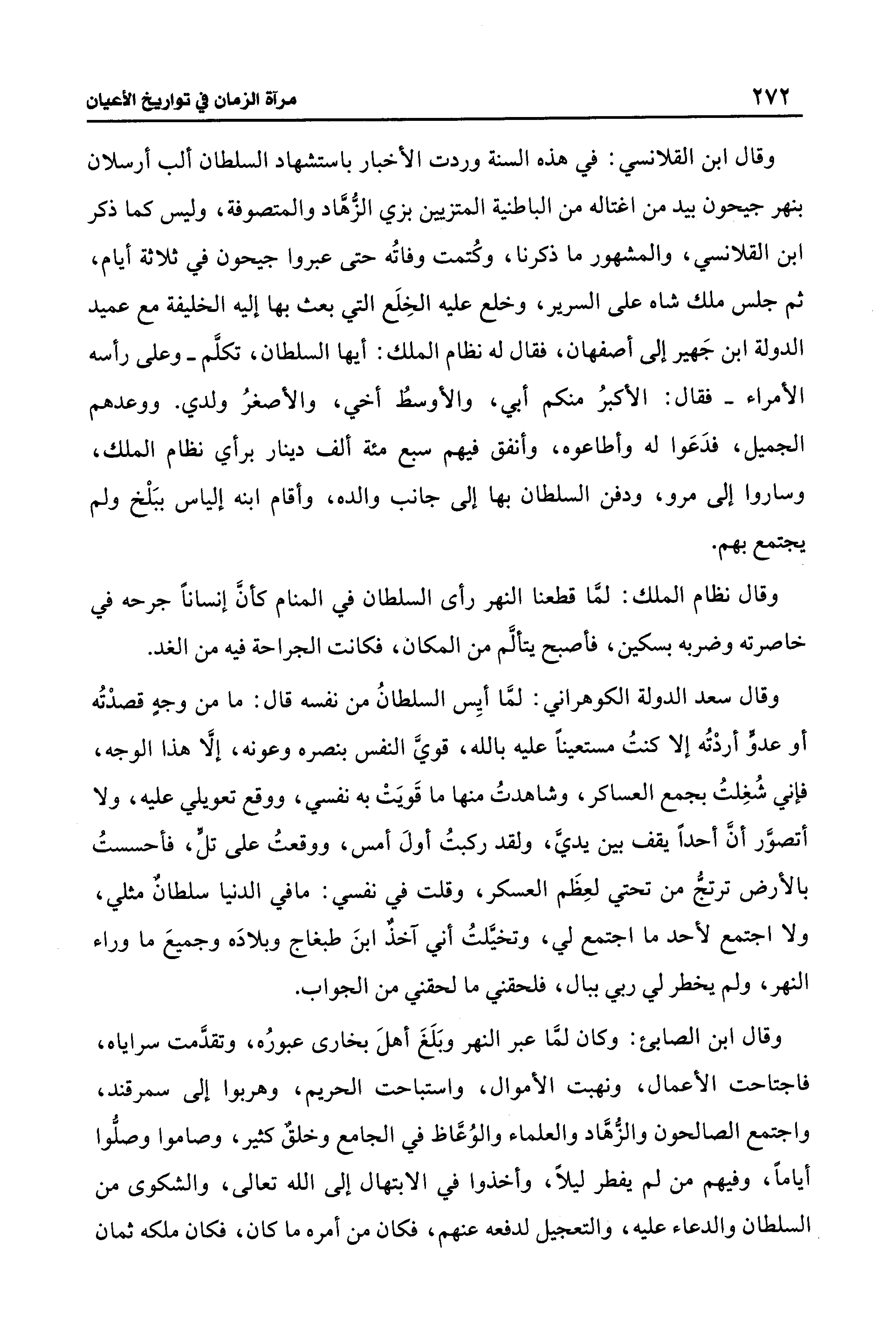 وقال ابن القلانسي: في هذه السنة وردت الأخبار باستشهاد السلطان ألب أرسلان بنهر جيحون بيد من اغتاله من الباطنية المتزيين بزي الزهَّاد والمتصوفة، وليس كما ذكر ابن القلانسي، والمشهور ما ذكرنا، وكُتمت وفاتُه حتَّى عبروا جيحون في ثلاثة أيام، ثم جلس ملك شاه على السرير، وخلع عليه الخِلَع التي بعث بها إليه الخليفة مع عميد الدولة ابن جَهير إلى أصفهان، فقال له نظام الملك: أيها السلطان، تكلَّم -وعلى رأسه الأمراء- فقال: الأكبرُ منكم أبي، والأوسطُ أخي، والأصغرُ ولدي. ووعدهم الجميل، فدَعَوا له وأطاعوه، وأنفق فيهم سبع مئة ألف دينار برأي نظام الملك، وساروا إلى مرو، ودفن السلطان بها إلى جانب والده، وأقام ابنه إلياس ببَلْخ ولم يجتمع بهم.