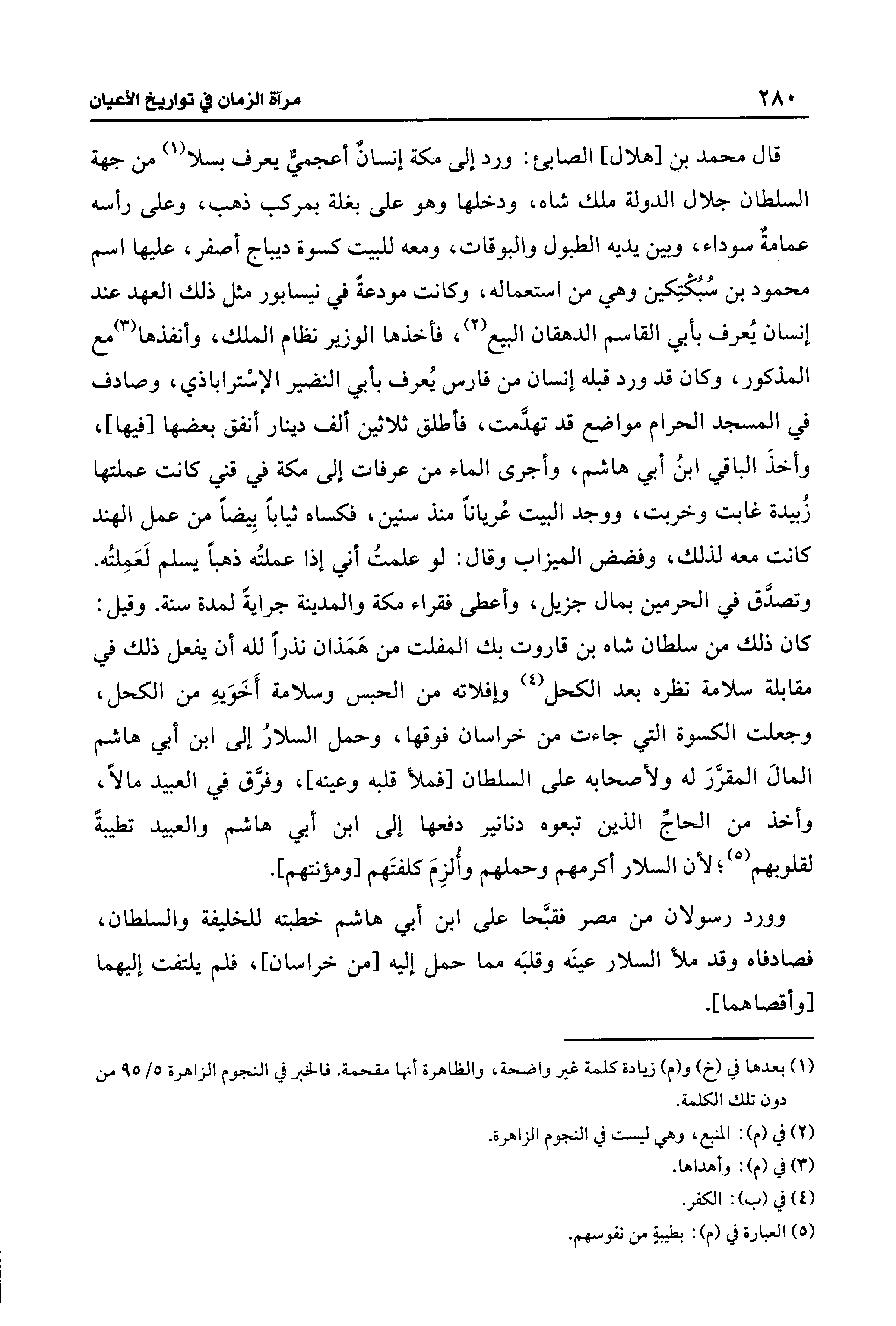 قال محمد بن [هلال] الصابئ: ورد إلى مكة إنسان أعجميّ يعرف بسلا (¬1) من جهة السلطان جلال الدولة ملك شاه، ودخلها وهو على بغلة بمركب ذهب، وعلى رأسه عمامةٌ سوداء، وبين يديه الطبول والبوقات، ومعه للبيت كسوة ديباج أصفر، عليها اسم محمود بن سُبُكْتِكين وهي من استعماله، وكانت مودعةً في نيسابور مثل ذلك العهد عند إنسان يُعرف بأبي القاسم الدهقان البيع (¬2)، فأخذها الوزير نظام الملك، وأنفذها (¬3) مع المذكور، وكان قد ورد قبله إنسان من فارس يُعرف بأبي النضير الإسْتراباذي، وصادف في المسجد الحرام مواضع قد تهدَّمت، فأطلق ثلاثين ألف دينار أنفق بعضها [فيها]، وأخذَ الباقي ابنُ أبي هاشم، وأجرى الماء من عرفات إلى مكة في قني كانت عملتها زُبيدة غابت وخربت، ووجد البيت عُريانًا منذ سنين، فكساه ثيابًا بِيضًا من عمل الهند كانت معه لذلك، وفضض الميزاب وقال: لو علمتُ أني إذا عملتُه ذهبًا يسلم لَعَمِلتُه. وتصدَّق في الحرمين بمال جزيل، وأعطى فقراء مكة والمدينة جرايةً لمدة سنة. وقيل: كان ذلك من سلطان شاه بن قاروت بك المفلت من همَذان نذرًا لله أن يفعل ذلك في مقابلة سلامة نظره بعد الكحل (¬4) وإفلاته من الحبس وسلامة أَخَوَيهِ من الكحل، وجعلت الكسوة التي جاءت من خراسان فوقها، وحمل السلارُ إلى ابن أبي هاشم المال المقرَّرَ له ولأصحابه على السلطان [فملأ قلبه وعينه]، وفرَّق في العبيد مالًا، وأخذ من الحاجّ الذين تبعوه دنانير دفعها إلى ابن أبي هاشم والعبيد تطيبةً لقلوبهم (¬5)؛ لأن السلار أكرمهم وحملهم وأُلزِمَ كلفتَهم [ومؤنتهم].