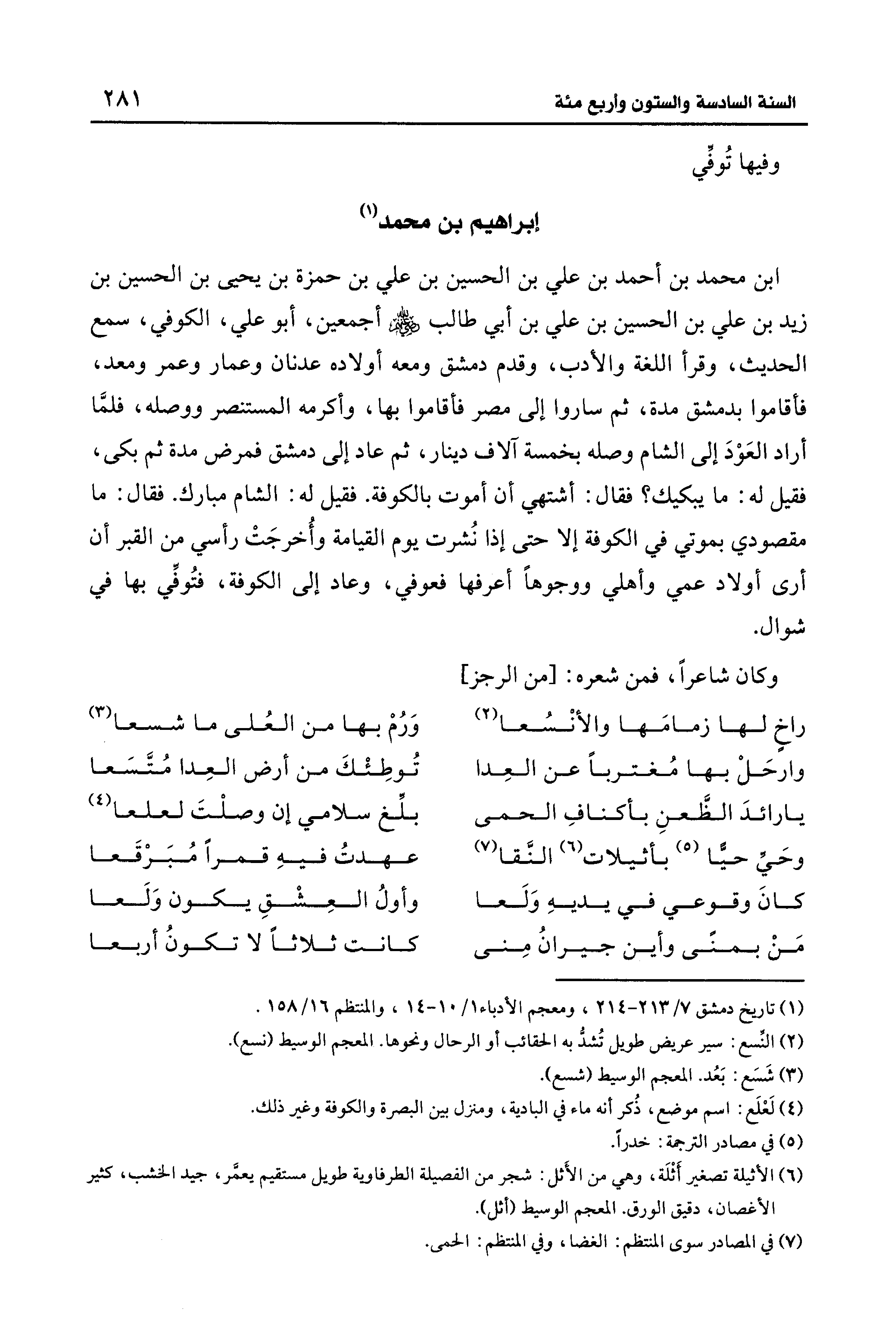 ابن محمد بن أحمد بن علي بن الحسين بن علي بن حمزة بن يحيى بن الحسين بن زيد بن علي بن الحسين بن علي بن أبي طالب - رضي الله عنهم - أجمعين، أبو علي، الكوفي، سمع الحديث، وقرأ اللغة والأدب، وقدم دمشق ومعه أولاده عدنان وعمار وعمر ومعد، فأقاموا بدمشق مدة، ثم ساروا إلى مصر فأقاموا بها، وأكرمه المستنصر ووصله، فلمَّا أراد العَوْدَ إلى الشام وصله بخمسة آلاف دينار، ثم عاد إلى دمشق فمرض مدة ثم بكى، فقيل له: ما يبكيك؟ فقال: أشتهي أن أموت بالكوفة. فقيل له: الشام مبارك. فقال: ما مقصودي بموتي في الكوفة إلا حتى إذا نُشرت يوم القيامة وأُخرجَتْ رأسي من القبر أن أرى أولاد عمي وأهلي ووجوهًا أعرفها فعوفي، وعاد إلى الكوفة، فتُوفي بها في شوال.