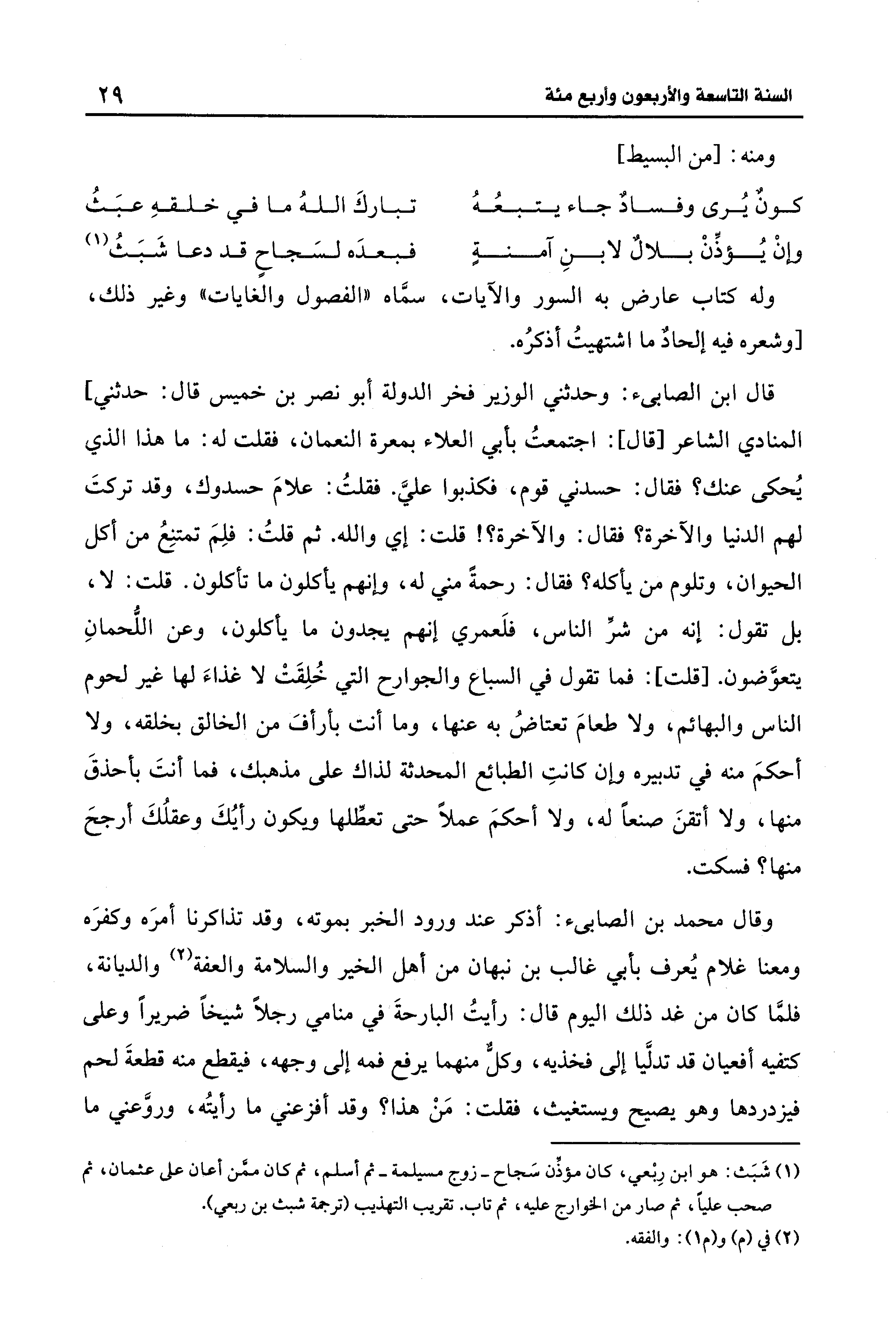 قال ابن الصابئ: وحدثني الوزير فخر الدولة أبو نصر بن خميس قال: حدثني] المنادي الشاعر [قال]: اجتمعتُ بأبي العلاء بمعرة النعمان، فقلت له: ما هذا الذي يُحكى عنك؟ فقال: حسدني قوم، فكذبوا عليَّ. فقلتُ: علامَ حسدوك، وقد تركتَ لهم الدنيا والآخرة؟ فقال: والآخرة؟ ! قلت: إي والله. ثم قلتُ: فلِمَ تمتنِعُ من أكل الحيوان، وتلوم من يأكله؟ فقال: رحمةً مني له، وإنهم يأكلون ما تأكلون. قلت: لا، بل تقول: إنه من شرِّ الناس، فلَعمري إنهم يجدون ما يأكلون، وعن اللُّحمانِ يتعوَّضون. [قلت]: فما تقول في السباع والجوارح التي خُلِقَتْ لا غذاءَ لها غير لحوم الناس والبهائم، ولا طعامَ تعتاضُ به عنها، وما أنت بأرأفَ من الخالق بخلقه، ولا أحكمَ منه في تدبيره وإن كانتِ الطبائع المحدثة لذاك على مذهبك، فما أنتَ بأحذقَ منها، ولا أتقنَ صنعًا له، ولا أحكمَ عملًا حتى تعطِّلها ويكون رأيُكَ وعقلُكَ أرجحَ منها؟ فسكت.
