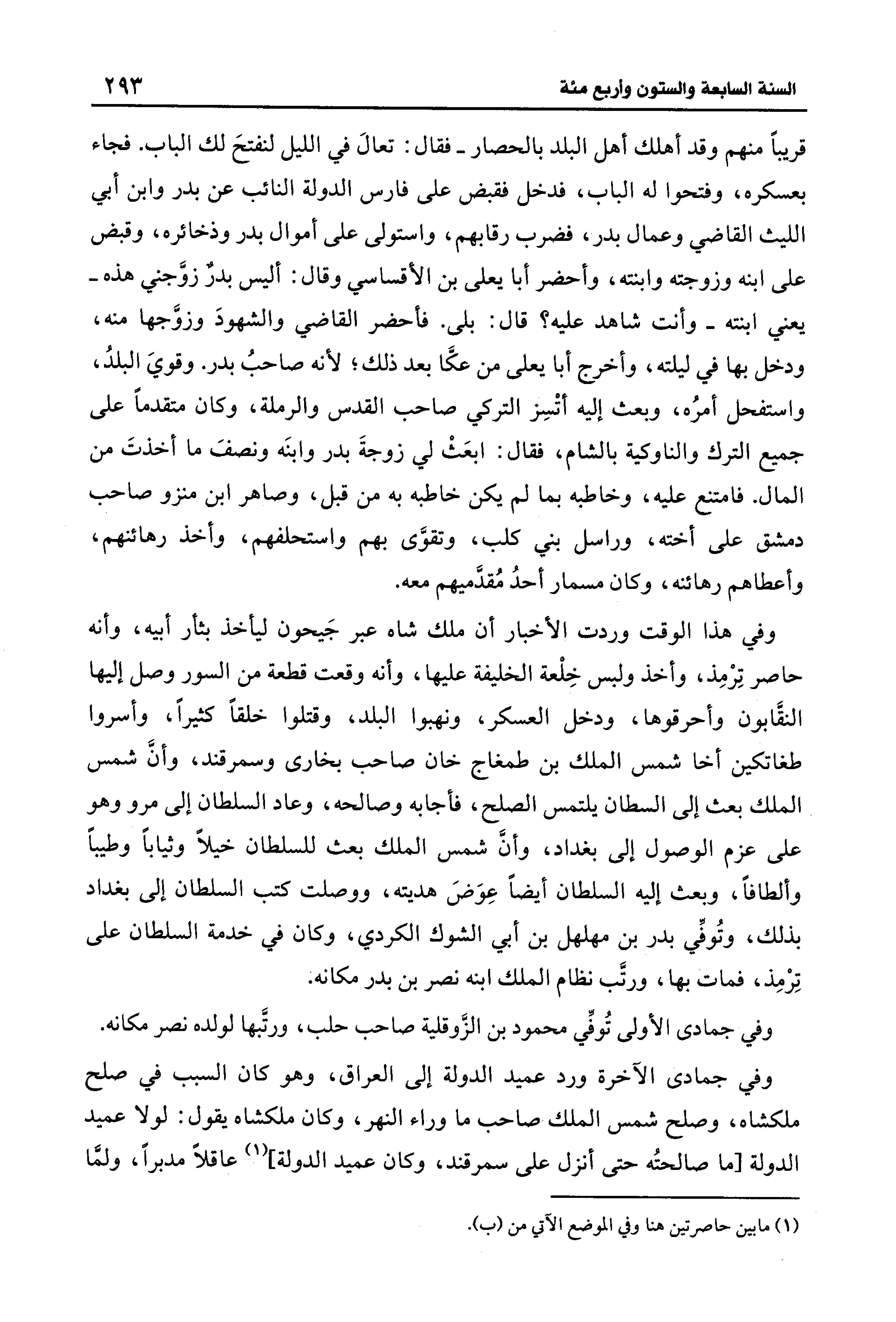 وفي هذا الوقت وردت الأخبار أن ملك شاه عبر جَيحون لياخذ بثأر أبيه، وأنه حاصر ترمِذ، وأخذ ولبس خِلْعة الخليفة عليها، وأنه وقعت قطعة من السور وصل إليها النقَّابون وأحرقوها، ودخل العسكر، ونهبوا البلد، وقتلوا خلقًا كثيرًا، وأسروا طغاتكين أخا شمس الملك بن طمغاج خان صاحب بخارى وسمرقند، وأنَّ شمس الملك بعث إلى السطان يلتمس الصلح، فأجابه وصالحه، وعاد السلطان إلى مرو وهو على عزم الوصول إلى بغداد، وأنَّ شمس الملك بعث للسلطان خيلًا وثيابًا وطيبًا وألطافًا، وبعث إليه السلطان أيضًا عِوَضَ هديته، ووصلت كتب السلطان إلى بغداد بذلك، وتُوفِّي بدر بن مهلهل بن أبي الشوك الكردي، وكان في خدمة السلطان على تِرمِذ، فمات بها، ورتَّب نظام الملك ابنه نصر بن بدر مكانه.