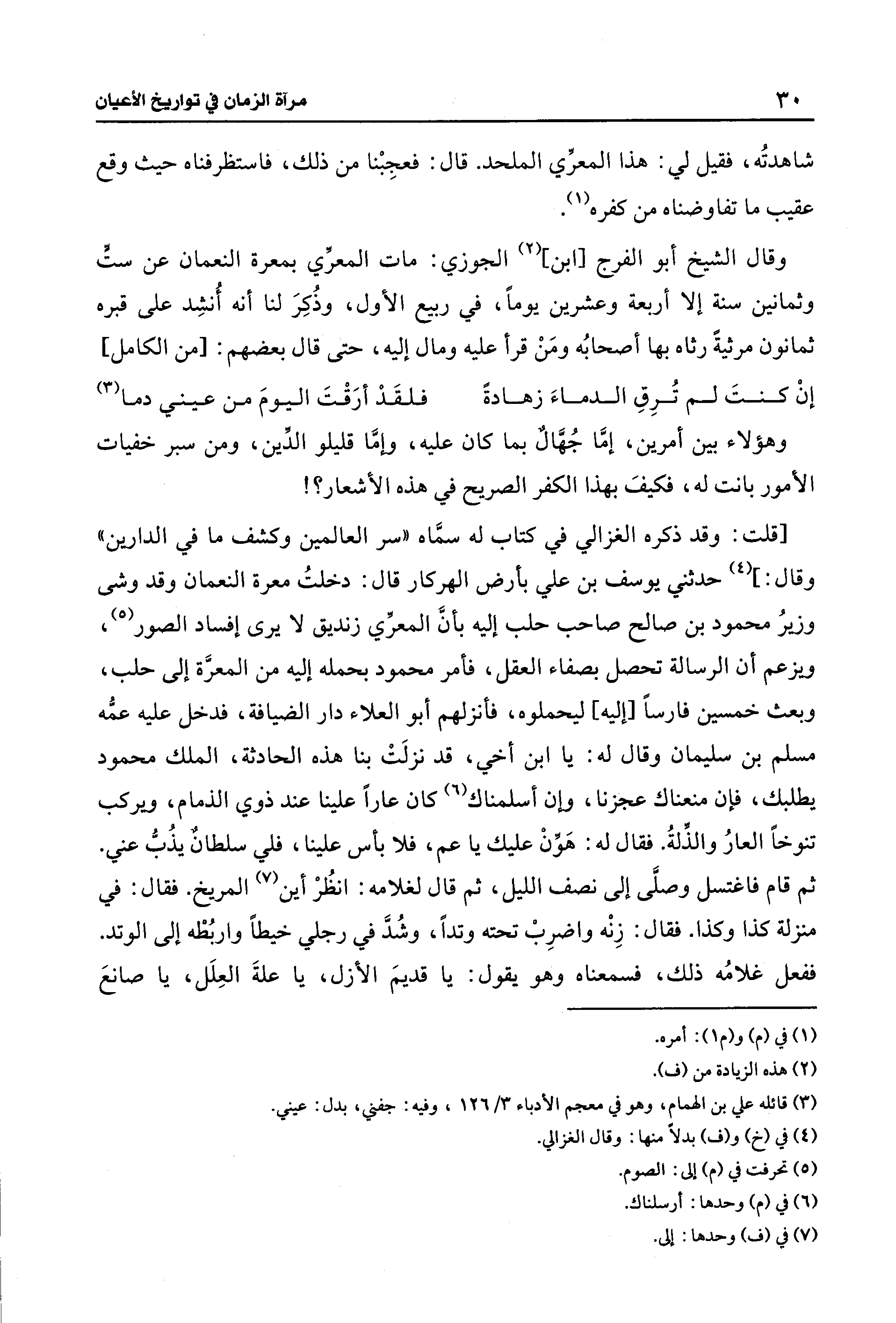 [قلت: وقد ذكره الغزالي في كتاب له سمَّاه "سر العالمين وكشف ما في الدارين" وقال: ] (¬4) حدثني يوسف بن علي بأرض الهركار قال: دخلتُ معرة النعمان وقد وشى وزيرُ محمود بن صالح صاحب حلب إليه بأنَّ المعرِّي زنديق لا يرى إفساد الصور (¬5)، ويزعم أن الرسالة تحصل بصفاء العقل، فأمر محمود بحمله إليه من المعرَّة إلى حلب، وبعث خمسين فارسًا [إليه] ليحملوه، فأنزلهم أبو العلاء دار الضيافة، فدخل عليه عمُّه مسلم بن سليمان وقال له: يا ابن أخي، قد نزلَتْ بنا هذه الحادثة، الملك محمود يطلبك، فإن منعناك عجزنا، وان أسلمناك (¬6) كان عارًا علينا عند ذوي الذمام، ويركب تنوخًا العارُ والذِّلةُ. فقال له: هَوِّنْ عليك يا عم، فلا بأس علينا، فلي سلطانٌ يذُبُّ عني. ثم قام فاغتسل وصلَّى إلى نصف الليل، ثم قال لغلامه: انظُرْ أين (¬7) المريخ. فقال: في منزلة كذا وكذا. فقال: زِنْه واضرِبْ تحته وتدًا، وشُدَّ في رجلي خيطًا واربُطْه إلى الوتد. ففعل غلامُه ذلك، فسمعناه وهو يقول: يا قديمَ الأزل، يا علةَ العِلَل، يا صانعَ