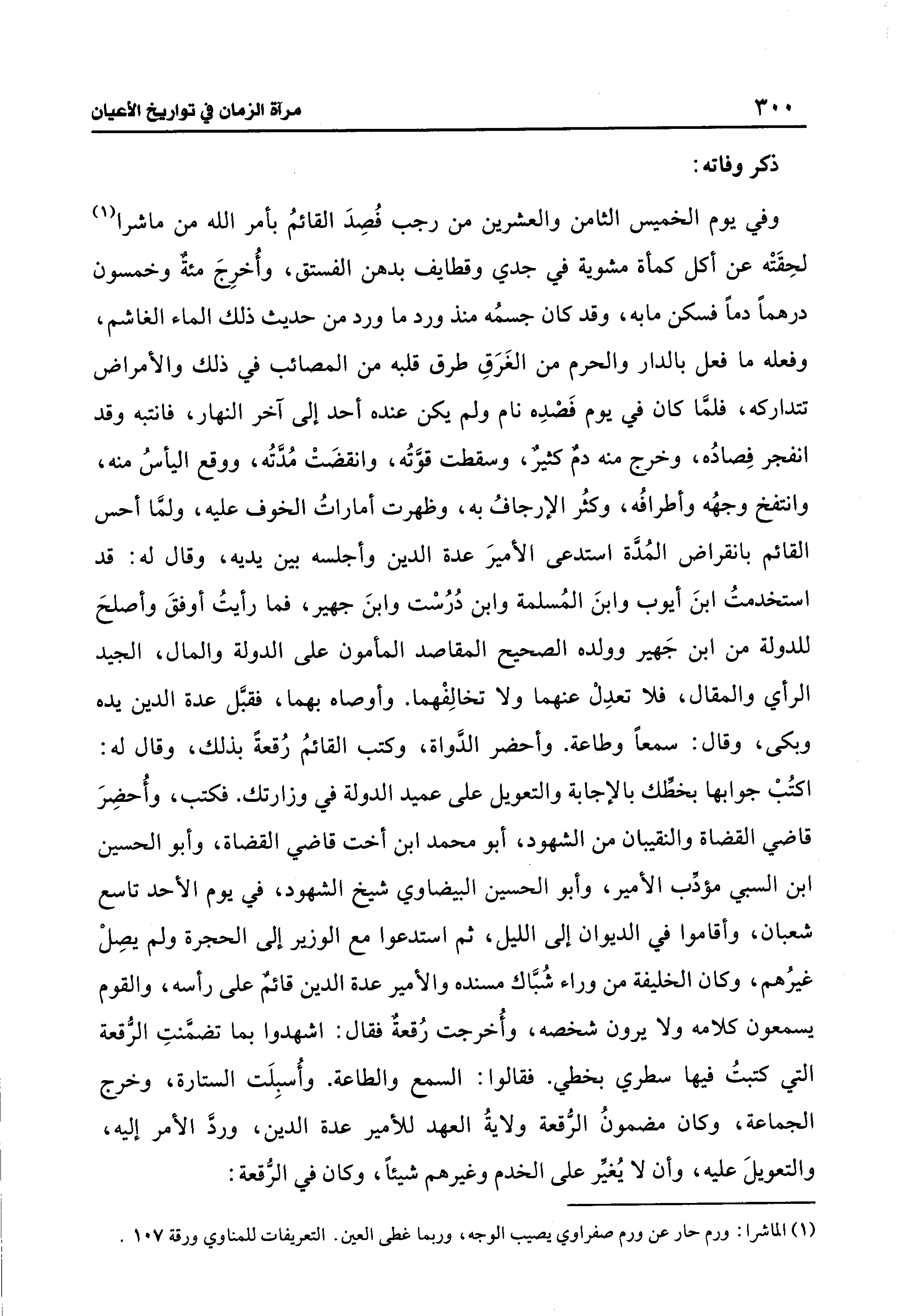 وفي يوم الخميس الثامن والعشرين من رجب فُصِدَ القائمُ بأمر الله من ماشرا (¬1) لحِقَتْه عن أكل كمأة مشوية في جدي وقطايف بدهن الفستق، وأُخرِجَ مئة وخمسون درهمًا دمًا فسكن مابه، وقد كان جسمُه منذ ورد ما ورد من حديث ذلك الماء الغاشم، وفعله ما فعل بالدار والحرم من الغَرَقِ طرق قلبه من المصائب في ذلك والأمراض تتداركه، فلمَّا كان في يوم فَضدِه نام ولم يكن عنده أحد إلى آخر النهار، فانتبه وقد انفجر فِصادُه، وخرج منه دمٌ كثيرٌ، وسقطت قوَّتُه، وانقضَتْ مُدَّتُه، ووقع اليأسُ منه، وانتفخ وجهُه وأطرافُه، وكثُر الإرجافُ به، وظهرت أماراتُ الخوف عليه، ولمَّا أحس القائم بانقراض المُدَّة استدعى الأميرَ عدة الدين وأجلسه بين يديه، وقال له: قد استخدمتُ ابنَ أيوب وابنَ المُسلمة وابن دُرُسْت وابنَ جهير، فما رأيتُ أوفقَ وأصلحَ للدولة من ابن جَهير وولده الصحيح المقاصد المأمون على الدولة والمال، الجيد الرأي والمقال، فلا تعدِلْ عنهما ولا تخالِفْهما. وأوصاه بهما، فقبَّل عدة الدين يده وبكى، وقال: سمعًا وطاعة. وأحضر الدَّواة، وكتب القائمُ رُقعةً بذلك، وقال له: اكتُبْ جوابها بخطِّك بالإجابة والتعويل على عميد الدولة في وزارتك. فكتب، وأُحضِرَ قاضي القضاة والنقيبان من الشهود، أبو محمد ابن أخت قاضي القضاة، وأبو الحسين ابن السبي مؤدِّب الأمير، وأبو الحسين البيضاوي شيخ الشهود، في يوم الأحد تاسع شعبان، وأقاموا في الديوان إلى الليل، ثم استدعوا مع الوزير إلى الحجرة ولم يصِلْ غيرُهم، وكان الخليفة من وراء شُبَّاك مسنده والأمير عدة الدين قائمٌ على رأسه، والقوم يسمعون كلامه ولا يرون شخصه، وأُخرجت رُقعةٌ فقال: اشهدوا بما تضمَّنتِ الرُّقعة التي كتبتُ فيها سطري بخطي. فقالوا: السمع والطاعة. وأُسبِلَت الستارة، وخرج الجماعة، وكان مضمونُ الرُّقعة ولايةُ العهد للأمير عدة الدين، وردَّ الأمر إليه، والتعويلَ عليه، وأن لا يُغيِّر على الخدم وغيرهم شيئًا، وكان في الرُّقعة: