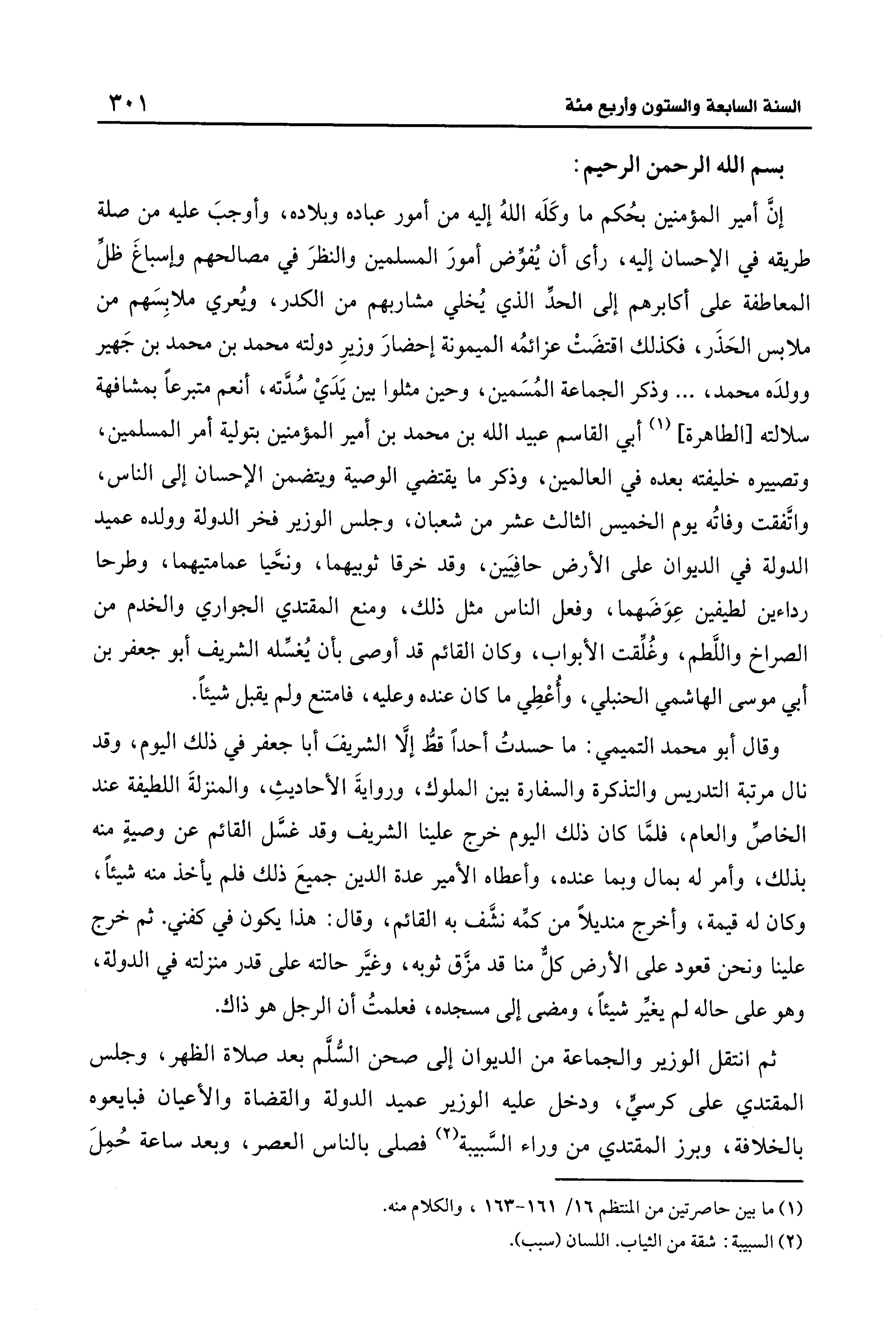 إنَّ أمير المؤمنين بحُكم ما وكَلَه اللهُ إليه من أمور عباده وبلاده، وأوجبَ عليه من صلة طريقه في الإحسان إليه، رأى أن يُفوِّض أمورَ المسلمين والنظرَ في مصالحهم وإسباغَ ظل المعاطفة على أكابرهم إلى الحدِّ الذي يُخلي مشاربهم من الكدر، ويعري ملابِسَهم من ملابس الحَذَر، فكذلك اقتضَتْ عزائمُه الميمونة إحضارَ وزيرِ دولته محمد بن محمد بن جَهير وولدَه محمد، ... وذكر الجماعة المُسَمين، وحين مثلوا بين يَدَي سُدَّته، أنعم متبرعًا بمشافهة سلالته [الطاهرة] (¬1) أبي القاسم عبيد الله بن محمد بن أمير المؤمنين بتولية أمر المسلمين، وتصييره خليفته بعده في العالمين، وذكر ما يقتضي الوصية ويتضمن الإحسان إلى الناس، واتَّفقت وفاتُه يوم الخميس الثالث عشر من شعبان، وجلس الوزير فخر الدولة وولده عميد الدولة في الديوان على الأرض حافِيَين، وقد خرقا ثوبيهما، ونحَّيا عمامتيهما، وطرحا رداءين لطيفين عِوَضَهما، وفعل الناس مثل ذلك، ومنع المقتدي الجواري والخدم من الصراخ واللَّطم، وغُلِّقت الأبواب، وكان القائم قد أوصى بأن يُغسِّله الشريف أبو جعفر بن أبي موسى الهاشمي الحنبلي، وأُعْطِي ما كان عنده وعليه، فامتنع ولم يقبل شيئًا.