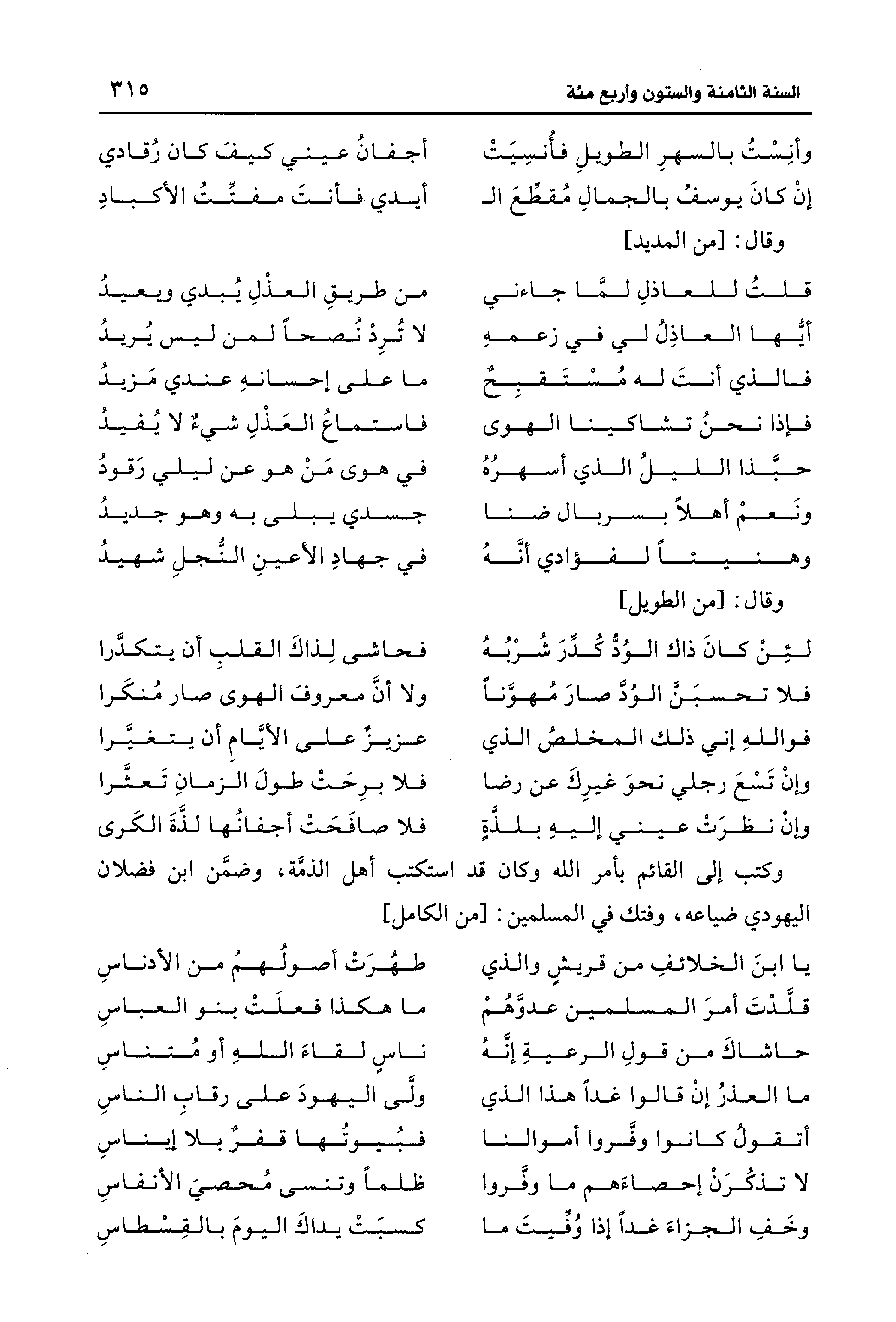 وكتب إلى القائم بأمر الله وكان قد ستكتب أهل الذمَّة، وضمَّن ابن فضلان اليهودي ضياعه، وفتك في المسلمين: [من الكامل]