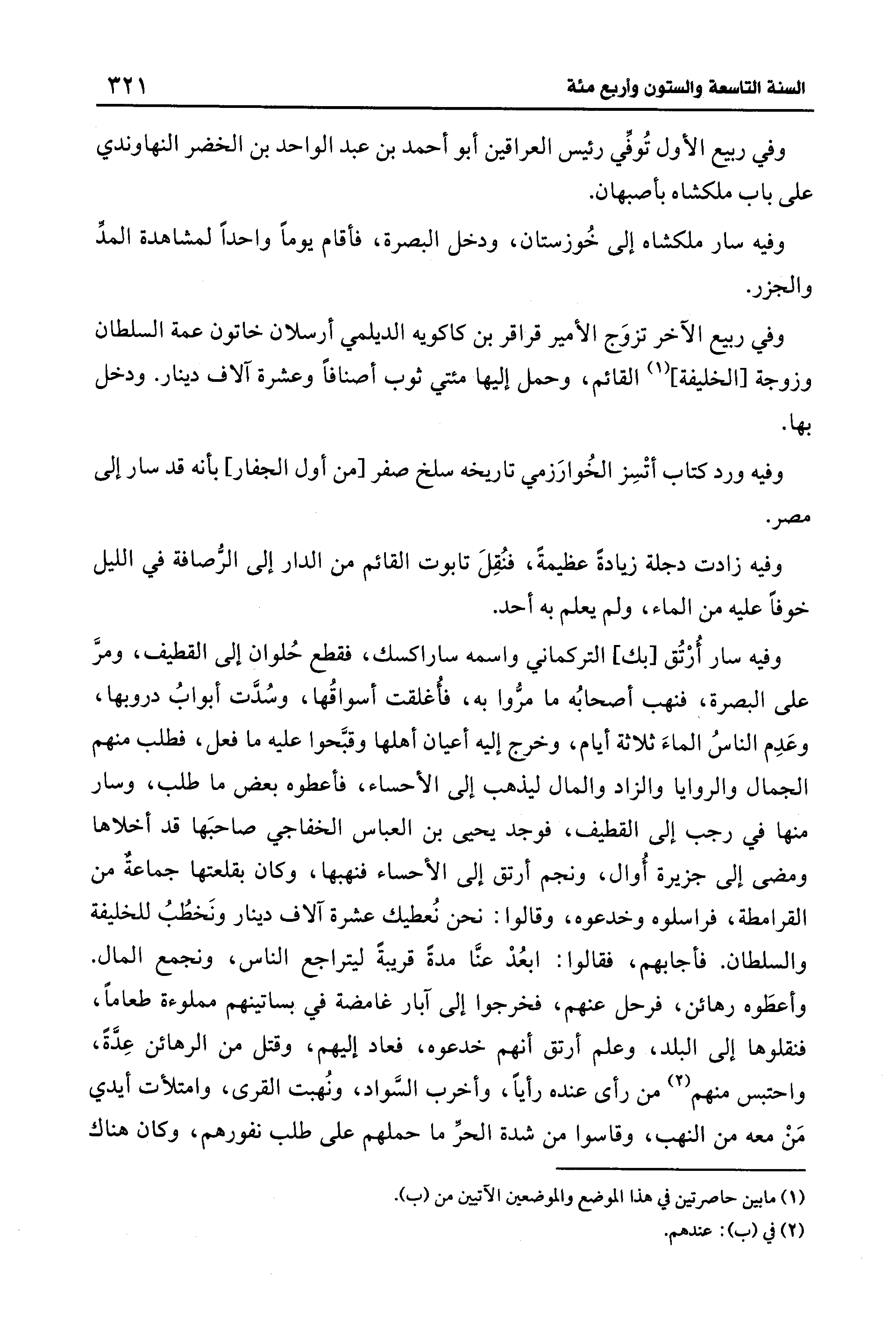 وفيه سار أُرْتُق [بك] التركماني واسمه ساراكسك، فقطع حُلوان إلى القطيف، ومرَّ على البصرة، فنهب أصحابُه ما مرُّوا به، فأغلقت أسواقُها، وسُدَّت أبوابُ دروبها، وعَدِم الناسُ الماءَ ثلاثة أيام، وخرج إليه أعيان أهلها وقبَّحوا عليه ما فعل، فطلب منهم الجمال والروايا والزاد والمال ليذهب إلى الأحساء، فأعطوه بعض ما طلب، وسار منها في رجب إلى القطيف، فوجد يحيى بن العباس الخفاجي صاحبَها قد أخلاها ومضى إلى جزيرة أُوال، ونجم أرتق إلى الأحساء فنهبها، وكان بقلعتها جماعةٌ من القرامطة، فراسلوه وخدعوه، وقالوا: نحن نُعطيك عشرة آلاف دينار ونَخطُبُ للخليفة والسلطان. فأجابهم، فقالوا: ابعُدْ عنَّا مدة قريبة ليتراجع الناس، ونجمع المال. وأعطَوه رهائن، فرحل عنهم، فخرجوا إلى آبار غامضة في بساتينهم مملوءة طعامًا، فنقلوها إلى البلد، وعلم أرتق أنهم خدعوه، فعاد إليهم، وقتل من الرهائن عِدَّة، واحتبس منهم (¬2) من رأى عنده رأيًا، وأخرب السَّواد، ونُهبت القرى، وامتلأت أيدي مَنْ معه من النهب، وقاسوا من شدة الحرِّ ما حملهم على طلب نفورهم، وكان هناك