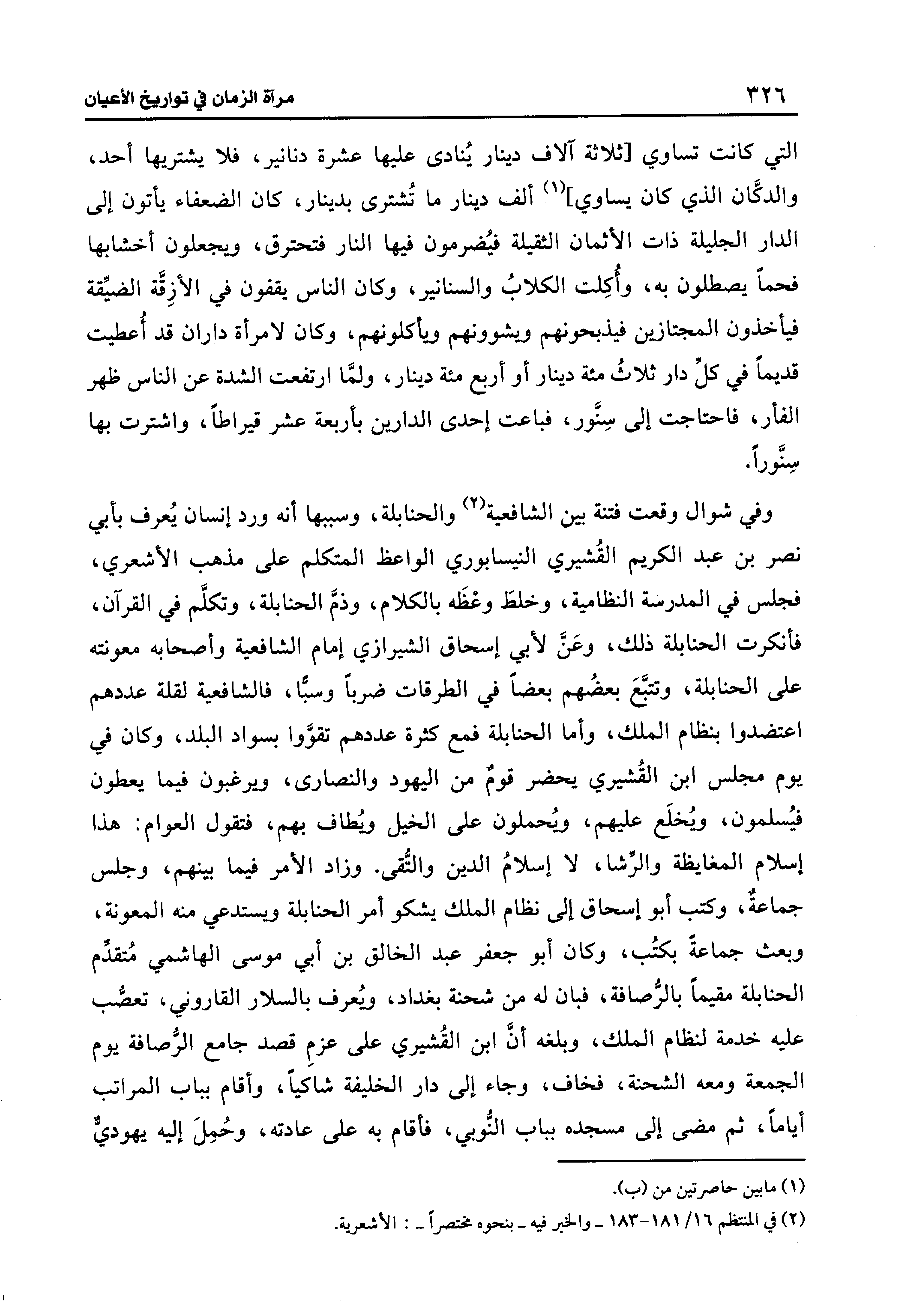 وفي شوال وقعت فتنة بين الشافعية (¬2) والحنابلة، وسببها أنه ورد إنسان يُعرف بأبي نصر بن عبد الكريم القُشيري النيسابوري الواعظ المتكلم على مذهب الأشعري، فجلس في المدرسة النظامية، وخلطَ وعْظَه بالكلام، وذمَّ الحنابلة، وتكلَّم في القرآن، فأنكرت الحنابلة ذلك، وعَنَّ لأبي إسحاق الشيرازي إمام الشافعية وأصحابه معونته على الحنابلة، وتتبَّعَ بعضُهم بعضًا في الطرقات ضربًا وسبًّا، فالشافعية لقلة عددهم اعتضدوا بنظام الملك، وأما الحنابلة فمع كثرة عددهم تقوَّوا بسواد البلد، وكان في يوم مجلس ابن القُشيري يحضر قومٌ من اليهود والنصارى، ويرغبون فيما يعطون فيُسلمون، ويُخلَع عليهم، ويُحملون على الخيل ويُطاف بهم، فتقول العوام: هذا إسلام المغايظة والرِّشا، لا إسلامُ الدين والتُّقى. وزاد الأمر فيما بينهم، وجلس جماعةٌ، وكتب أبو إسحاق إلى نظام الملك يشكو أمر الحنابلة ويستدعي منه المعونة، وبعث جماعةً بكتُب، وكان أبو جعفر عبد الخالق بن أبي موسى الهاشمي مُتقدِّم الحنابلة مقيمًا بالرُّصافة، فبان له من شحنة بغداد، ويعرف بالسلار القاروني، تعصُّب عليه خدمة لنظام الملك، وبلغه أنَّ ابن القُشيري على عزمِ قصد جامع الرُّصافة يوم الجمعة ومعه الشحنة، فخاف، وجاء إلى دار الخليفة شاكيًا، وأقام بباب المراتب أيامًا، ثم مضى إلى مسجده بباب النُّوبي، فأقام به على عادته، وحُمِلَ إليه يهوديٌّ