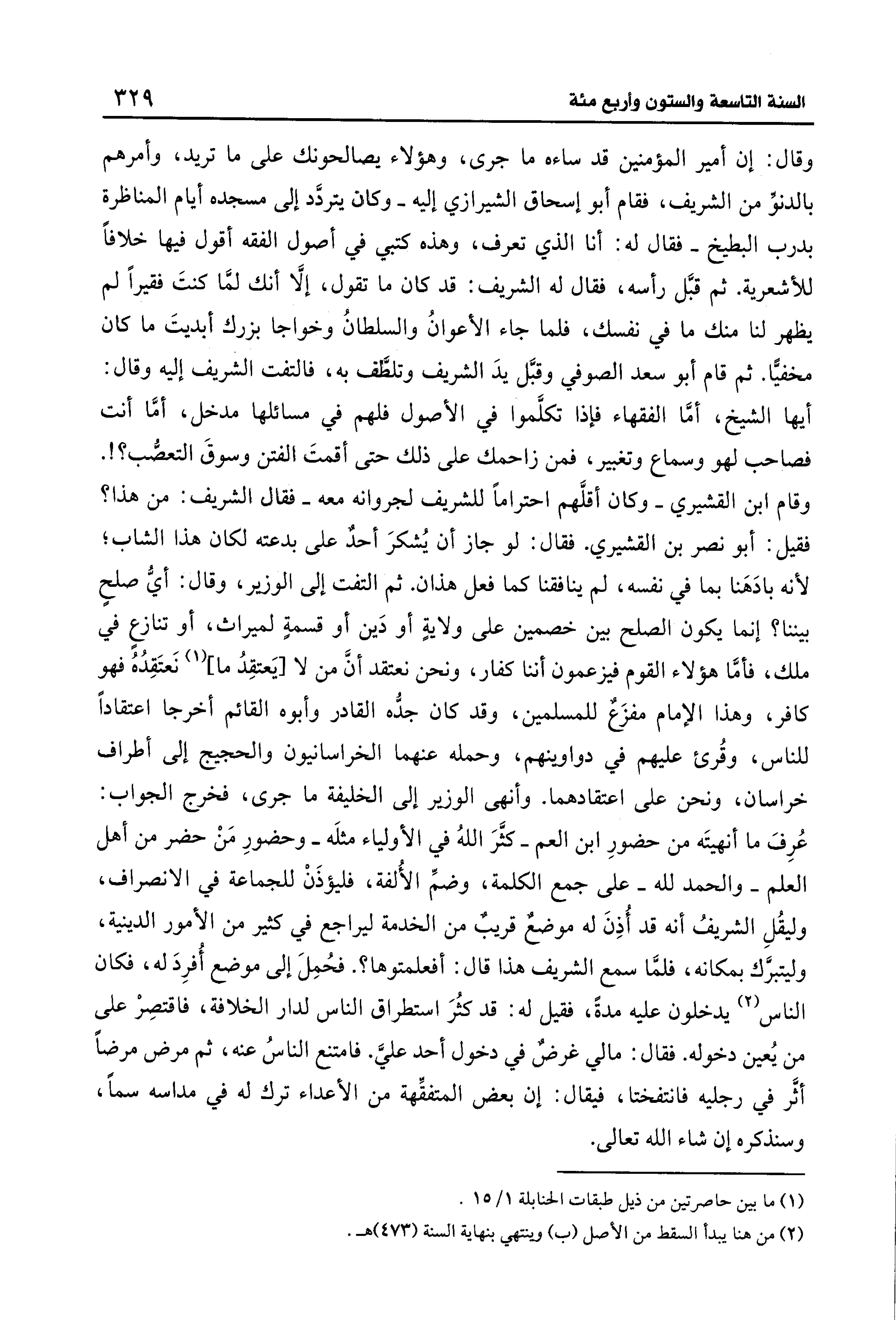 وقال: إن أمير المؤمنين قد ساءه ما جرى، وهؤلاء يصالحونك على ما تريد، وأمرهم بالدنوِّ من الشريف، فقام أبو إسحاق الشيرازي إليه -وكان يتردَّد إلى مسجده أيام المناظرة بدرب البطيخ- فقال له: أنا الَّذي تعرف، وهذه كتبي في أصول الفقه أقول فيها خلافًا للأشعرية. ثم قبَّل رأسه، فقال له الشريف: قد كان ما تقول، إلَّا أنك لمَّا كنتَ فقيرًا لم يظهر لنا منك ما في نفسك، فلما جاء الأعوانُ والسلطانُ وخواجا بزرك أبديتَ ما كان مخفيًّا. ثم قام أبو سعد الصوفي وقبَّل يدَ الشريف وتلطَّف به، فالتفت الشريف إليه وقال: أيها الشيخ، أمَّا الفقهاء فإذا تكلَّموا في الأصول فلهم في مسائلها مدخل، أمَّا أنت فصاحب لهو وسماع وتغبير، فمن زاحمك على ذلك حتَّى أقمتَ الفتن وسوقَ التعصُّب؟ ! . وقام ابن القشيري -وكان أقلَّهم احترامًا للشريف لجروانه معه- فقال الشريف: من هذا؟ فقيل: أبو نصر بن القشيري. فقال: لو جاز أن يُشكرَ أحدٌ على بدعته لكان هذا الشاب؟ لأنه بادَهَنا بما في نفسه، لم ينافقنا كما فعل هذان. ثم التفت إلى الوزير، وقال: أيُّ صلحٍ بيننا؟ إنما يكون الصلح بين خصمين على ولايةٍ أو دَين أو قسمةٍ لميراث، أو تنازعٍ في ملك، فأمَّا هؤلاء القوم فيزعمون أننا كفار، ونحن نعتقد أنَّ من لا [يَعتقِدُ ما] (¬1) نَعتَقِدُهُ فهو كافر، وهذا الإمام مفزَعٌ للمسلمين، وقد كان جدُّه القادر وأبوه القائم أخرجا اعتقادًا للناس، وقُرئ عليهم في دواوينهم، وحمله عنهما الخراسانيون والحجيج إلى أطراف خراسان، ونحن على اعتقادهما. وأنهى الوزير إلى الخليفة ما جرى، فخرج الجواب: عُرِفَ ما أنهيتَه من حضورِ ابن العم - كثَّرَ اللهُ في الأولياء مثلَه - وحضورِ مَنْ حضر من أهل العلم - والحمد لله - على جمع الكلمة، وضمِّ الأُلفة، فليؤذَنْ للجماعة في الانصراف، وليقُلِ الشريفُ أنَّه قد أُذِنَ له موضعٌ قريبٌ من الخدمة ليراجع في كثير من الأمور الدينية، وليتبرَّك بمكانه، فلمَّا سمع الشريف هذا قال: أفعلمتوها؟ . فحُمِلَ إلى موضع أُفرِدَ له، فكان الناس (¬2) يدخلون عليه مدة، فقيل له: قد كثُرَ استطراق الناس لدار الخلافة، فاقتصِرْ على من يُعين دخوله. فقال: ما لي غرضٌ في دخول أحد عليَّ. فامتنع الناسُ عنه، ثم مرض مرضًا أثَّر في رجليه فانتفختا، فيقال: إن بعض المتفقِّهة من الأعداء ترك له في مداسه سمًّا، وسنذكره إن شاء الله تعالى.