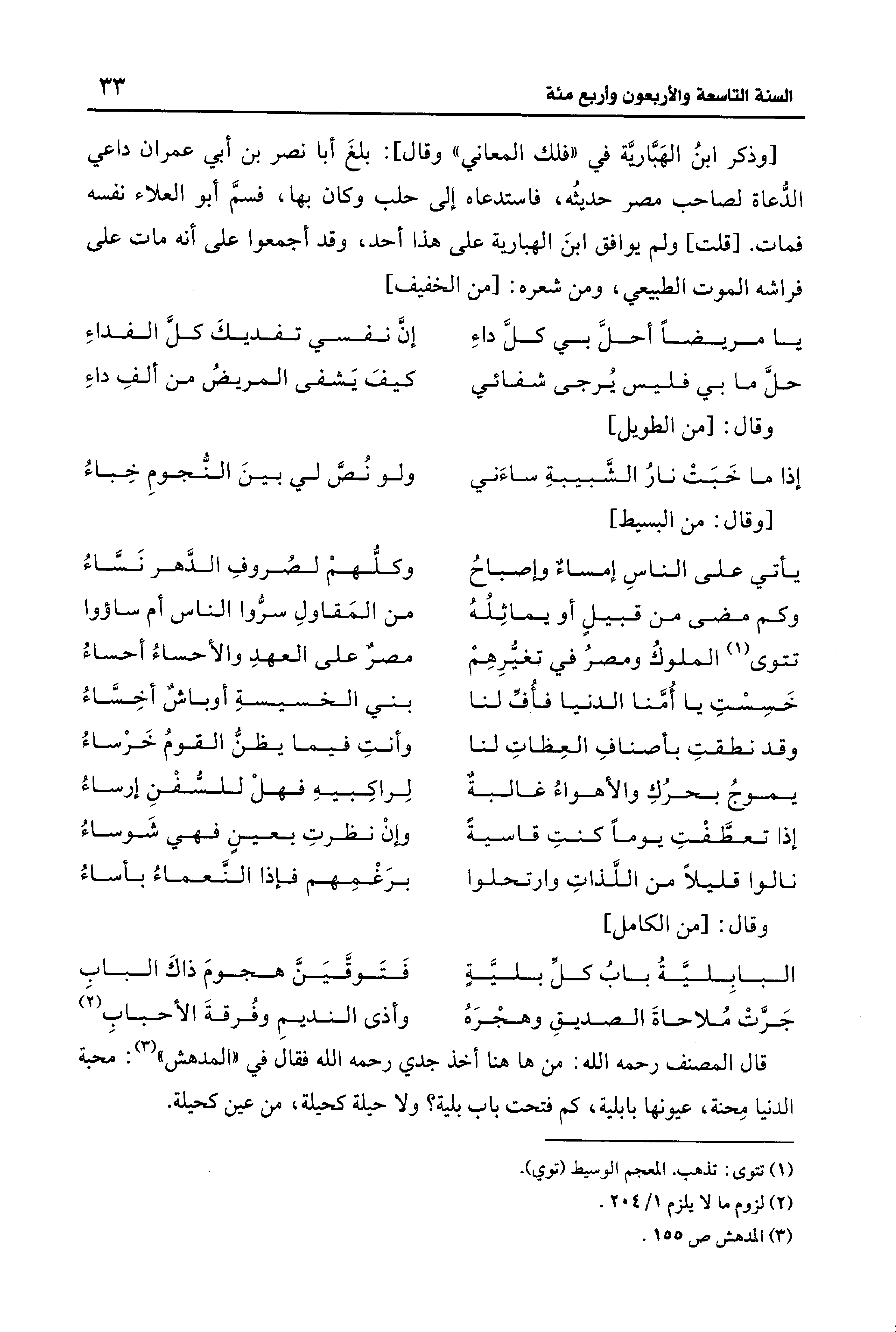 [وذكر ابنُ الهَبَّاريَّة في "فلك المعاني" وقال]: بلغَ أبا نصر بن أبي عمران داعي الدُّعاة لصاحب مصر حديثُه، فاستدعاه إلى حلب وكان بها، فسمَّ أبو العلاء نفسه فمات. [قلت] ولم يوافق ابنَ الهبارية على هذا أحد، وقد أجمعوا على أنه مات على فراشه الموت الطبيعي، ومن شعره: [من الخفيف]