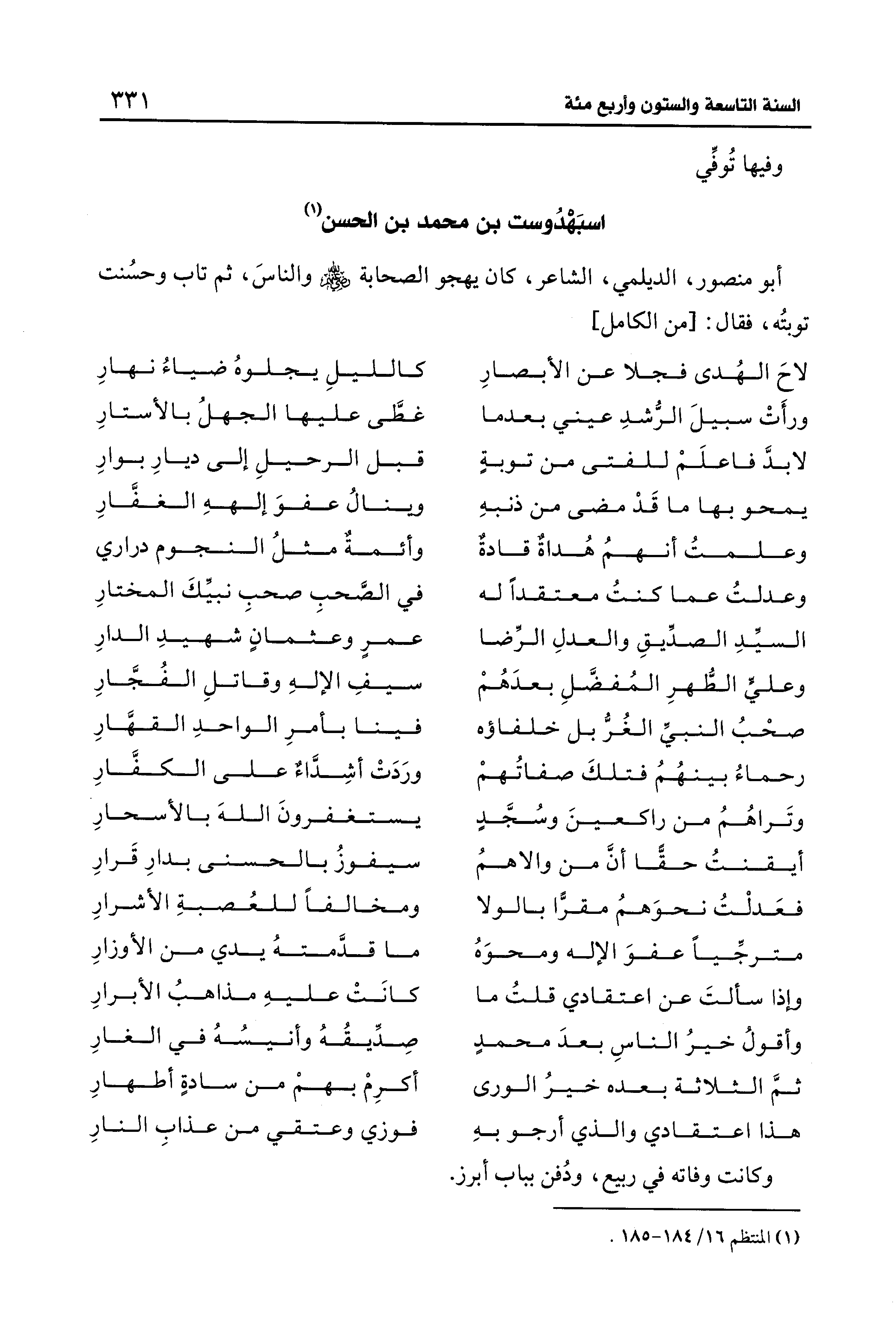 أبو منصور، الديلمي، الشاعر، كان يهجو الصحابة - رضي الله عنهم - والناسَ، ثم تاب وحسُنت توبتُه، فقال: [من الكامل]