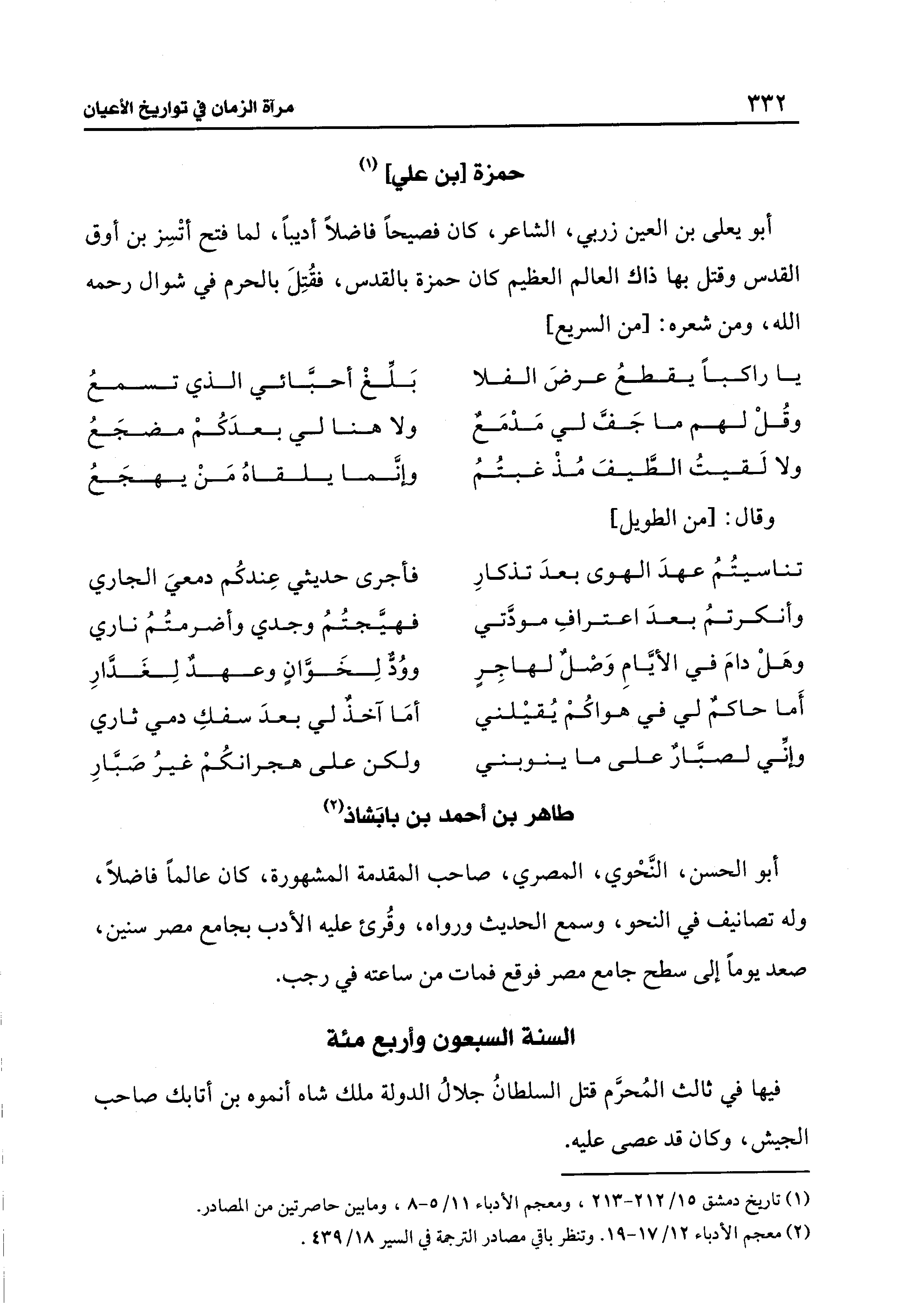 أبو يعلى بن العين زربي، الشاعر، كان فصيحًا فاضلًا أديبًا، لما فتح أتْسِز بن أوق القدس وقتل بها ذاك العالم العظيم كان حمزة بالقدس، فقُتِلَ بالحرم في شوال رحمه الله، ومن شعره: [من السريع]