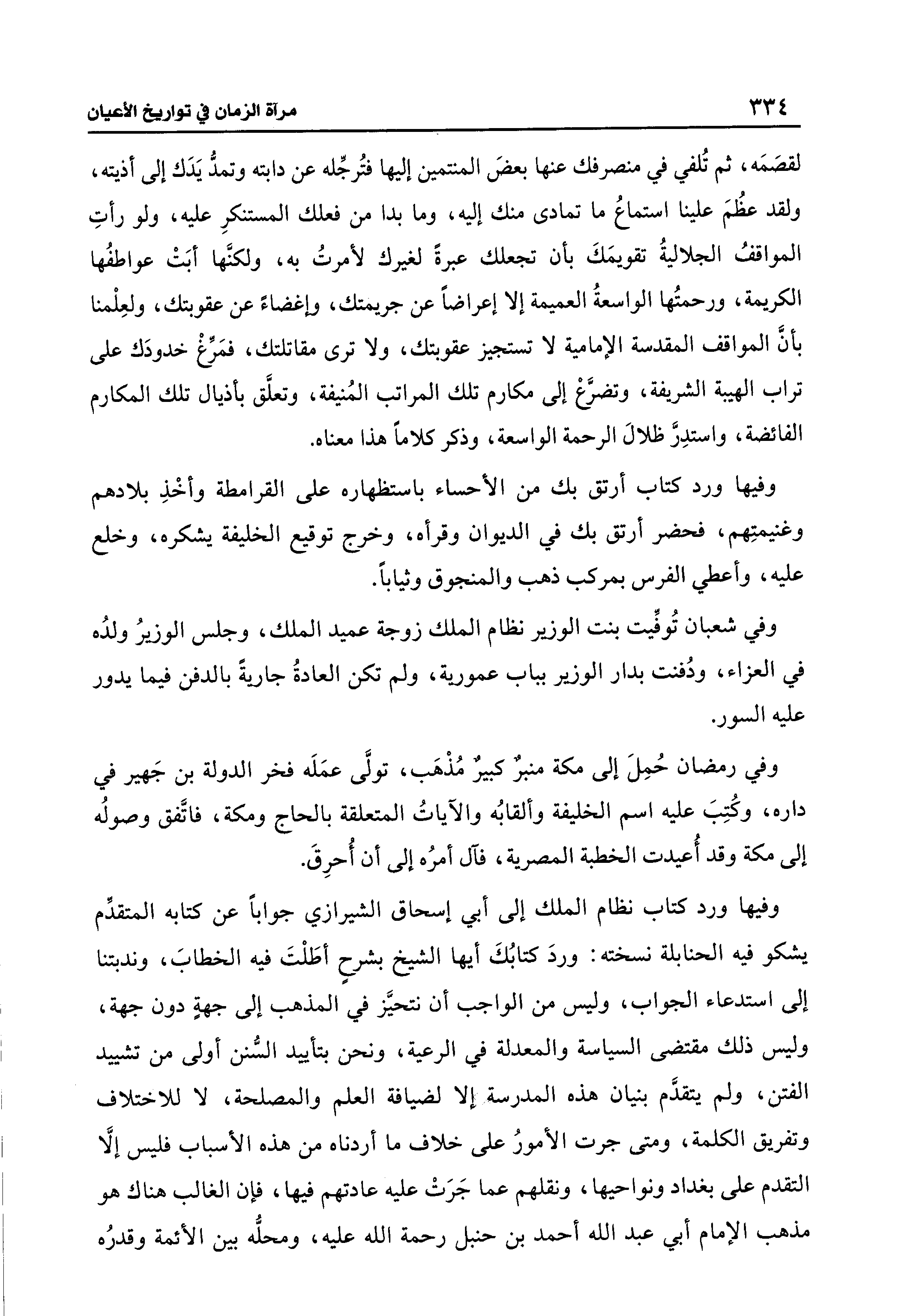 وفيها ورد كتاب نظام الملك إلى أبي إسحاق الشيرازي جوابًا عن كتابه المتقدِّم يشكو فيه الحنابلة نسخته: وردَ كتابُكَ أيها الشيخ بشرحٍ أطَلْتَ فيه الخطابَ، وندبتنا إلى استدعاء الجواب، وليس من الواجب أن نتحيَّز في المذهب إلى جهةٍ دون جهة، وليس ذلك مقتضى السياسة والمعدلة في الرعية، ونحن بتأييد السُّنن أولى من تشييد الفتن، ولم يتقدَّم بنيان هذه المدرسة إلا لضيافة العلم والمصلحة، لا للاختلاف وتفريق الكلمة، ومتى جرت الأمورُ على خلاف ما أردناه من هذه الأسباب فليس إلَّا التقدم على بغداد ونواحيها، ونقلهم عما جَرَتْ عليه عادتهم فيها، فإن الغالب هناك هو مذهب الإمام أبي عبد الله أحمد بن حنبل رحمة الله عليه، ومحلُّه بين الأئمة وقدرُه