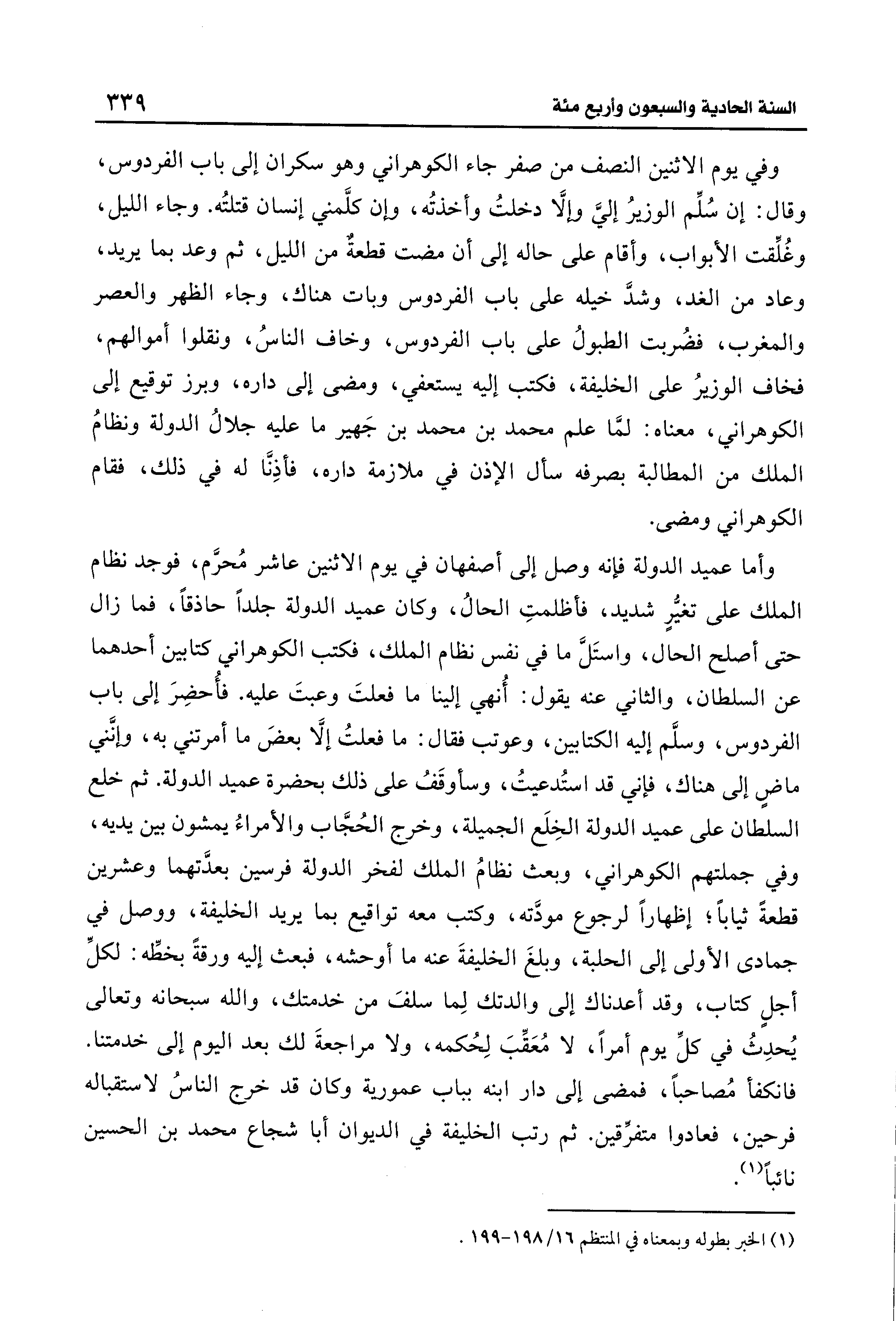 وأما عميد الدولة فإنه وصل إلى أصفهان في يوم الاثنين عاشر مُحرَّم، فوجد نظام الملك على تغيُّرٍ شديد، فأظلمتِ الحالُ، وكان عميد الدولة جلدًا حاذقًا، فما زال حتَّى أصلح الحال، واستَلَّ ما في نفس نظام الملك، فكتب الكوهراني كتابين أحدهما عن السلطان، والثاني عنه يقول: أُنهي إلينا ما فعلتَ وعبتَ عليه. فأُحضِرَ إلى باب الفردوس، وسلَّم إليه الكتابين، وعوتب فقال: ما فعلتُ إلَّا بعضَ ما أمرتني به، وإنَّني ماضٍ إلى هناك، فإني قد استُدعيتُ، وسأوقَفُ على ذلك بحضرة عميد الدولة. ثم خلع السلطان على عميد الدولة الخِلَع الجميلة، وخرج الحُجَّاب والأمراءُ يمشون بين يديه، وفي جملتهم الكوهراني، وبعث نظامُ الملك لفخر الدولة فرسين بعدَّتهما وعشرين قطعةً ثيابًا؛ إظهارًا لرجوع مودَّته، وكتب معه تواقيع بما يريد الخليفة، ووصل في جمادى الأولى إلى الحلبة، وبلغَ الخليفةَ عنه ما أوحشه، فبعث إليه ورقةً بخطِّه: لكلِّ أجلٍ كتاب، وقد أعدناك إلى والدتك لِما سلفَ من خدمتك، والله سبحانه وتعالى يُحدِثُ في كلِّ يوم أمرًا، لا مُعَقِّبَ لِحُكمه، ولا مراجعةَ لك بعد اليوم إلى خدمتنا. فانكفأ مُصاحبًا، فمضى إلى دار ابنه بباب عمورية وكان قد خرج الناسُ لاستقباله فرحين، فعادوا متفرِّقين. ثم رتب الخليفة في الديوان أبا شجاع محمد بن الحسين نائبًا (¬1).
