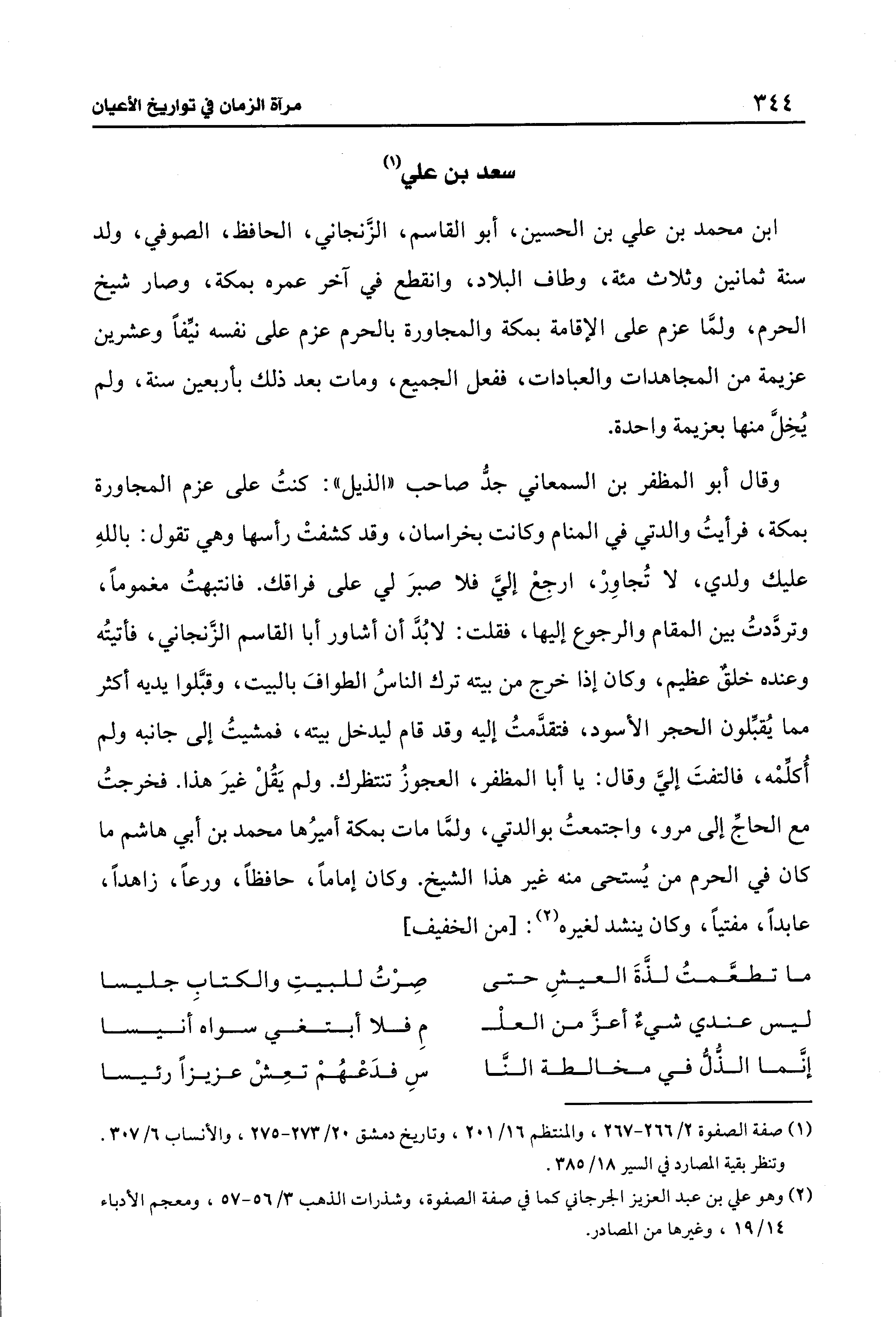 وقال أبو المظفر بن السمعاني جدُّ صاحب "الذيل": كُنْتُ على عزم المجاورة بمكة، فرأيتُ والدتي في المنام وكانت بخراسان، وقد كشفتْ رأسها وهي تقول: باللهِ عليك ولدي، لا تُجاوز، ارجِعْ إليَّ فلا صبرَ لي على فراقك. فانتبهتُ مغمومًا، وتردَّدتُ بين المقام والرجوع إليها، فقلت: لابُدَّ أن أشاور أبا القاسم الزَّنجاني، فأتيتُه وعنده خلقٌ عظيم، وكان إذا خرج من بيته ترك الناسُ الطوافَ بالبيت، وقبَّلوا يديه أكثر مما يُقبِّلون الحجر الأسود، فتقدَّمتُ إليه وقد قام ليدخل بيته، فمشيتُ إلى جانبه ولم أُكلِّمْه، فالتفتَ إليَّ وقال: يا أبا المظفر، العجوزُ تنتظرك. ولم يَقُلْ غيرَ هذا. فخرجتُ مع الحاجِّ إلى مرو، واجتمعتُ بوالدتي، ولمَّا مات بمكة أميرُها محمد بن أبي هاشم ما كان في الحرم من يُستحى منه غير هذا الشيخ. وكان إمامًا، حافظًا، ورعًا، زاهدًا، عابدًا، مفتيًا، وكان ينشد لغيره (¬2): [من الخفيف]