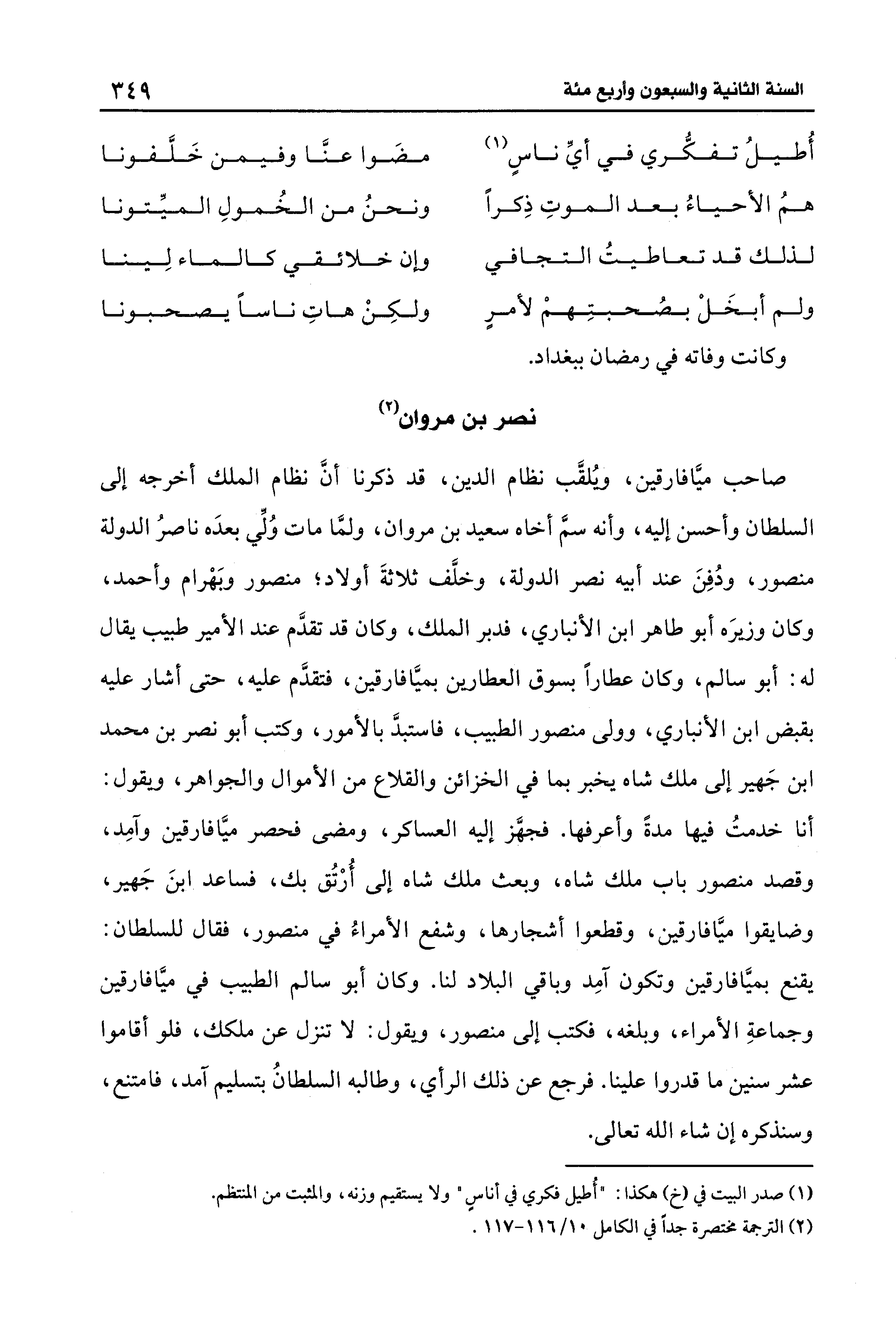 صاحب ميَّافارقين، ويُلقَّب نظام الدين، قد ذكرنا أنَّ نظام الملك أخرجه إلى السلطان وأحسن إليه، وأنه سمَّ أخاه سعيد بن مروان، ولمَّا مات وُلِّي بعدَه ناصرُ الدولة منصور، ودُفِنَ عند أبيه نصر الدولة، وخلَّف ثلاثةَ أولاد؛ منصور وبَهْرام وأحمد، وكان وزيرَه أبو طاهر بن الأنباري، فدبر الملك، وكان قد تقدَّم عند الأمير طبيب يقال له: أبو سالم، وكان عطارًا بسوق العطارين بميَّافارقين، فتقدَّم عليه، حتَّى أشار عليه بقبض ابن الأنباري، وولى منصور الطبيب، فاستبدَّ بالأمور، وكتب أبو نصر بن محمد بن جَهير إلى ملك شاه يخبر بما في الخزائن والقلاع من الأموال والجواهر، ويقول: أنا خدمتُ فيها مدةً وأعرفها. فجهَّز إليه العساكر، ومضى فحصر ميَّافارقين وآمِد، وقصد منصور باب ملك شاه، وبعث ملك شاه إلى أُرْتُق بك، فساعد ابنَ جَهير، وضايقوا ميَّافارقين، وقطعوا أشجارها، وشفع الأمراءُ في منصور، فقال للسلطان: يقنع بميَّافارقين وتكون آمِد وباقي البلاد لنا. وكان أبو سالم الطبيب في ميَّافارقين وجماعةِ الأمراء، وبلغه، فكتب إلى منصور، ويقول: لا تنزل عن ملكك، فلو أقاموا عشر سنين ما قدروا علينا. فرجع عن ذلك الرأي، وطالبه السلطانُ بتسليم آمد، فامتنع، وسنذكره إن شاء الله تعالى.