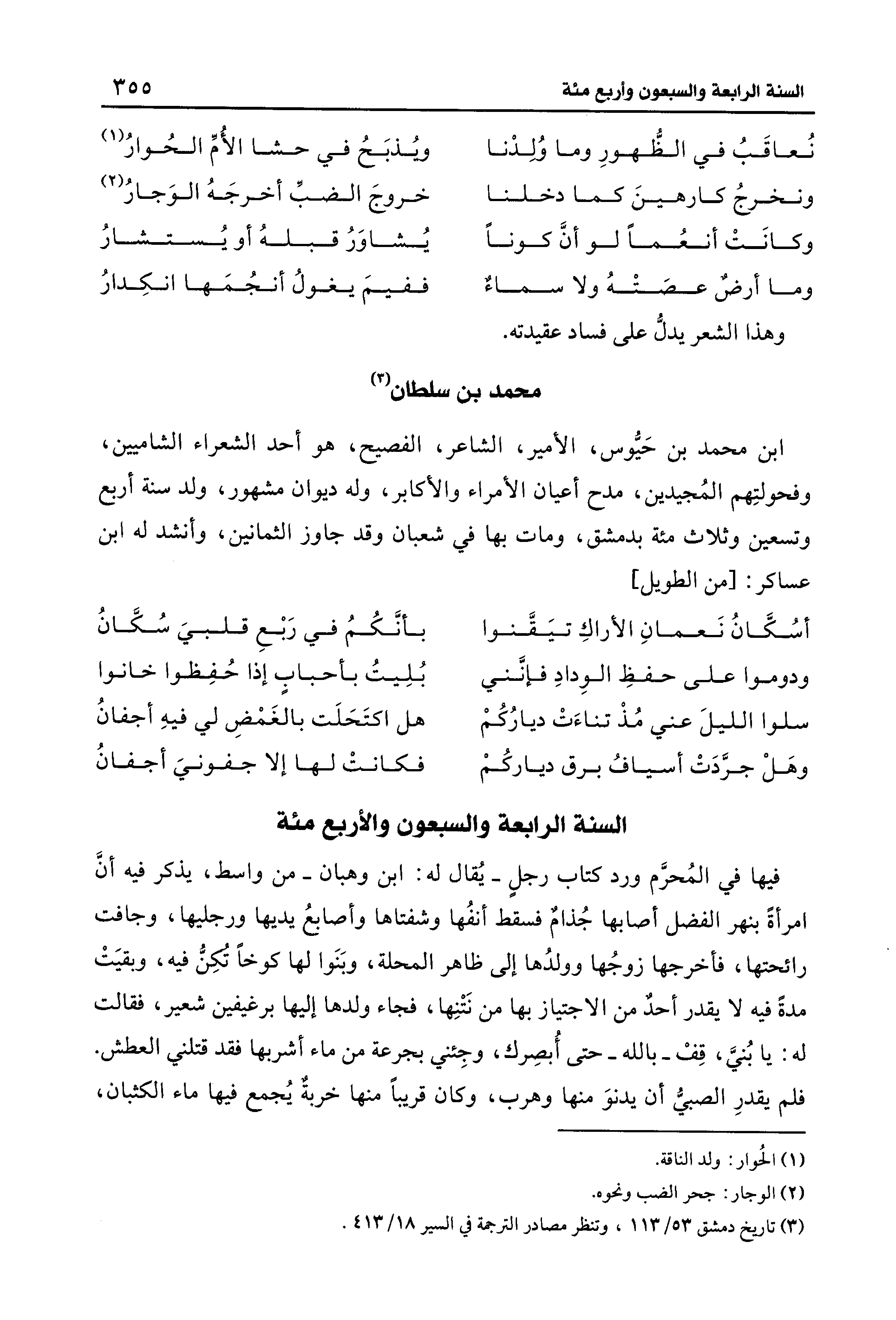 فيها في المُحرَّم ورد كتاب رجلٍ -يُقال له: ابن وهبان- من واسط، يذكر فيه أنَّ امرأةً بنهر الفضل أصابها جُذامٌ فسقط أنفُها وشفتاها وأصابعُ يديها ورجليها، وجافت رائحتها، فأخرجها زوجُها وولدُها إلى ظاهر المحلة، وبَنَوا لها كوخًا تَكِنُّ فيه، وبقيَتْ مدةً فيه لا يقدر أحدٌ من الاجتياز بها من نَتْنِها، فجاء ولدها إليها برغيفين شعير، فقالت له: يا بُنيَّ، قِفْ - بالله - حتَّى أُبصِرك، وجِئني بجرعة من ماء أشربها فقد قتلني العطش. فلم يقدرِ الصبيُّ أن يدنوَ منها وهرب، وكان قريبًا منها خربةٌ يُجمع فيها ماء الكثبان،